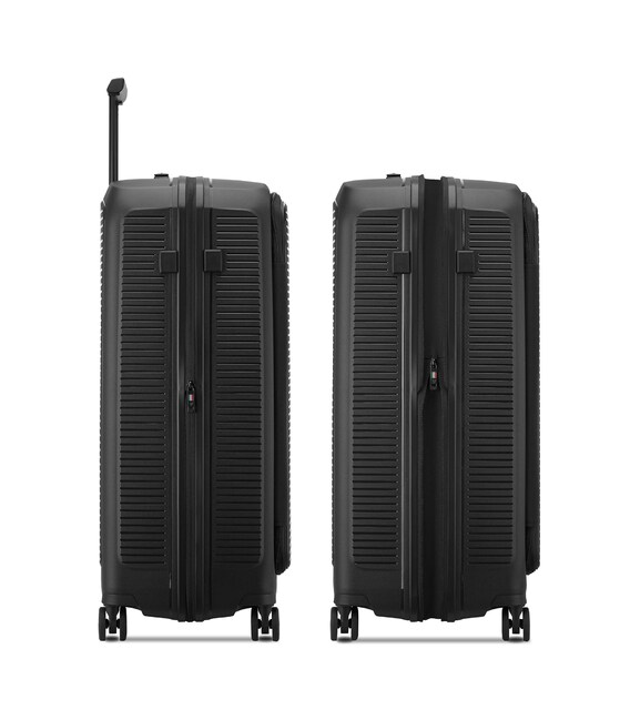 Валіза виготовлена з поліпропілену на 100% переробленого матеріалу, який пропонує: максимальну ударостійкість, надзвичайну міцність, оптимальну легкість, термостійкість. Оснащена 4 спареними і маневреними колесами. Для зручності переміщення передбачена еластична, підйомна пластикова ручка на верхній та бічній панелях, а також телескопічна ручка. Безпека і збереження багажу забезпечує вбудований кодовий замок з системою TSA. Серед найцінніших особливостей – інноваційна система FLAT TOP: кришка, що відкривається на 90° замість центрального отвору. Дизайн розроблений для зменшення об'єму та полегшення доступу до вмісту.