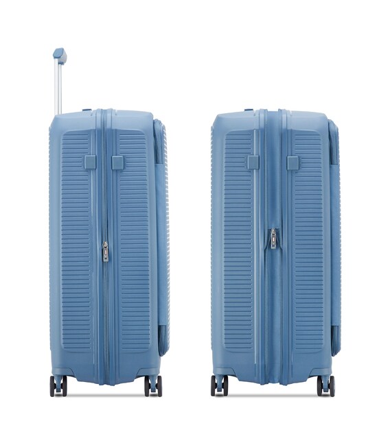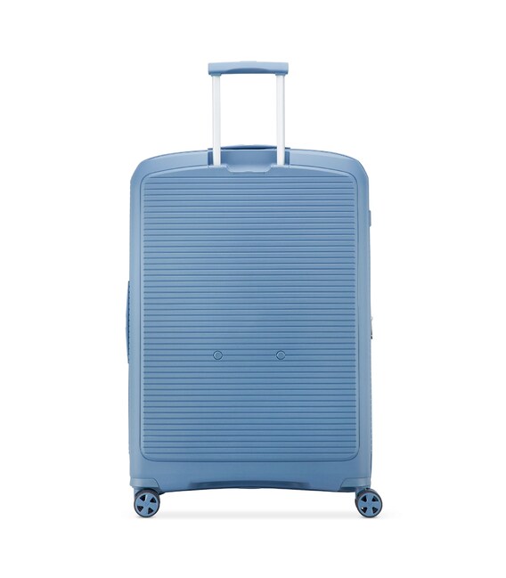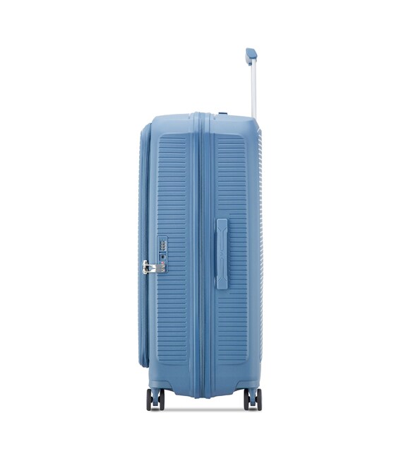 Валіза виготовлена з поліпропілену на 100% переробленого матеріалу, який пропонує: максимальну ударостійкість, надзвичайну міцність, оптимальну легкість, термостійкість. Оснащена 4 спареними і маневреними колесами. Для зручності переміщення передбачена еластична, підйомна пластикова ручка на верхній та бічній панелях, а також телескопічна ручка. Безпека і збереження багажу забезпечує вбудований кодовий замок з системою TSA. Серед найцінніших особливостей – інноваційна система FLAT TOP: кришка, що відкривається на 90° замість центрального отвору. Дизайн розроблений для зменшення об'єму та полегшення доступу до вмісту.