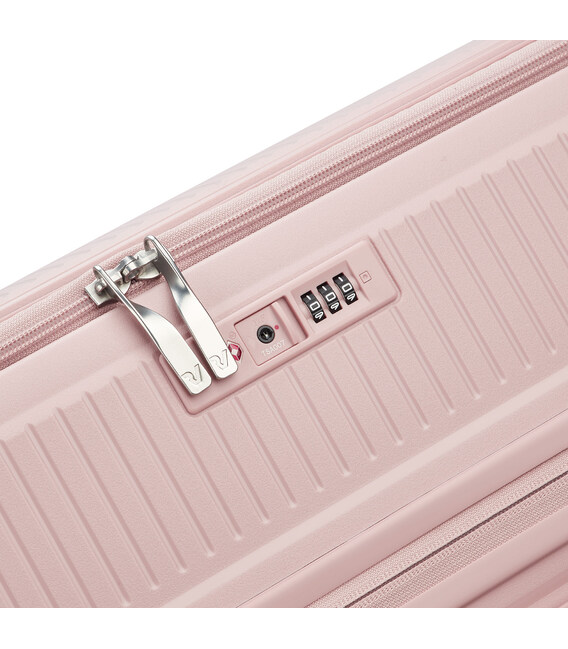 Валіза виготовлена з поліпропілену на 100% переробленого матеріалу, який пропонує: максимальну ударостійкість, надзвичайну міцність, оптимальну легкість, термостійкість. Оснащена 4 спареними і маневреними колесами. Для зручності переміщення передбачена еластична, підйомна пластикова ручка на верхній та бічній панелях, а також телескопічна ручка. Безпека і збереження багажу забезпечує вбудований кодовий замок з системою TSA. Серед найцінніших особливостей – інноваційна система FLAT TOP: кришка, що відкривається на 90° замість центрального отвору. Дизайн розроблений для зменшення об'єму та полегшення доступу до вмісту.