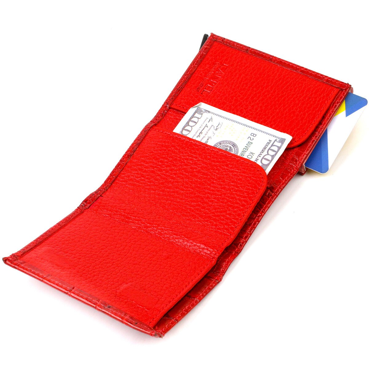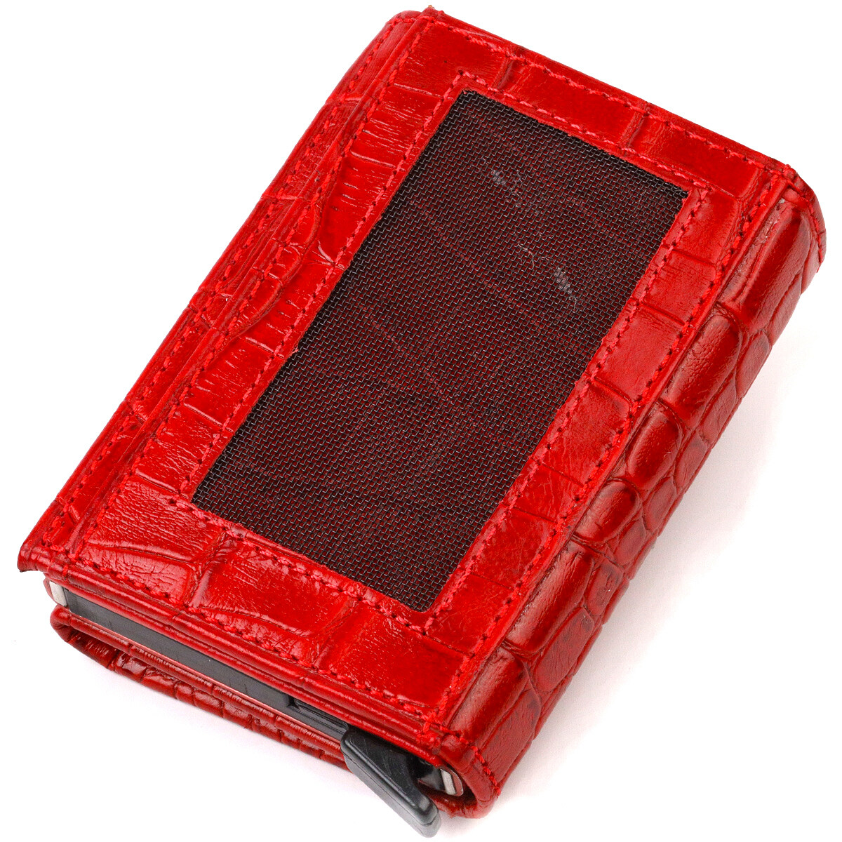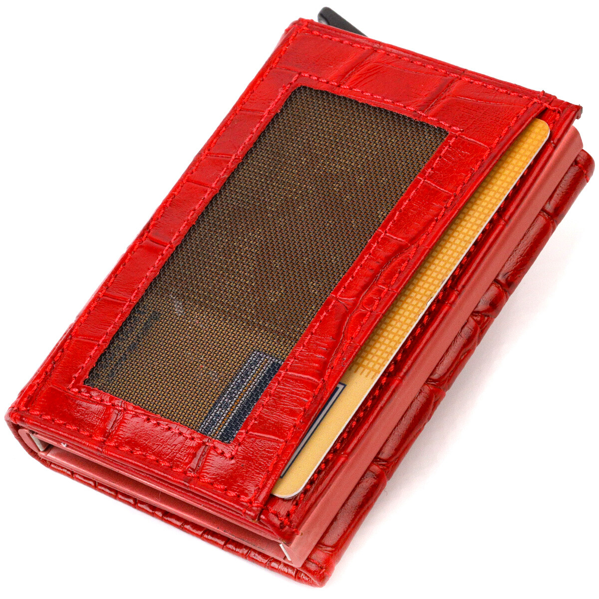 Чудовий картхолдер із натуральної шкіри, з тисненням під крокодила, призначений для зберігання банківських та дисконтних карток та невеликої кількості готівки. Має лаконічний дизайн, відмінно лягає в руку, поміщається в кишеню, а також будь-яку сумку. Шкіра м'яка, приємна на дотик. Механізм працює надійно та зручний у використанні; картки добре закріплені в аксесуарі. Відмінна ідея для подарунка близькій людині.