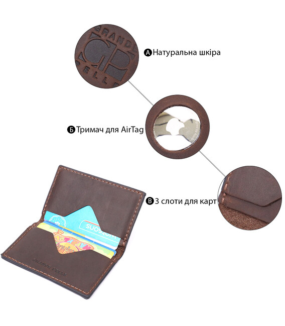 Оригінальний шкіряний картхолдер ручної роботи із натуральної висококласної вінтажної шкіри. На лицьовій стороні виріб має тиснений логотип виробника Grande Pelle. Аксесуар складається із трьох відділень під картки. Крім зручного функціоналу фішкою цього картхолдера є тримач для смарт трекера Apple AirTag, це сучасний пристрій, що визначає місцезнаходження речі, до якої він прикріплений. Завдяки компактним розмірам аксесуара він чудово поміщається в гаманець, кишеню чи сумку будь-якого розміру, що допоможе користувачам легко знайти втрачені чи забуті речі. Відмінний аксесуар для сучасної людини. Увага, смарт трекер Apple AirTag не входить у комплект з аксесуаром!
