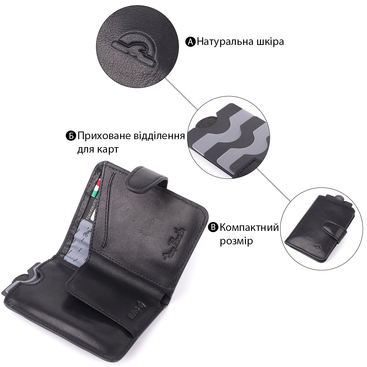 Компактне портмоне-кредитниця Tony Perotti поєднує в собі елегантний дизайн, функціональність та сучасний захист даних. Міцне шкіряне виконання та RFID-підкладка забезпечують надійність, а продумана організація внутрішнього простору дозволяє зручно зберігати купюри та карти. Фірмове тиснення підкреслює преміальний характер виробу та його приналежність до бренду.