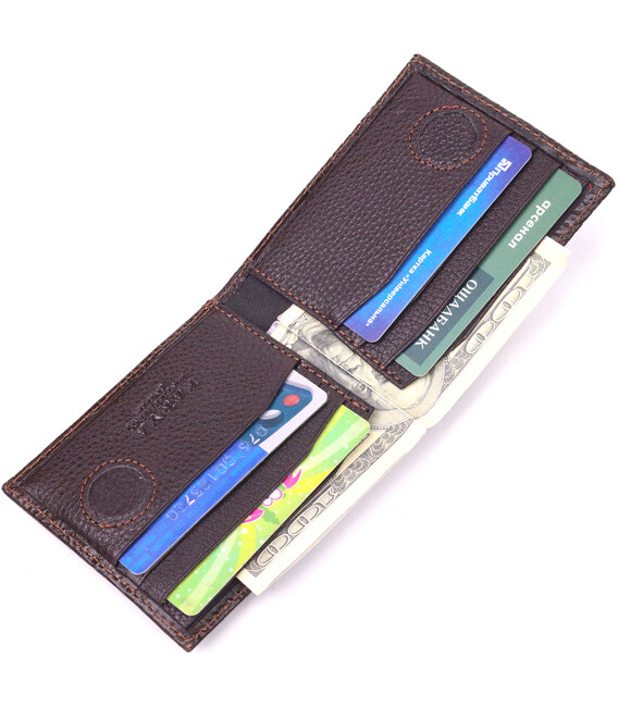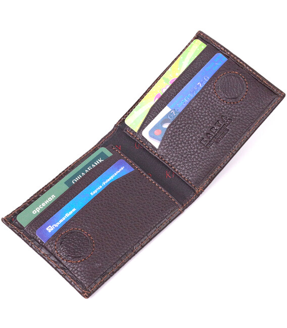 Чудовий чоловічий затиск із натуральної фактурної шкіри, з тисненням під крокодила. Затискач складається з двох куточків тримачів для купюр, шести осередків для кредитних карток, двох прилеглих кишень зовні та монетниці, що закривається клапаном на кнопку. Виріб закривається у два складання на магніт. Аксесуар упакований у фірмову коробочку. Вироби з натуральної шкіри завжди будуть чудовим подарунком для близької людини.