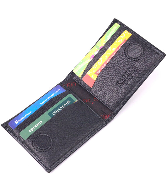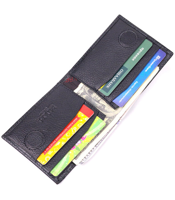Красивий чоловічий затиск із натуральної фактурної шкіри, з тисненням під крокодила. Затискач складається з двох куточків тримачів для купюр, шести осередків для кредитних карток, двох прилеглих кишень зовні та монетниці, що закривається клапаном на кнопку. Виріб закривається у два складання на магніт. Аксесуар упакований у фірмову коробочку. Вироби з натуральної шкіри завжди будуть чудовим подарунком для близької людини.