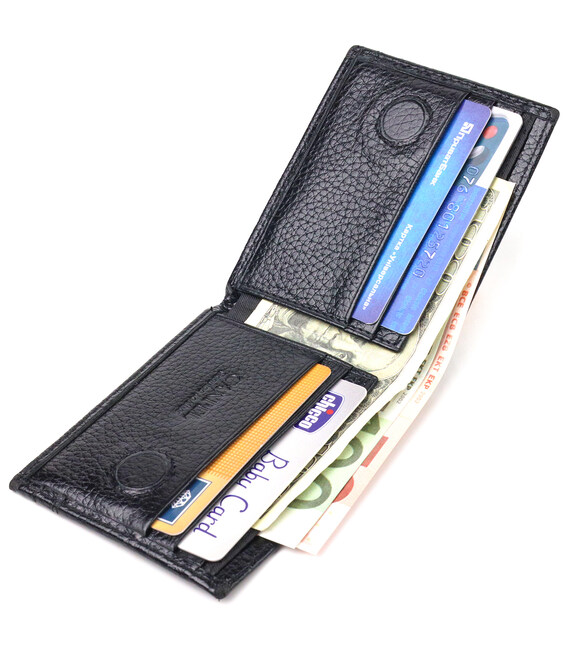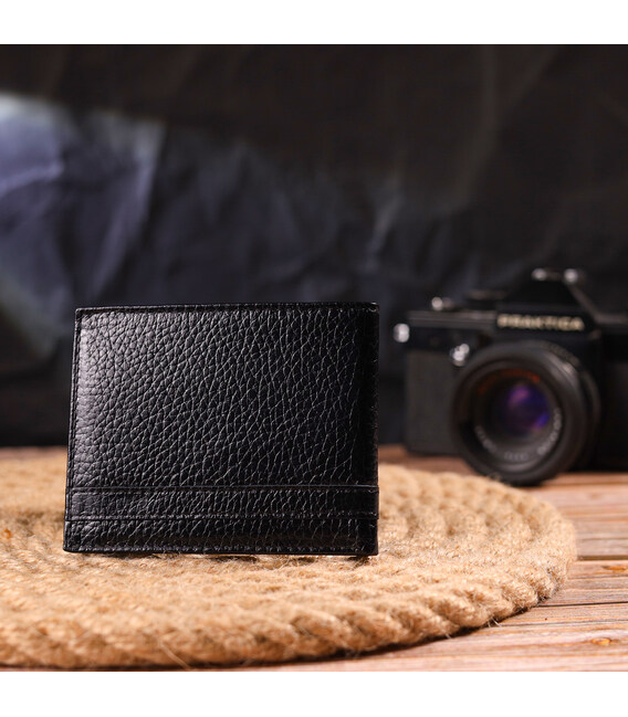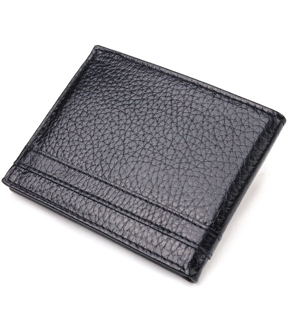 Практичний затискач для купюр, із натуральної зернистої шкіри, в класичному чорному кольорі. Аксесуар має одне основне відділення, в якому розміщуються купюри всіх номіналів, два куточки – власники для купюр, чотири осередки для кредитних карток. Закривається аксесуар на магніт. Колір фурнітури – срібло. Запакований затискач у картонну коробку.