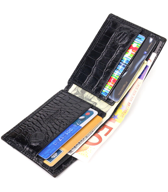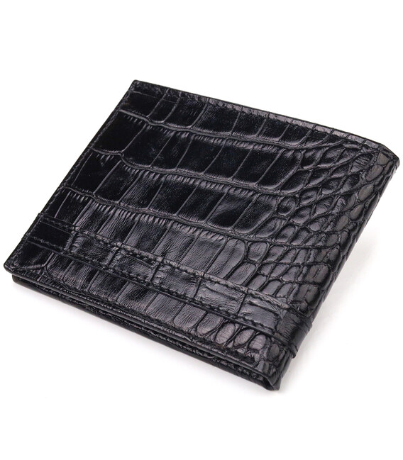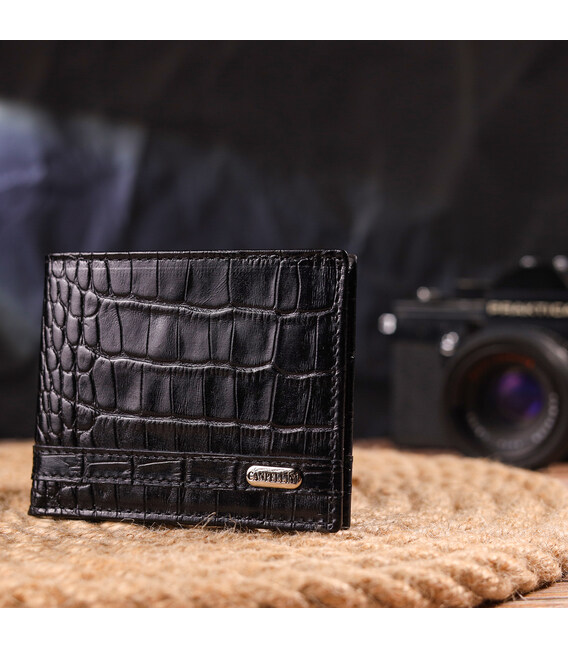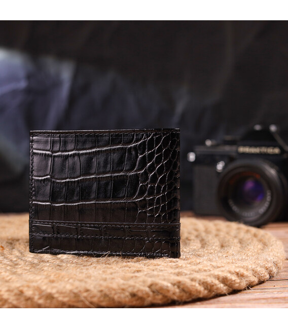 Зручний затискач для купюр з натуральної фактурної шкіри з тисненням під крокодила. Аксесуар має одне основне відділення, в якому розміщуються купюри всіх номіналів, два куточки – власники для купюр, чотири осередки для кредитних карток. Закривається аксесуар у дві складання на магніт. Колір фурнітури – срібло. Запакований затискач у картонну коробку.
