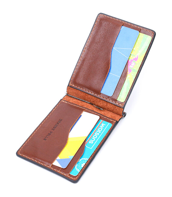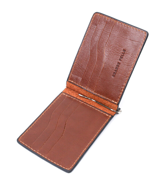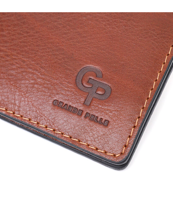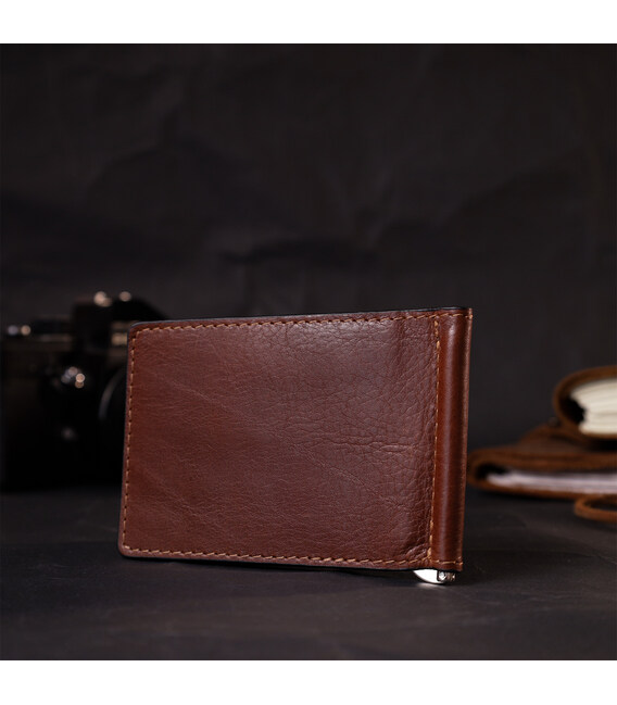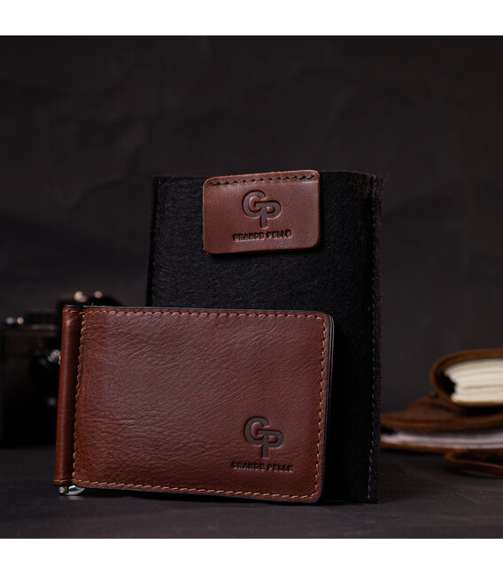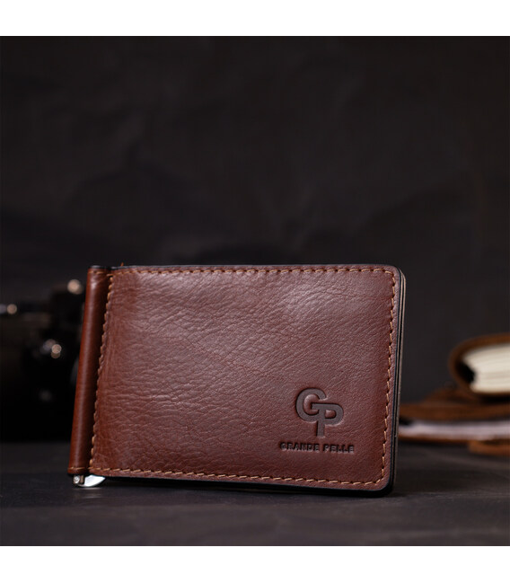 Стильний шкіряний затискач ручної роботи із натуральної висококласної шкіри. На лицьовій стороні виріб має тиснений логотип виробника Grande Pelle. Аксесуар складається з шести відділень під картки та металевого якісного затиску. Відмінний аксесуар для сучасної людини.