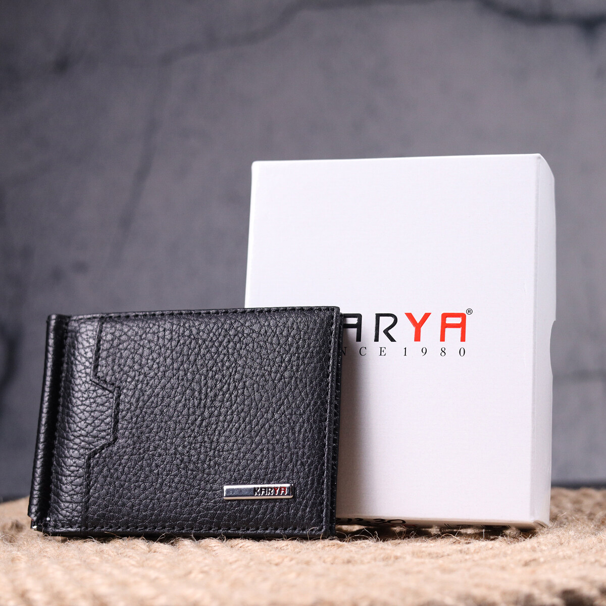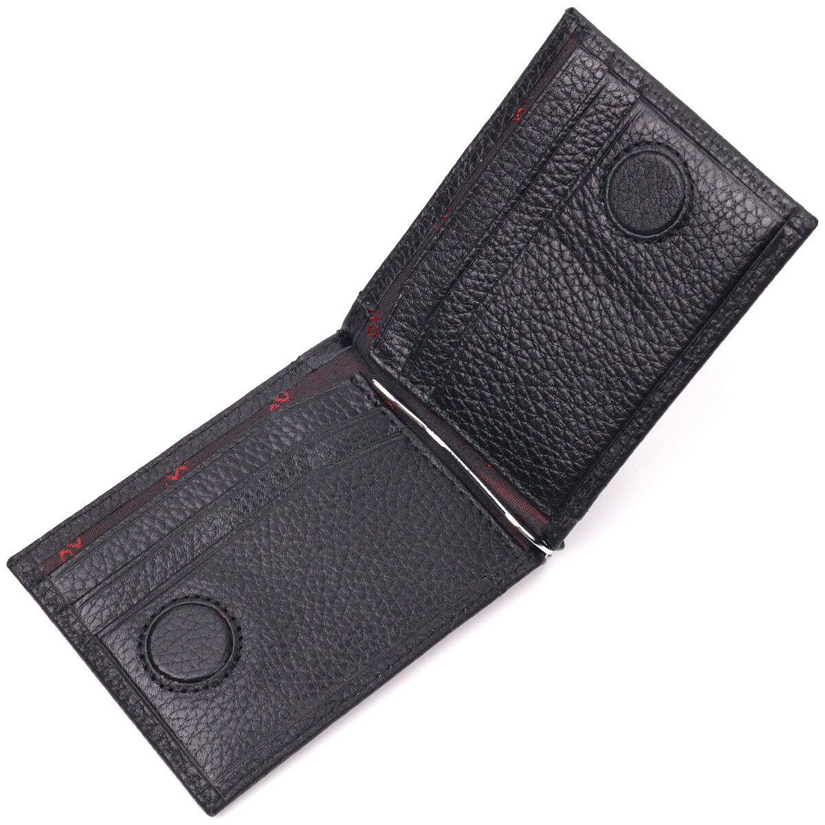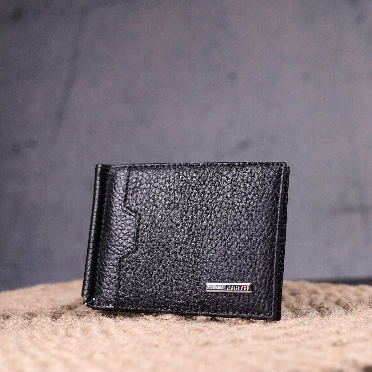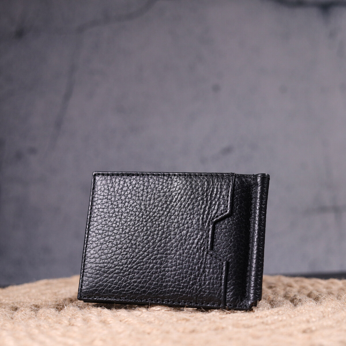Зручний чоловічий затиск із натуральної зернистої шкіри, в класичному чорному кольорі. Виріб закривається у два складання на магніт. На лицьовій стороні у вигляді декору розташований логотип виробника, а також для декору краю затискача прошиті чорною ниткою. Аксесуар упакований у фірмову коробочку. Вироби з натуральної шкіри завжди будуть чудовим подарунком для близької людини.