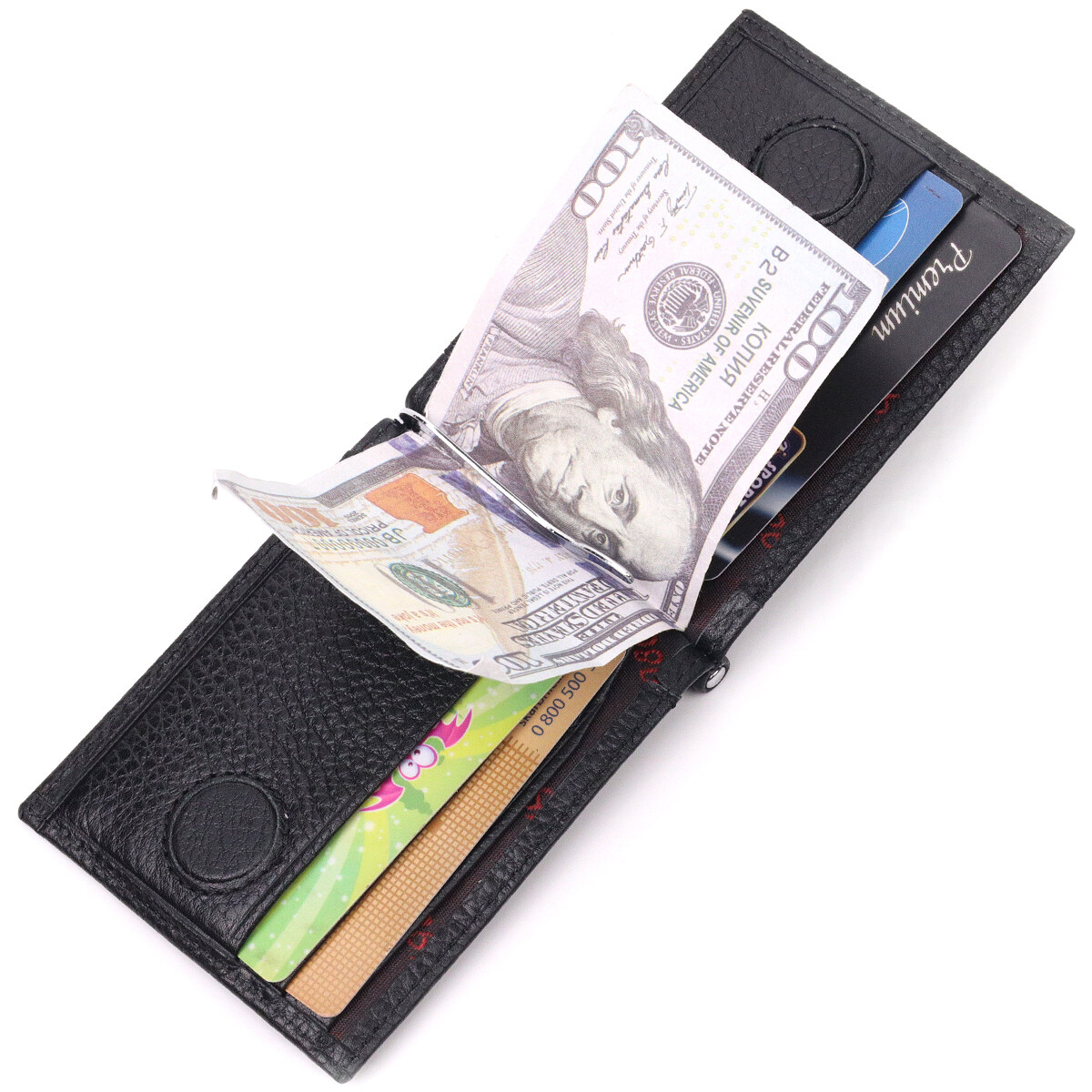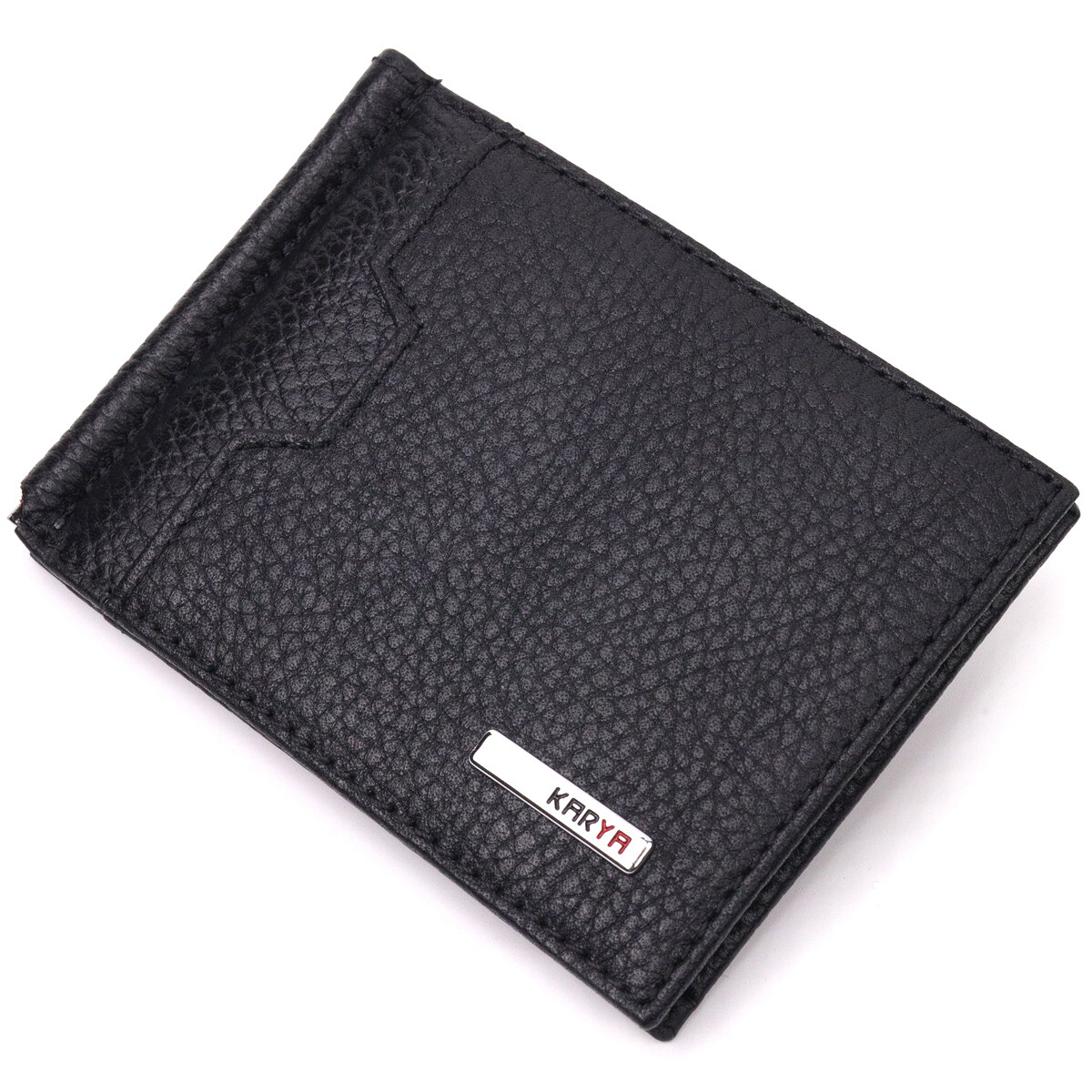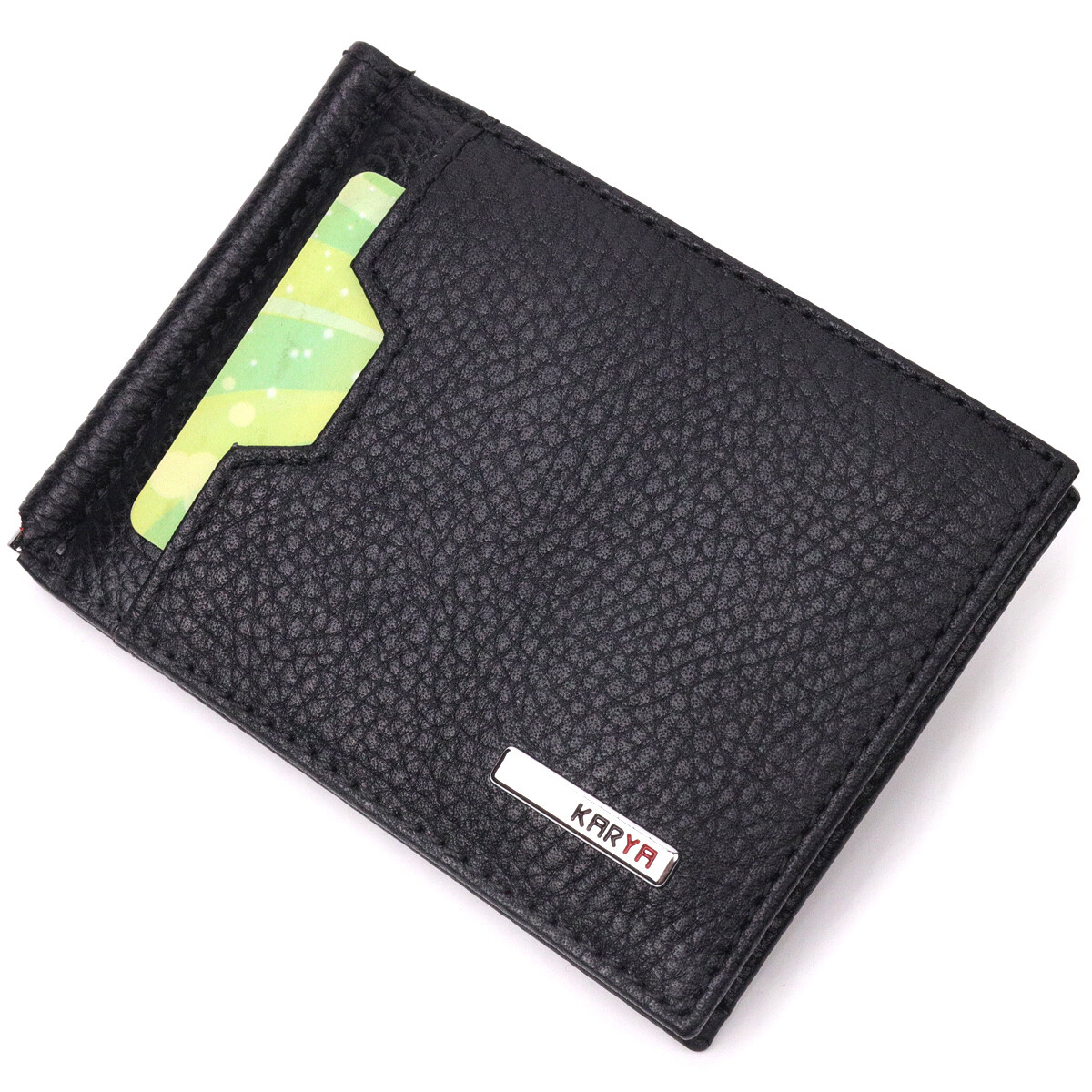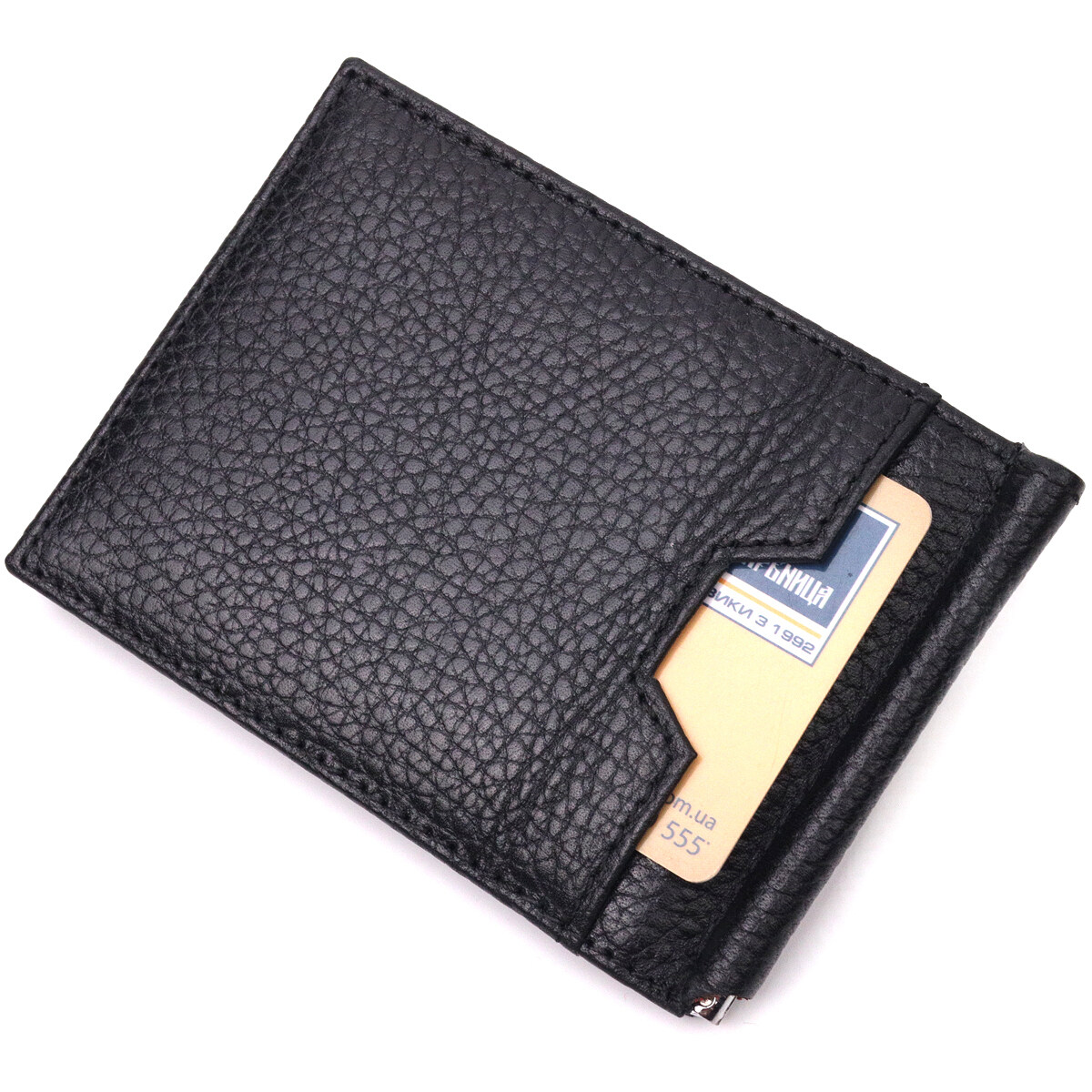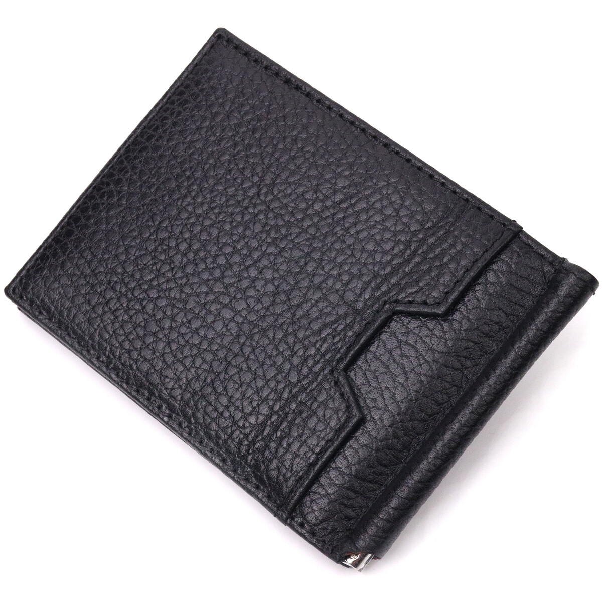 Зручний чоловічий затиск із натуральної зернистої шкіри, в класичному чорному кольорі. Виріб закривається у два складання на магніт. На лицьовій стороні у вигляді декору розташований логотип виробника, а також для декору краю затискача прошиті чорною ниткою. Аксесуар упакований у фірмову коробочку. Вироби з натуральної шкіри завжди будуть чудовим подарунком для близької людини.