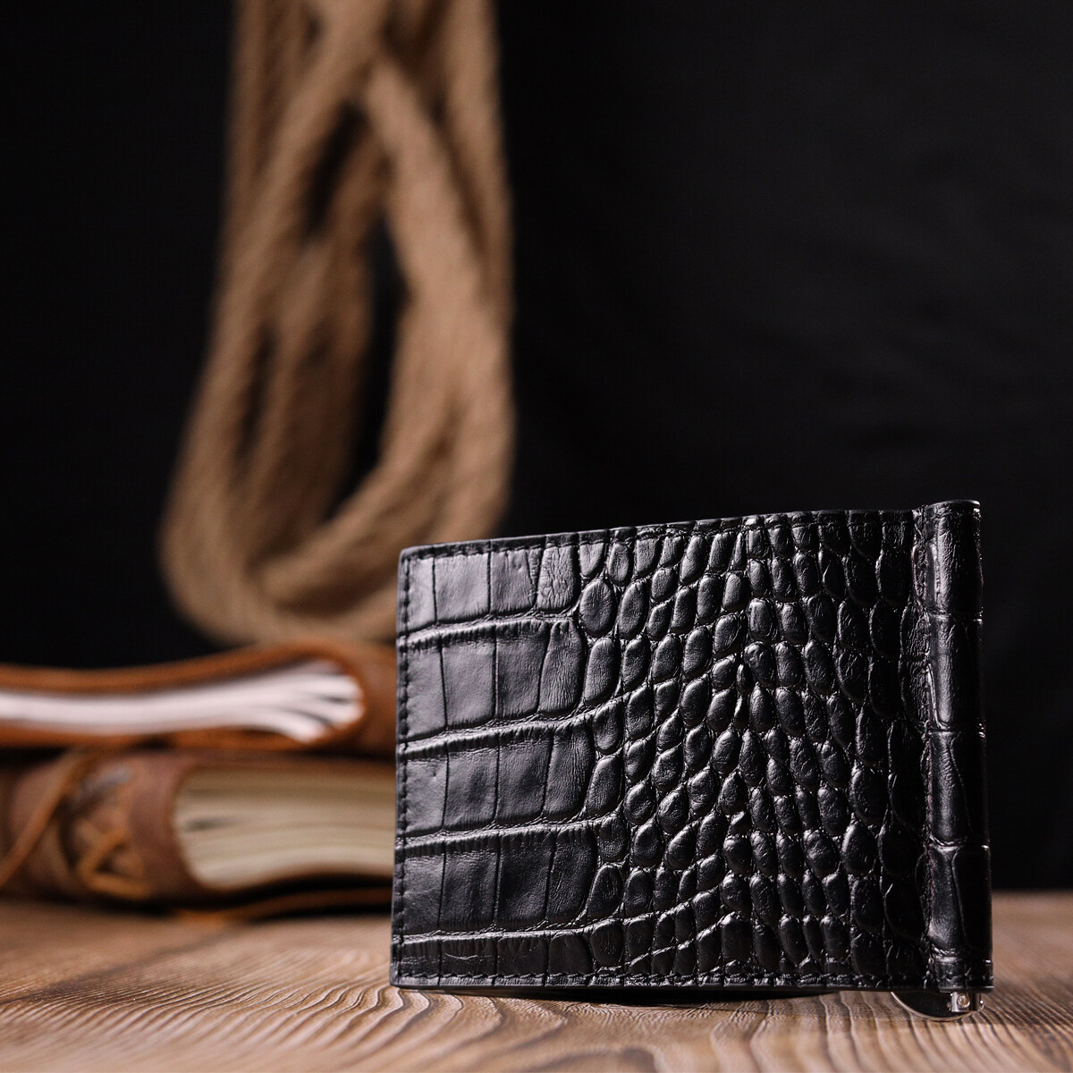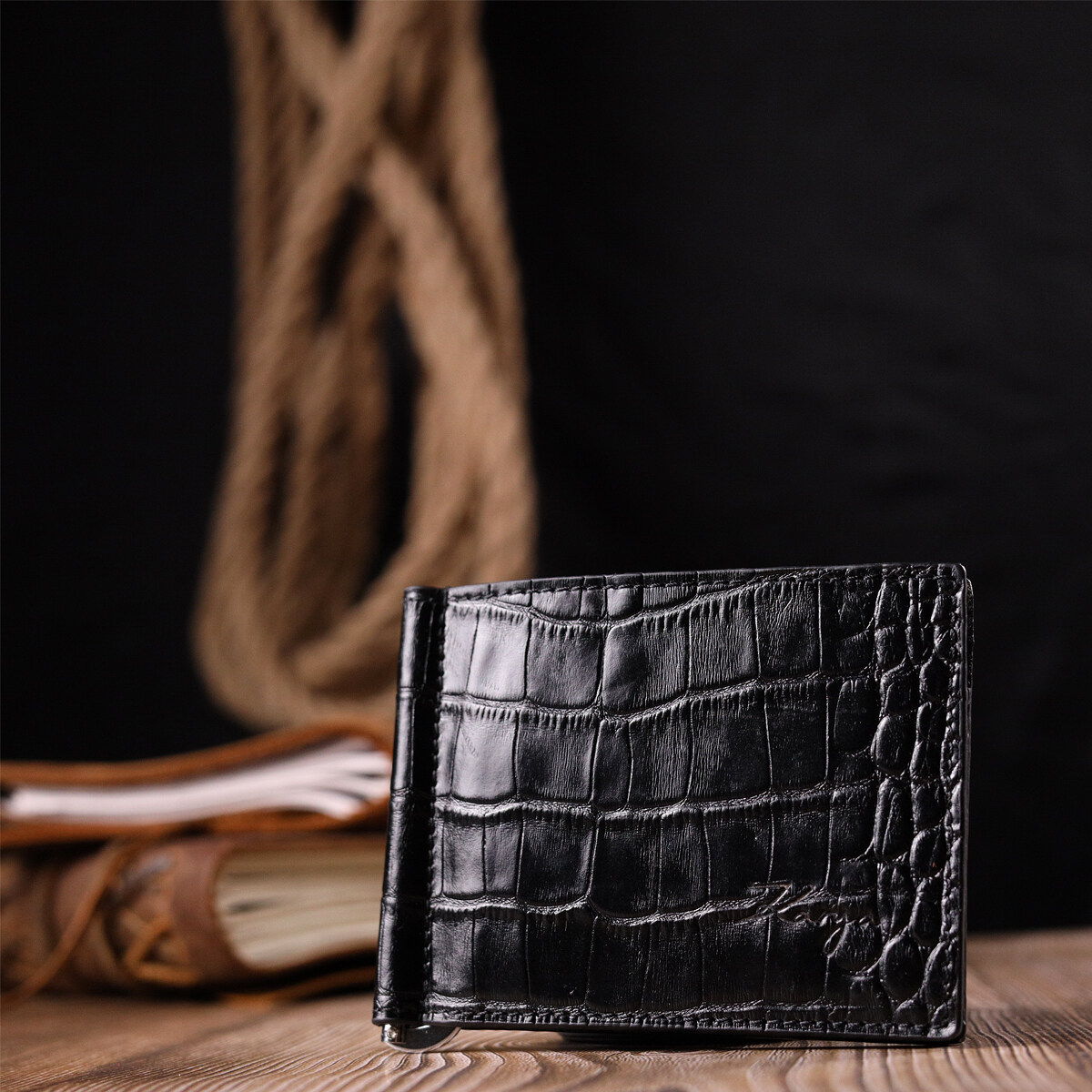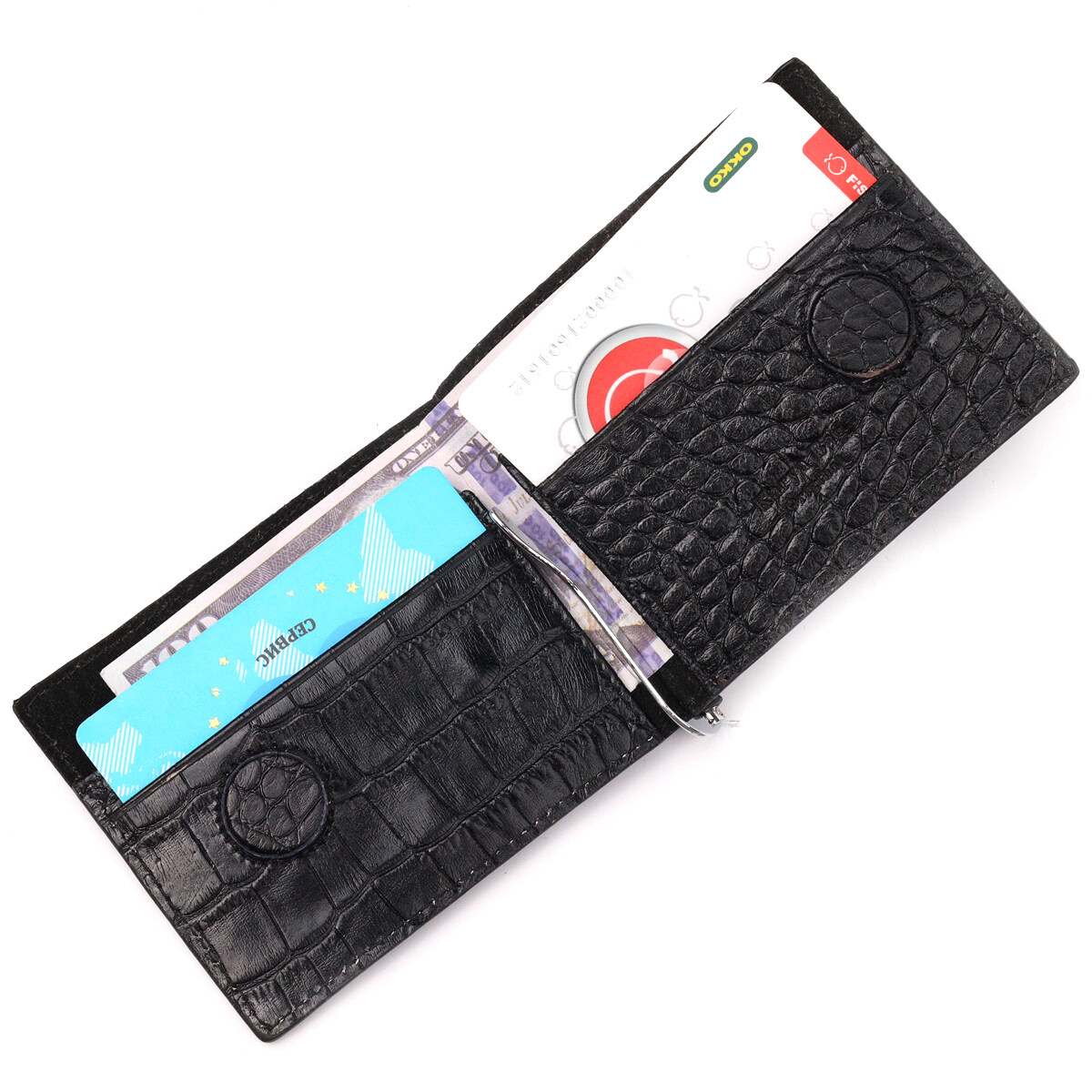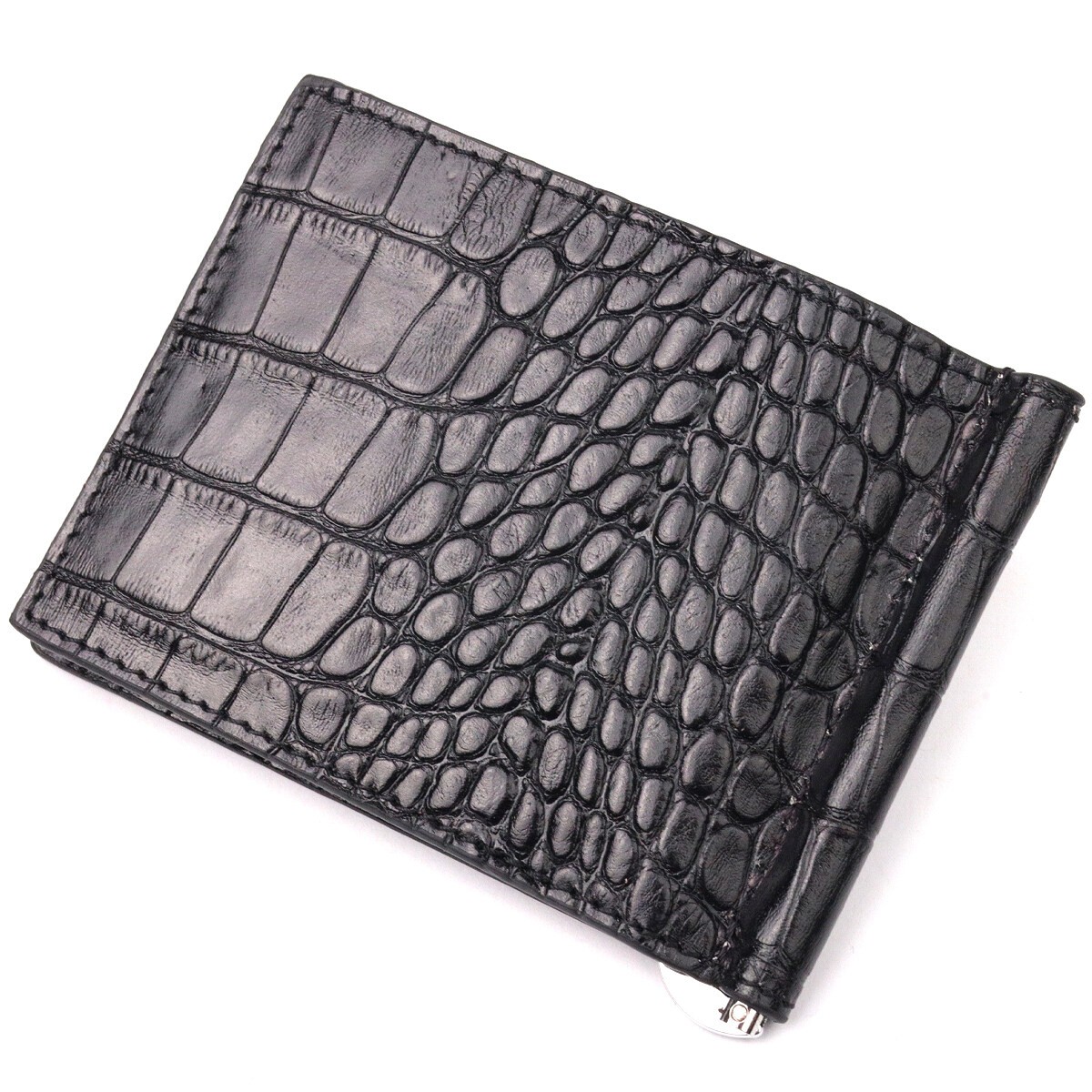 Зручний чоловічий затискач, з натуральної фактурної шкіри, з тисненням під крокодила. Виріб дуже компактний, але при цьому купюри всіх номіналів поміщаються відмінно. Необхідний шкіряний аксесуар, який чудово підкреслить стиль та статус свого власника. Аксесуар упакований у фірмову коробочку. Вироби з натуральної шкіри завжди будуть чудовим подарунком для близької людини.