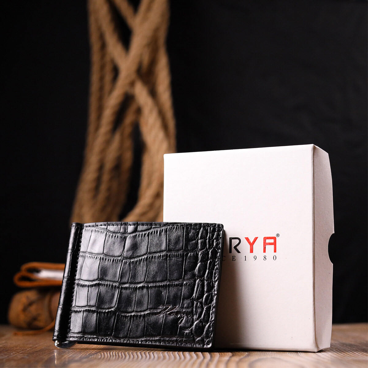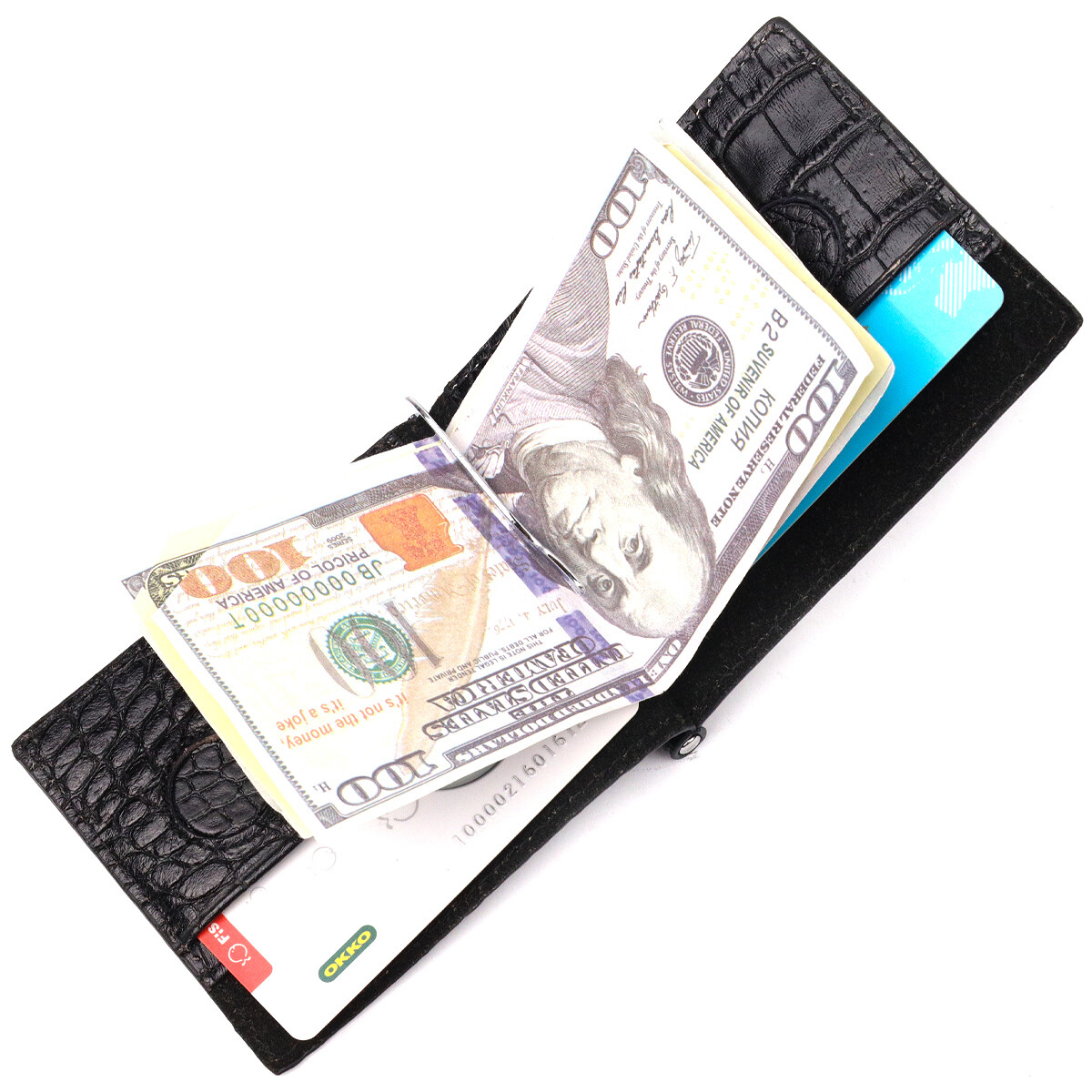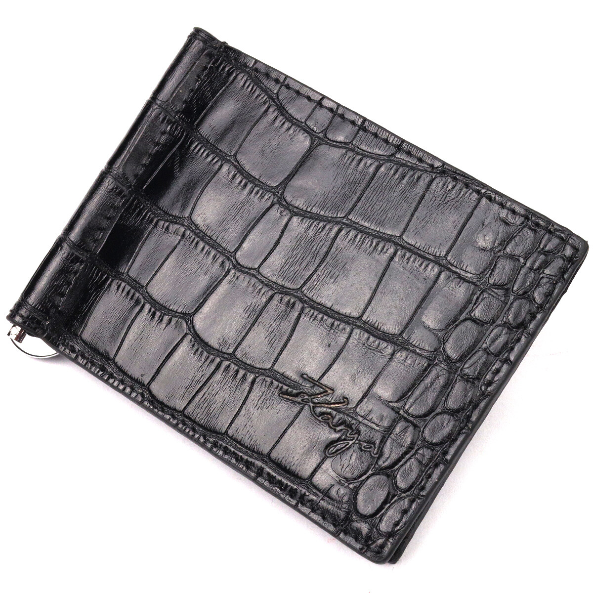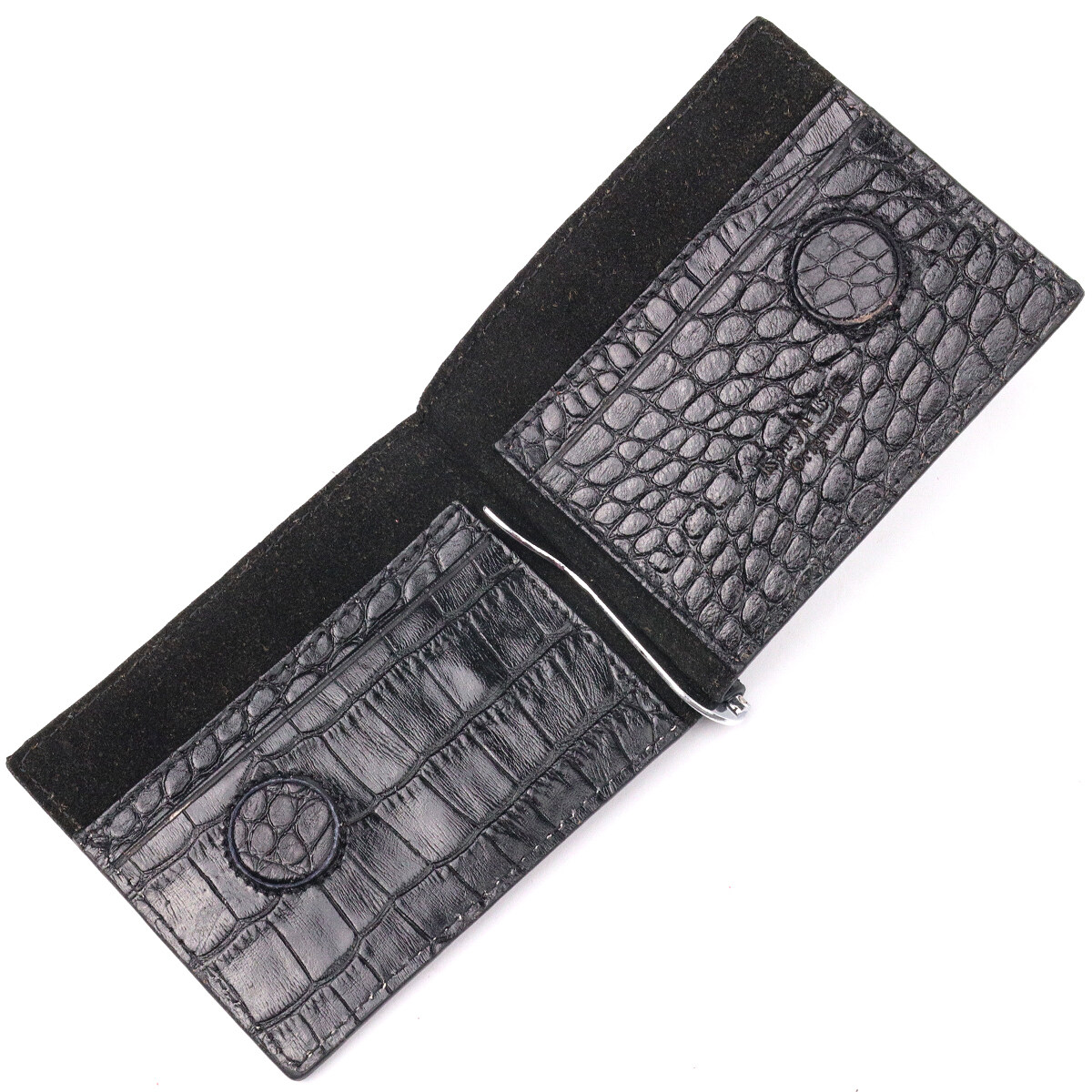 Зручний чоловічий затискач, з натуральної фактурної шкіри, з тисненням під крокодила. Виріб дуже компактний, але при цьому купюри всіх номіналів поміщаються відмінно. Необхідний шкіряний аксесуар, який чудово підкреслить стиль та статус свого власника. Аксесуар упакований у фірмову коробочку. Вироби з натуральної шкіри завжди будуть чудовим подарунком для близької людини.