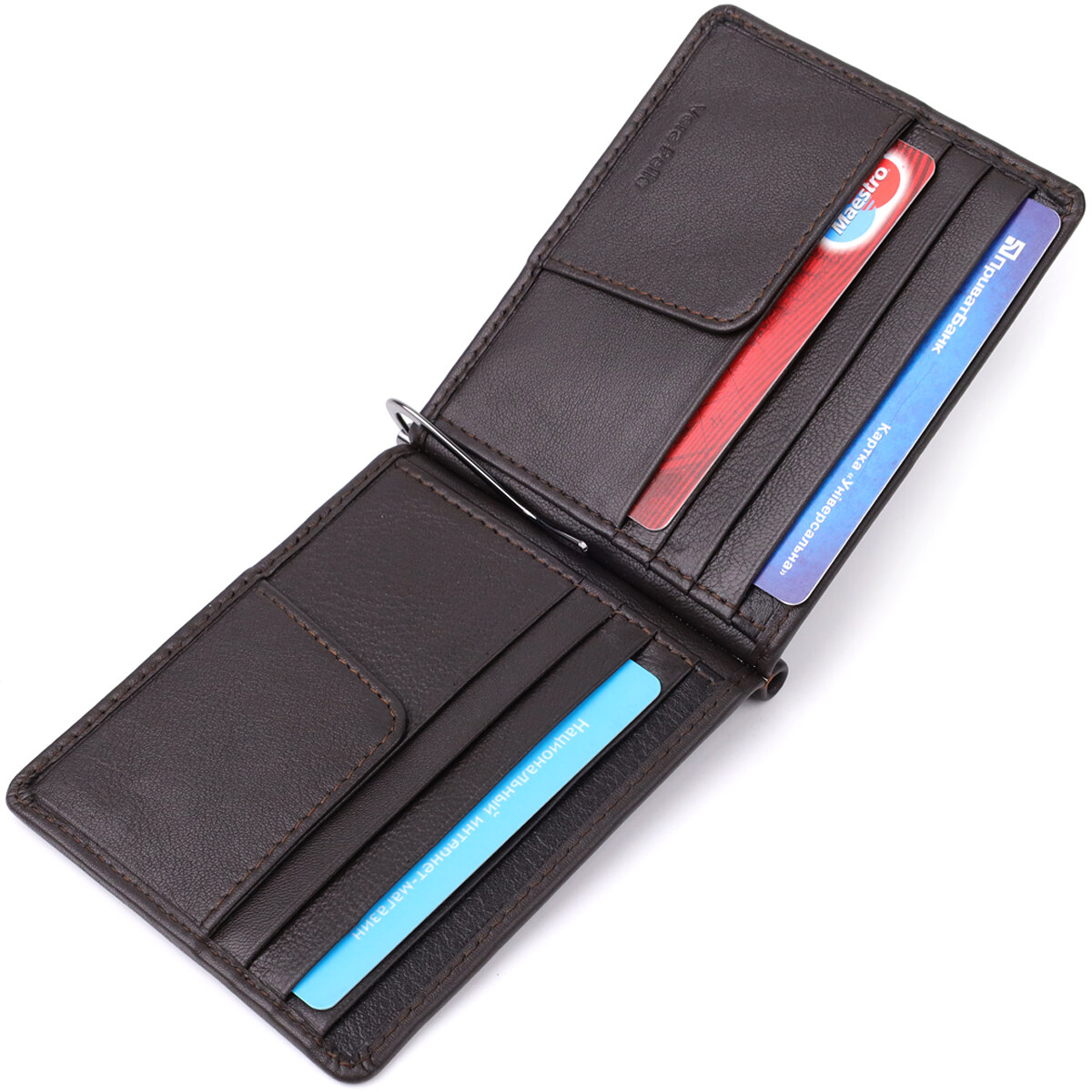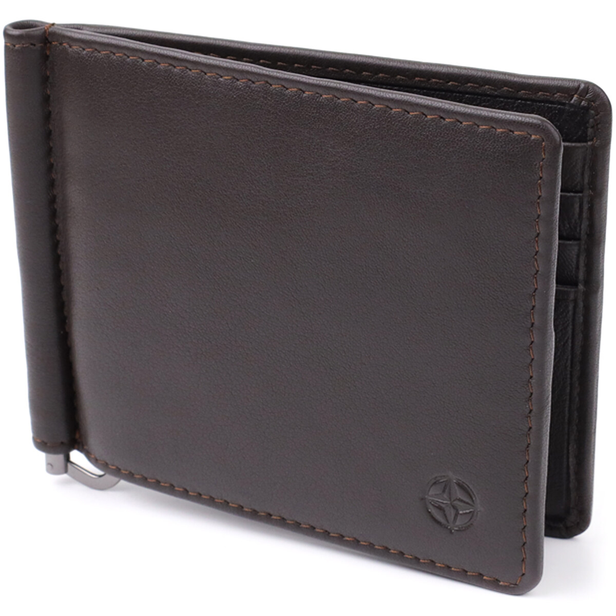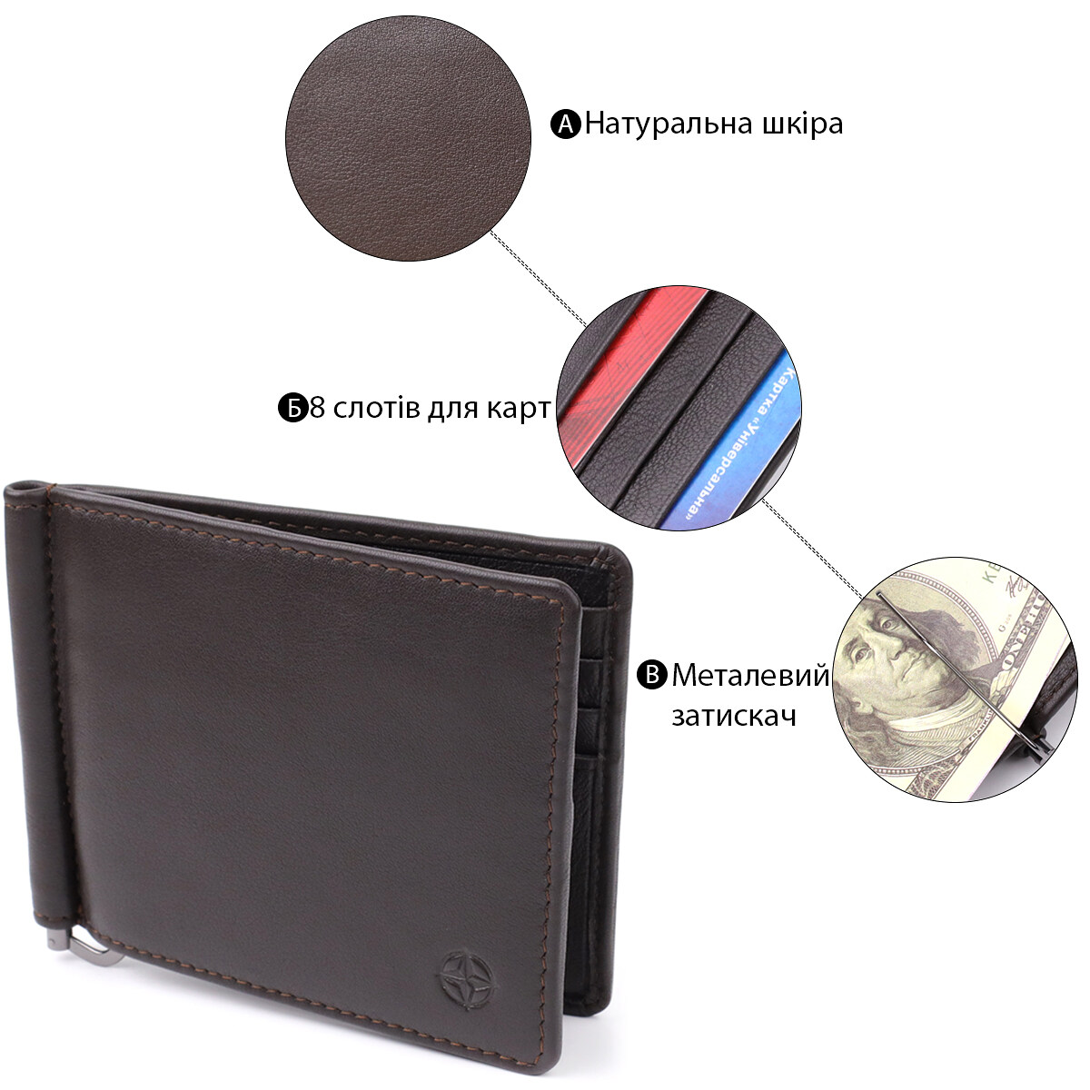 Аксесуар виконаний із натуральної гладкої шкіри коричневого кольору. Усередині передбачено вісім слотів для карток та надійний металевий затискач для грошей. На лицьовій стороні в правому нижньому кутку розташований тиснений логотип виробника, що підкреслює оригінальність і статус виробу. Дизайн без застібки робить модель зручною у використанні та зберігає компактність.
