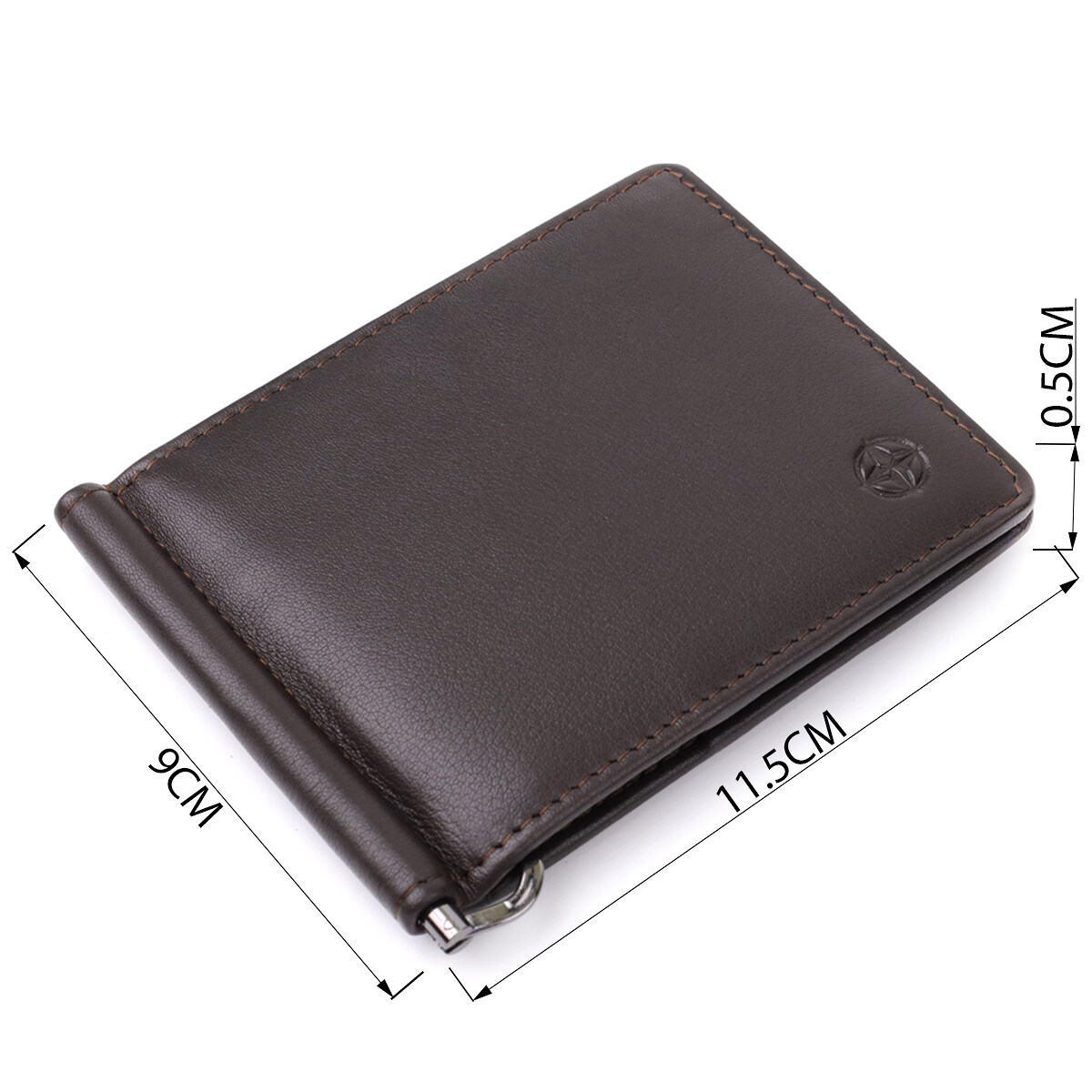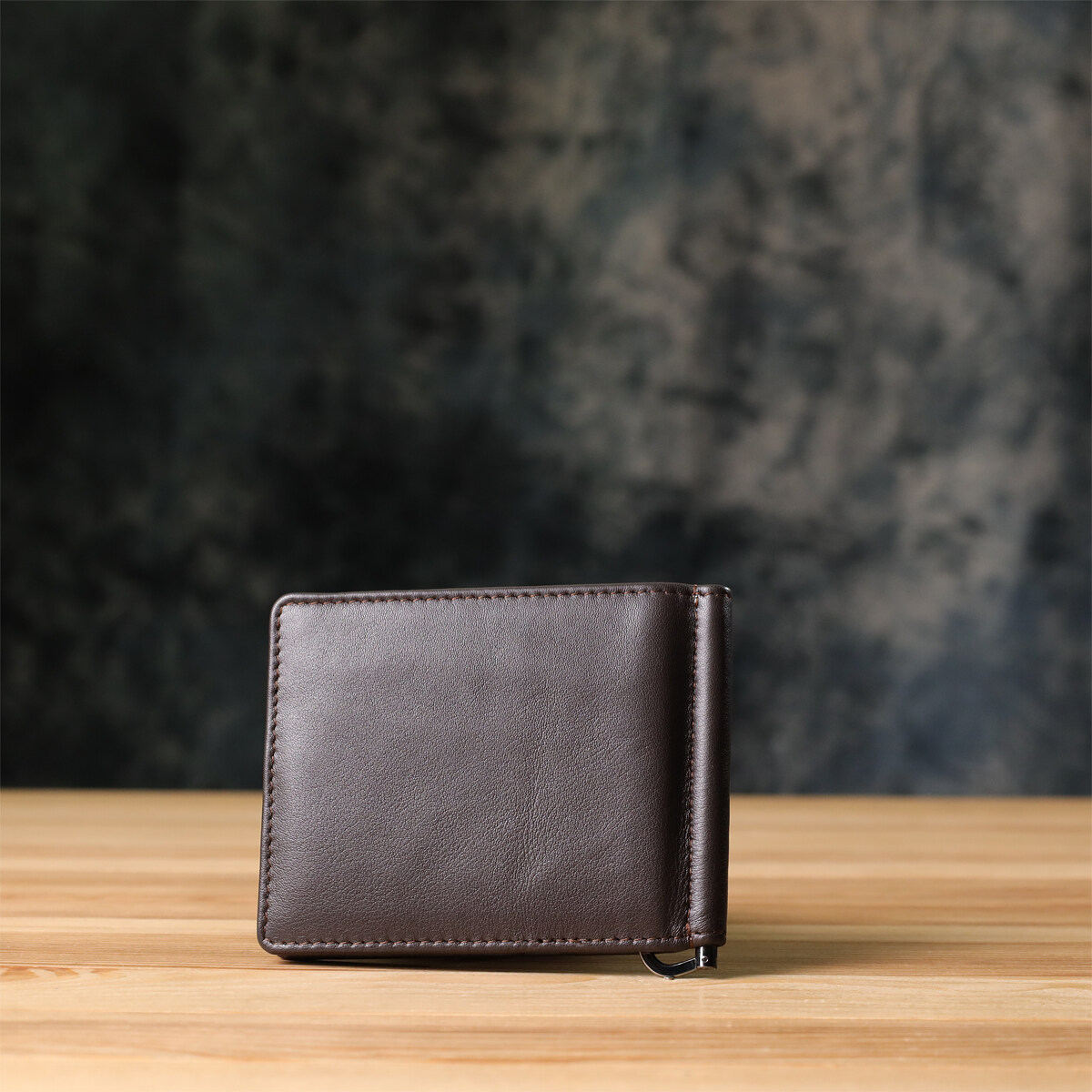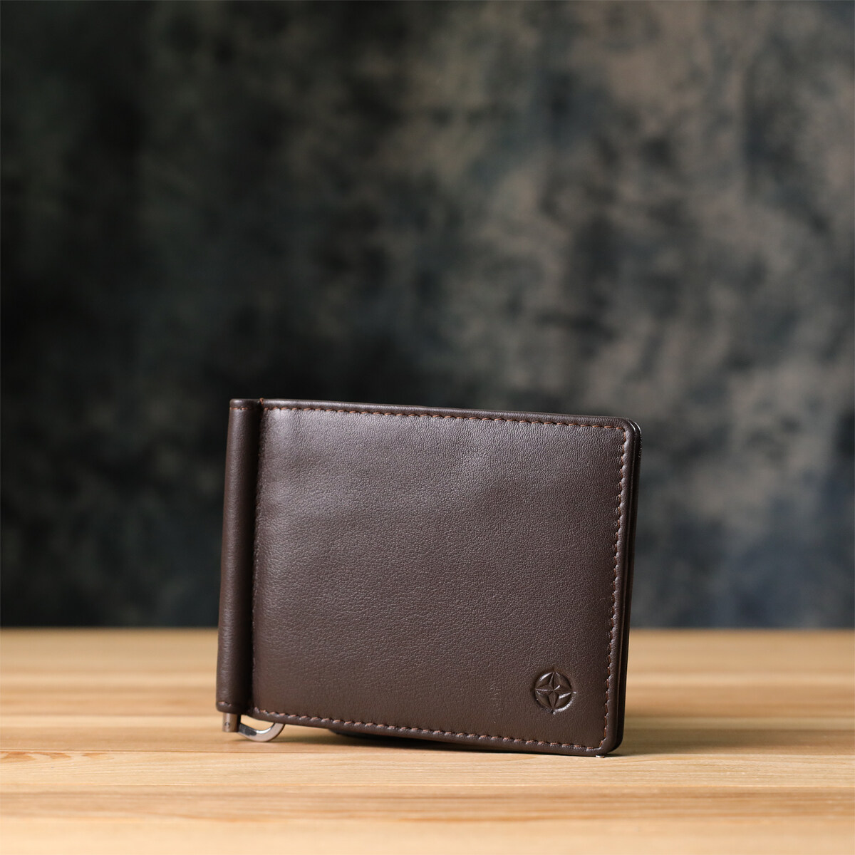 Аксесуар виконаний із натуральної гладкої шкіри коричневого кольору. Усередині передбачено вісім слотів для карток та надійний металевий затискач для грошей. На лицьовій стороні в правому нижньому кутку розташований тиснений логотип виробника, що підкреслює оригінальність і статус виробу. Дизайн без застібки робить модель зручною у використанні та зберігає компактність.
