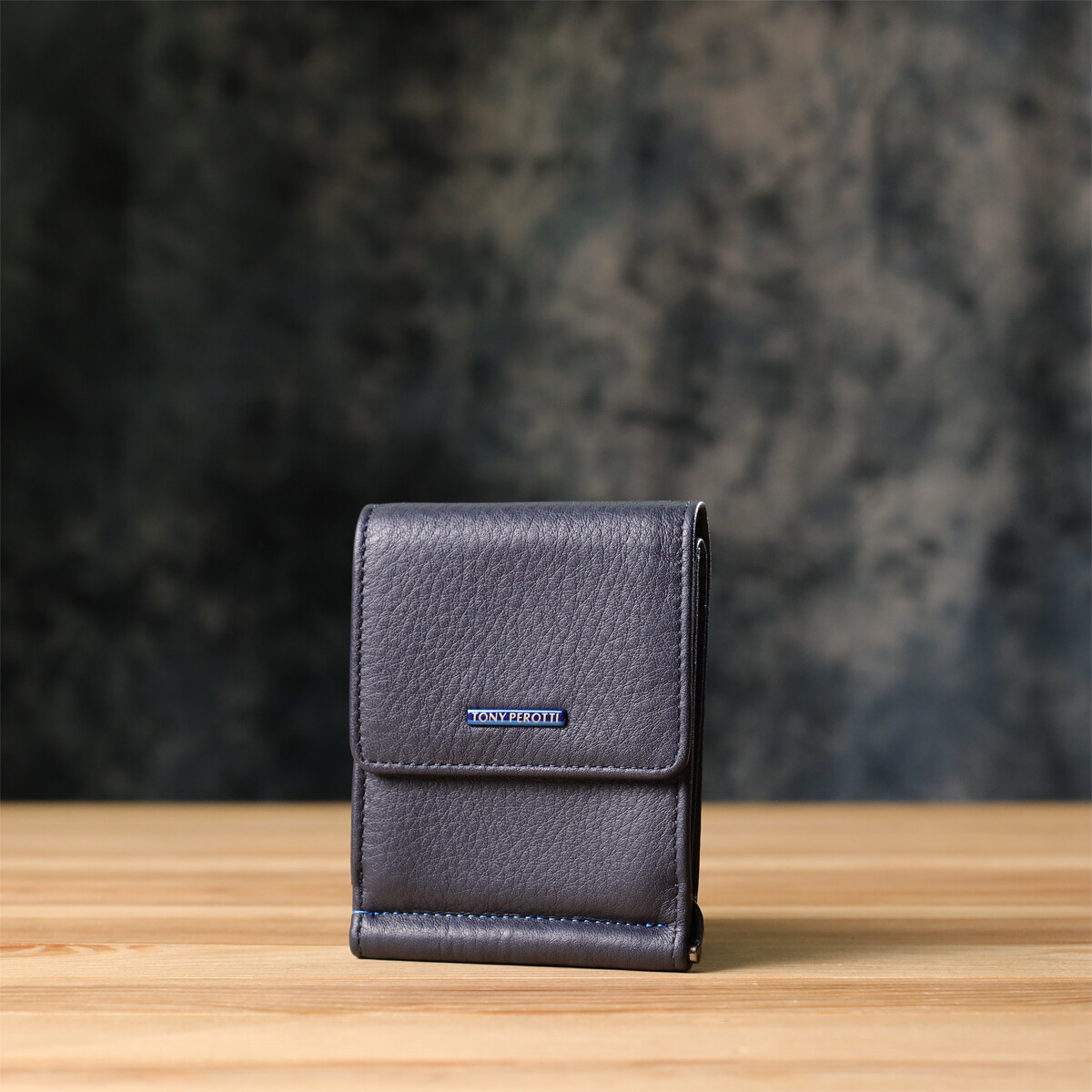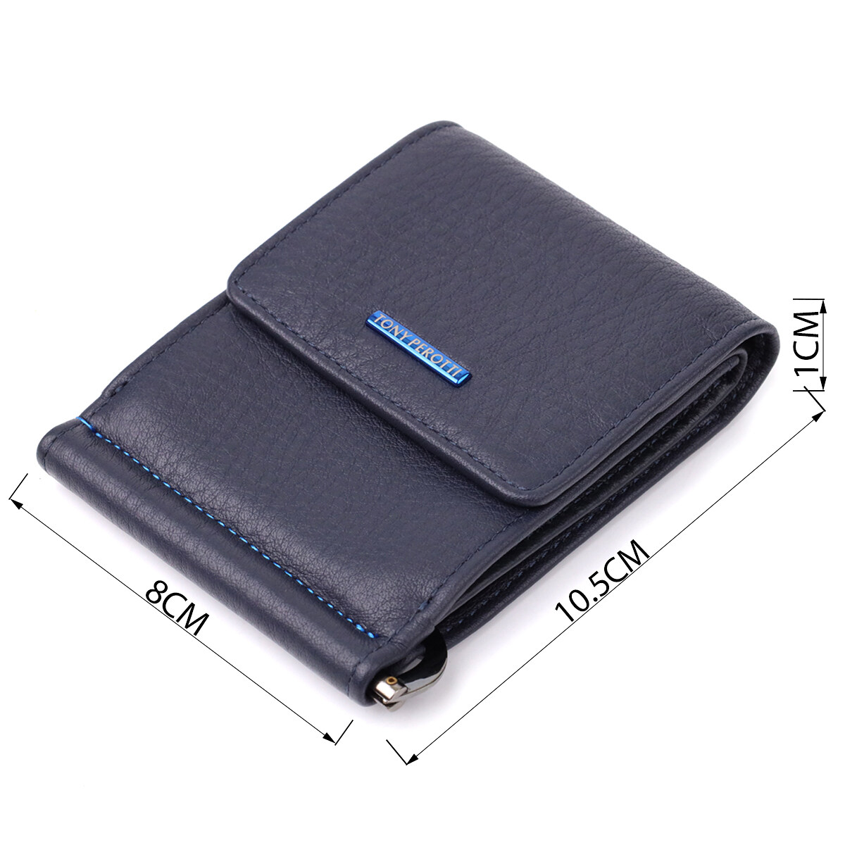 Стильний затискач для грошей із зернистої натуральної шкіри синього кольору - це поєднання мінімалізму та функціональності. Компактна форма, продумані відділення для карт та надійний металевий затискач забезпечують зручне зберігання. Контрастна прошивка та металевий логотип бренду надають аксесуару сучасного та елегантного вигляду, підкреслюючи смак та статус власника.
