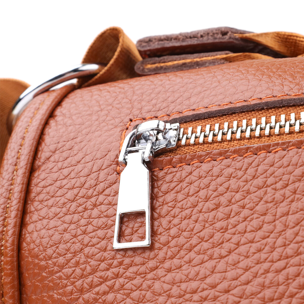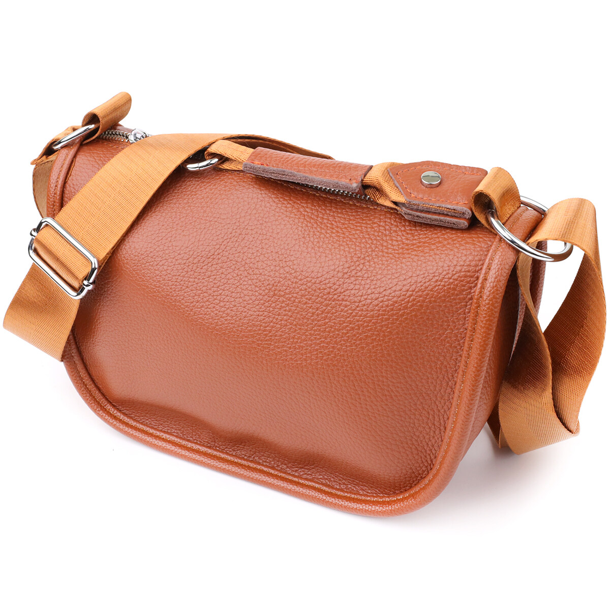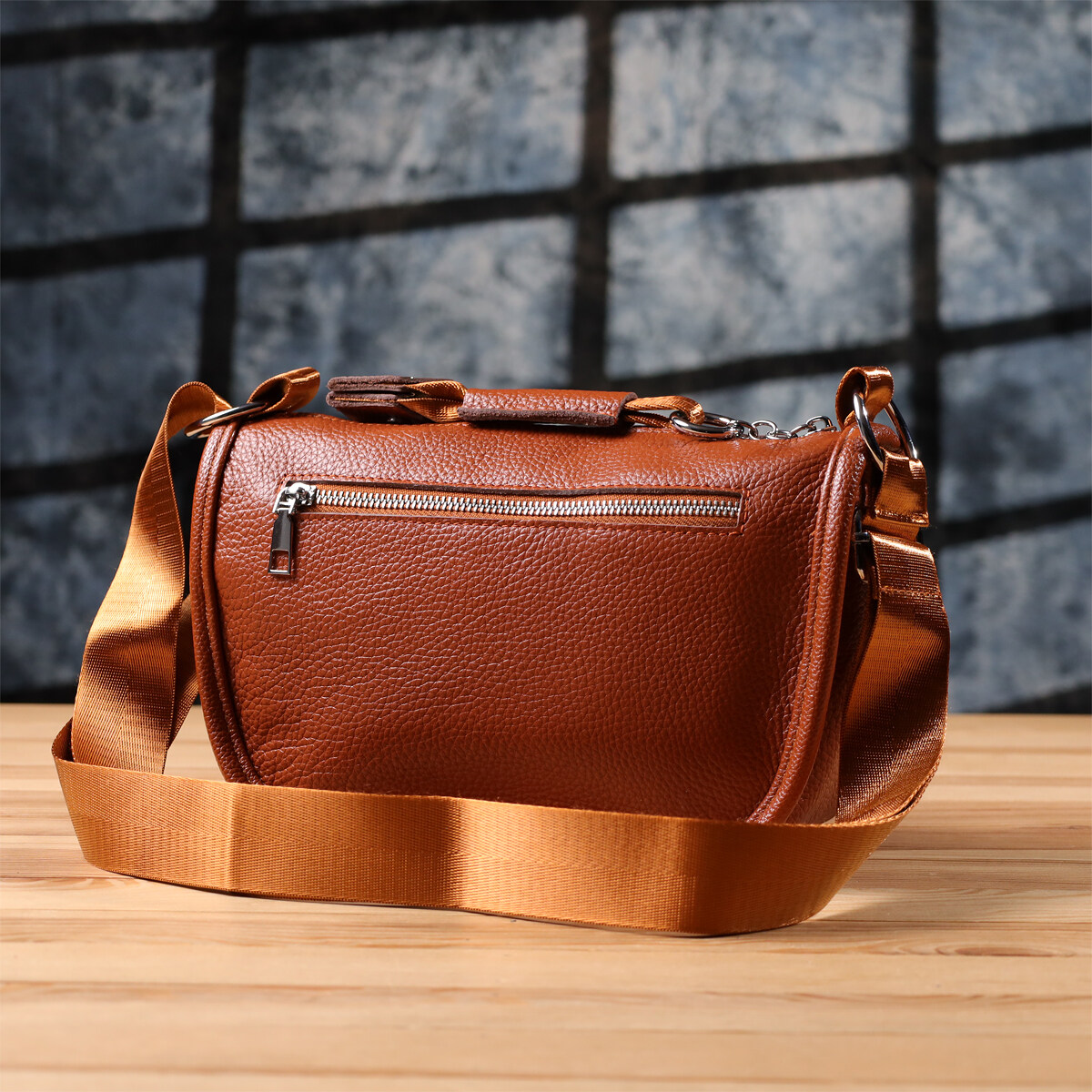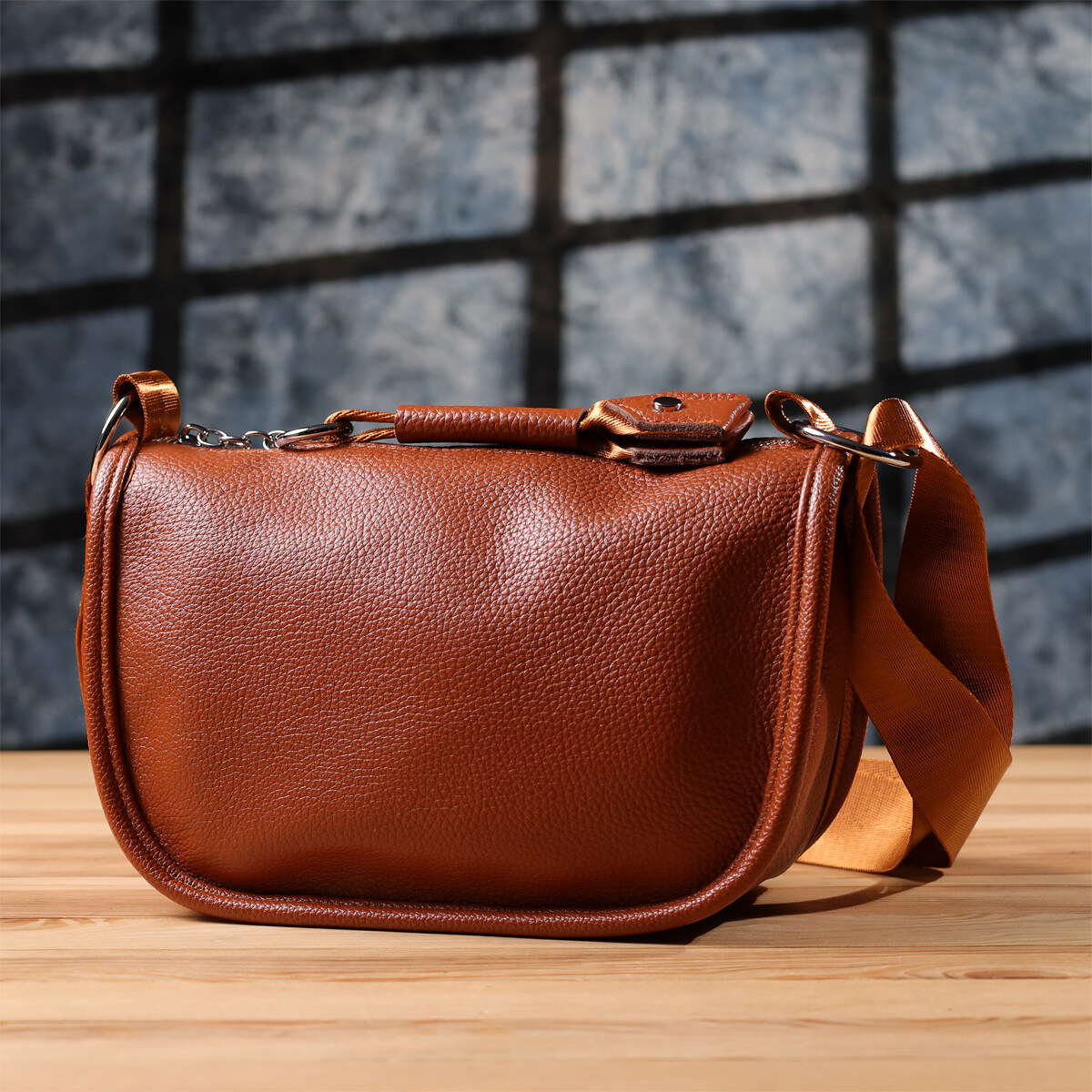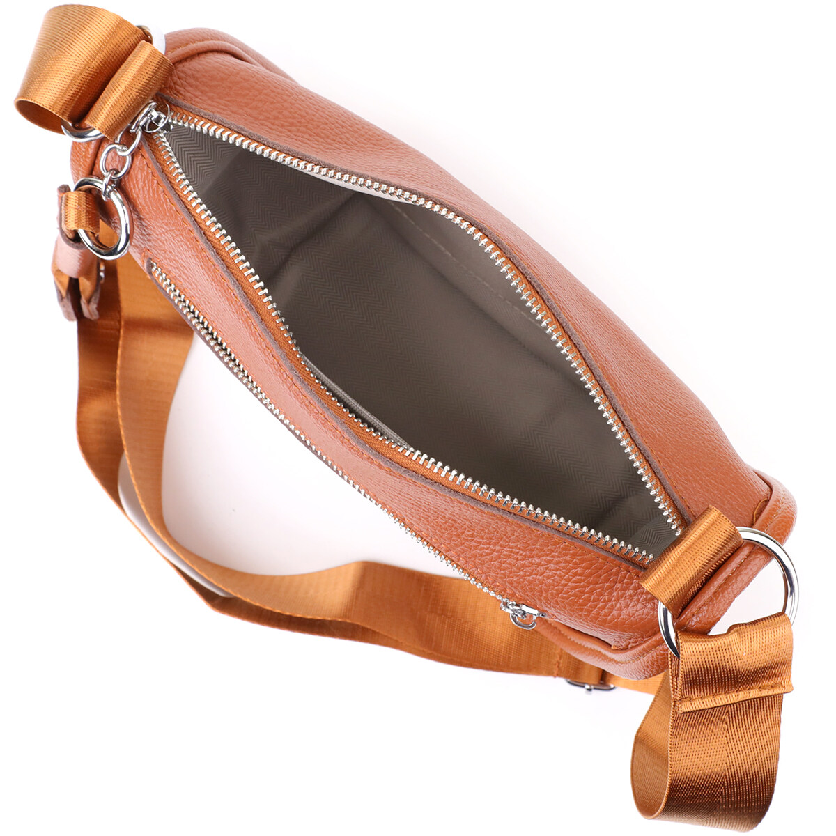 Жіноча шкіряна сумка коричневого кольору виконана з якісної зернистої шкіри і має напівкруглу акуратну форму, що підкреслює елегантність і сучасний стиль. Особливий акцент моделі - декоративний бігунок у вигляді стильного брелка, який додає індивідуальності та вишуканості. Сумка закривається на блискавку, всередині одне основне відділення з двома кишенями на блискавці та двома відкритими кишенями для дрібниць, на тильній стороні розташована зовнішня кишеня на блискавці. Текстильний ремінь не знімний та забезпечує зручне носіння, а фурнітура під срібло гармонійно доповнює теплий відтінок шкіри. Ця сумка стане універсальним аксесуаром для повсякденного використання та особливих випадків, поєднуючи практичність, стиль та увагу до деталей.