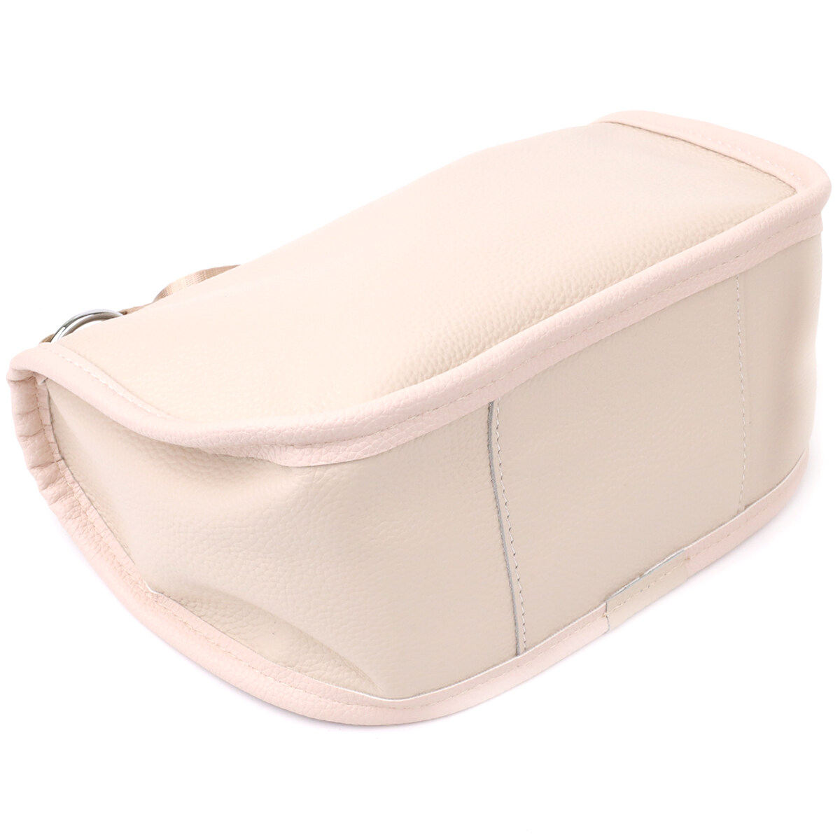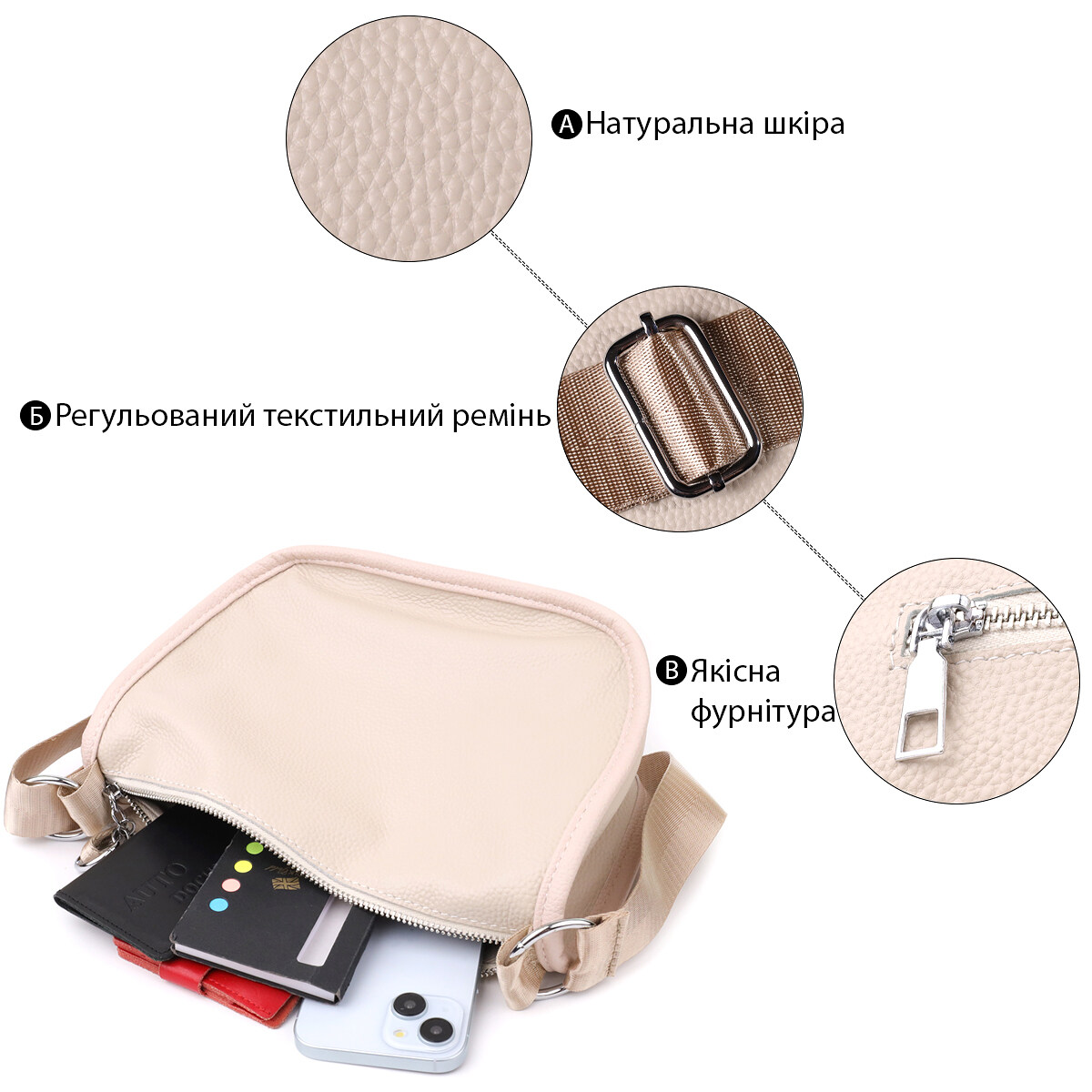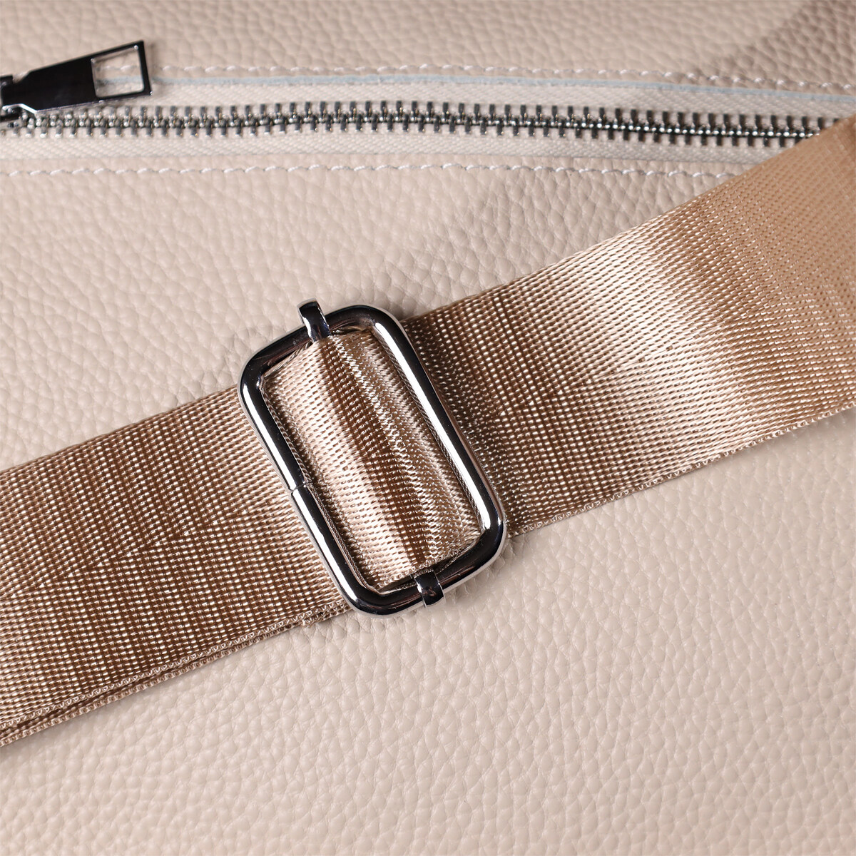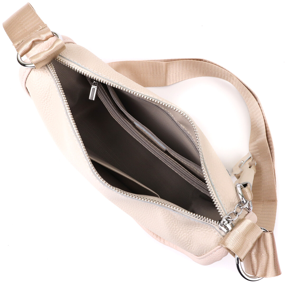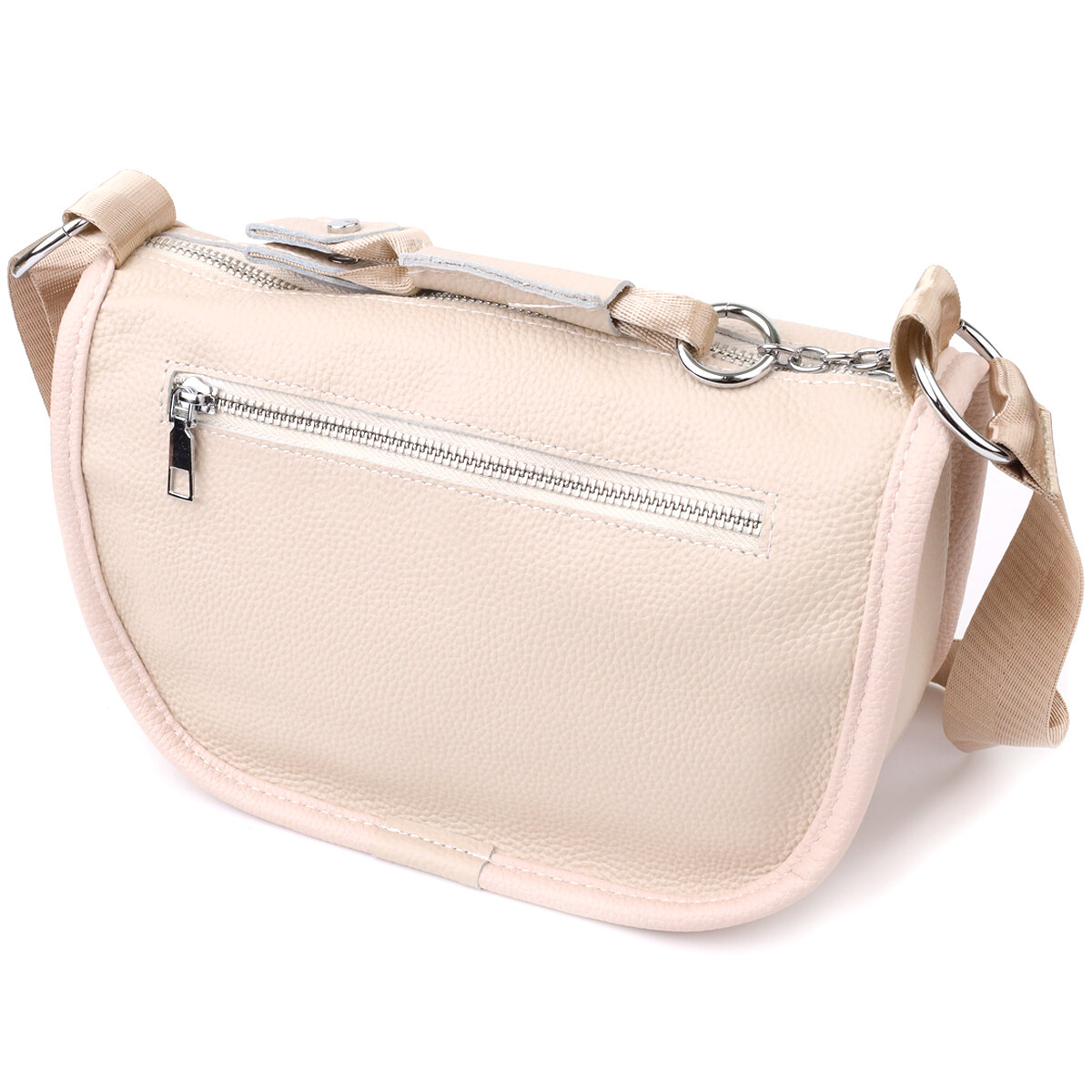 Жіноча шкіряна сумка у ніжному білому кольорі виконана з якісної зернистої шкіри та має напівкруглу акуратну форму, що підкреслює елегантність та легкість образу. Декоративний бігунок у вигляді стильного брелка надає моделі індивідуальності та витонченому шарму. Сумка закривається на блискавку, всередині розташоване основне відділення із двома кишенями на блискавці та двома відкритими кишенями для дрібниць, на тильній стороні є зовнішня кишеня на блискавці. Незнімний текстильний ремінь забезпечує зручність при носінні, а фурнітура під срібло гармонійно відтінює світлий білий тон шкіри. Ця сумка стане універсальним аксесуаром як для повсякденних виходів, так і для особливих випадків, поєднуючи практичність, стиль та увагу до деталей.