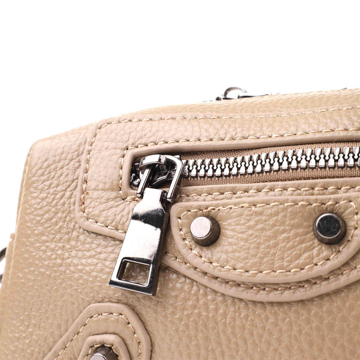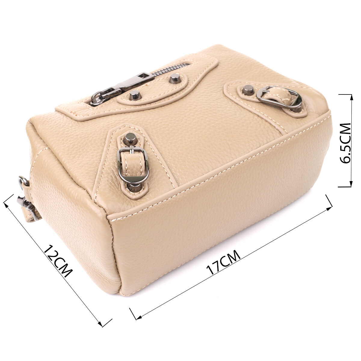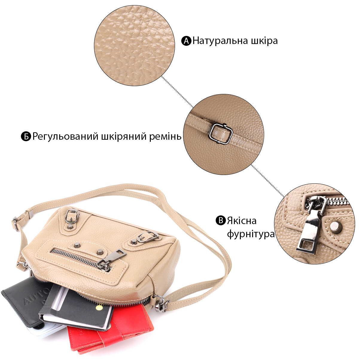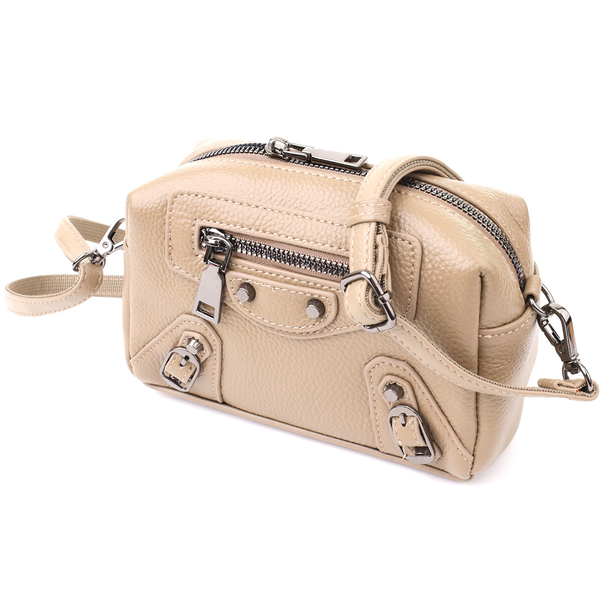 Компактна жіноча шкіряна сумка у бежевому кольорі з декоративною фурнітурою – ефектний акцент із характером. Сумка виконана з натуральної шкіри у стильному бежевому кольорі, що робить образ світлим, свіжим та актуальним. Декоративні елементи відіграють ключову роль у дизайні: металеві заклепки, ремінці та фігурний рядок на лицьовій стороні надають аксесуару сучасного, злегка зухвалого вигляду.