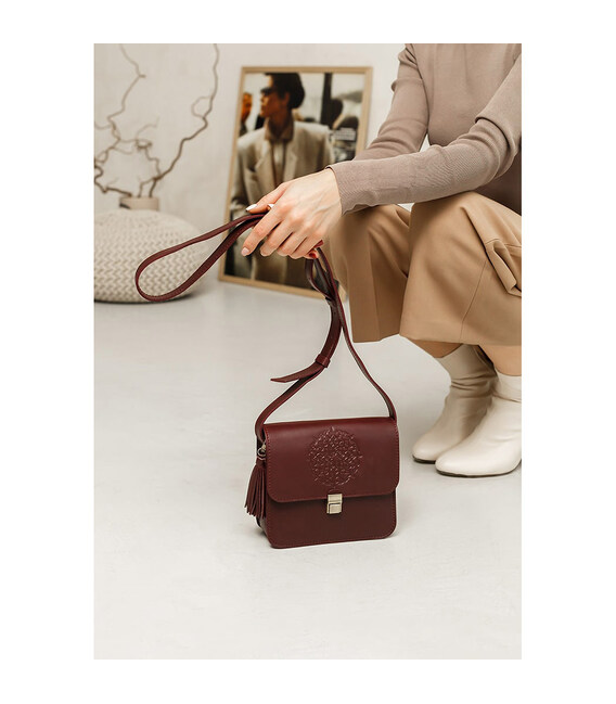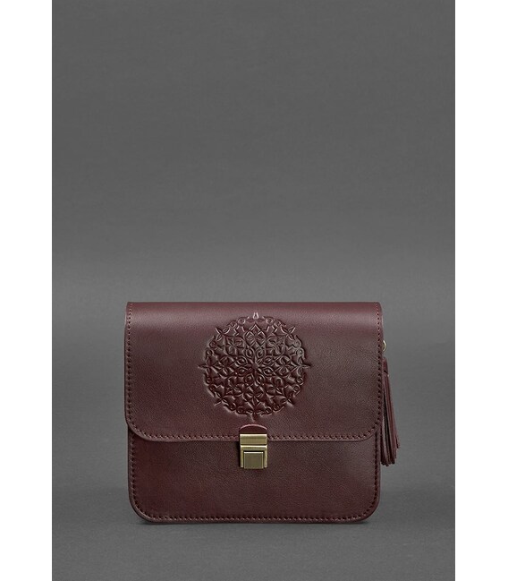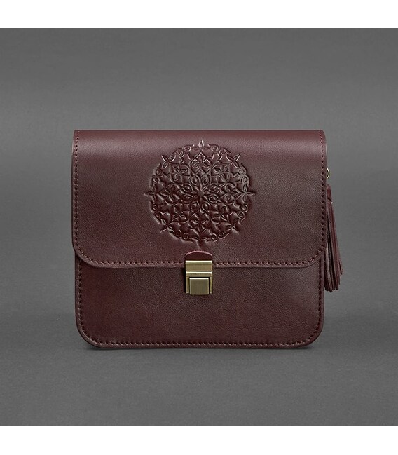 Довжину шкіряного плечового ремінця можна легко регулювати. Прикрашена бордова сумка BlankNote Лілу знімною китицею, яка може використовуватися як брелок. На передній частині жіночої сумки розташовано тиснення у вигляді індійської мандалы. Закривається шкіряна сумка на металевий портфельний замок
