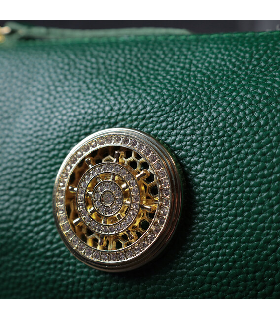 Якісна жіноча сумка з натуральної шкіри з високим показником якості та зносостійкості. На лицьовій стороні розташована кругла прикраса з камінчиками, що надає сумці стильного та вишуканого вигляду. Аксесуар складається з одного основного відділення, потайної кишені на блискавці, кишені відкритого типу та кишені на блискавці зовні. Носити сумку можна на плечі і через плече, для цього є текстильний ремінь, що не знімається. У виробі використано якісну фурнітуру кольору жовтого золота. Універсальний варіант сумки як на вечір так і як сумочка на кожен день.