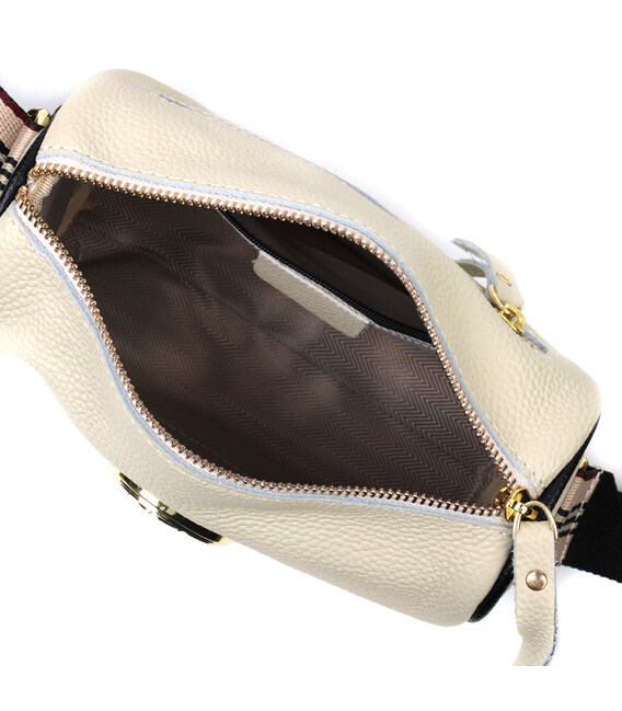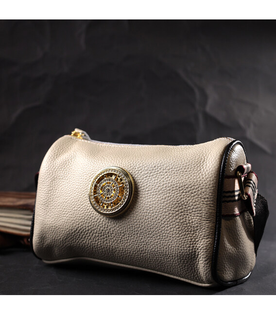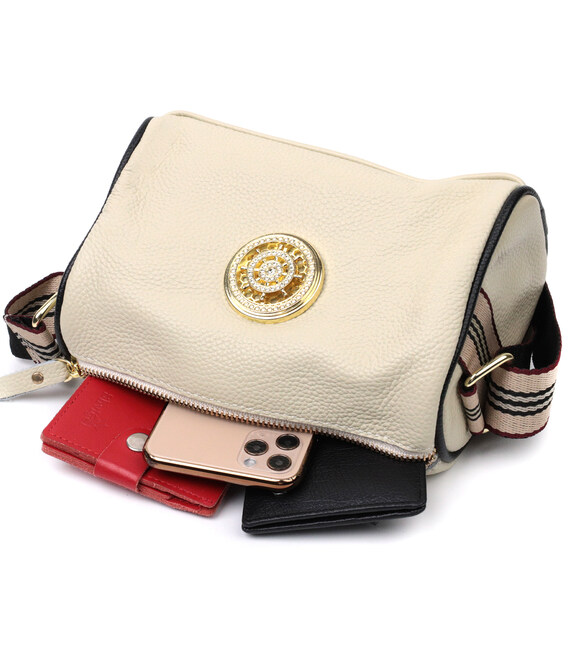 Жіноча цікава сумка у білому з молочним відтінком кольорі з натуральної шкіри з високим показником якості та зносостійкості. На лицьовій стороні розташована кругла прикраса з камінчиками, що надає сумці стильного та вишуканого вигляду. Аксесуар складається з одного основного відділення, потайної кишені на блискавці, кишені відкритого типу та кишені на блискавці зовні. Носити сумку можна на плечі і через плече, для цього є текстильний ремінь, що не знімається. У виробі використано якісну фурнітуру кольору жовтого золота. Універсальний варіант сумки як на вечір так і як сумочка на кожен день.