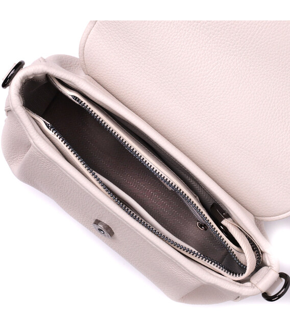 Стильна сумка з фактурним клапаном з натуральної шкіри флотар, яка невибаглива у догляді та довго носиться. Аксесуар складається з трьох основних відділень, двох відкритого типу та одного посередині, що закривається на блискавку та має потайну кишеню на блискавці, кишеню відкритого типу та кишені на блискавці зовні. Носити сумку можна під рукою, на плечі і через плече, для цього є два ремені, що знімаються, текстильний і шкіряний. У виробі використано якісну фурнітуру кольору темного срібла. Універсальний варіант сумки як на вечір так і як сумочка на кожен день.