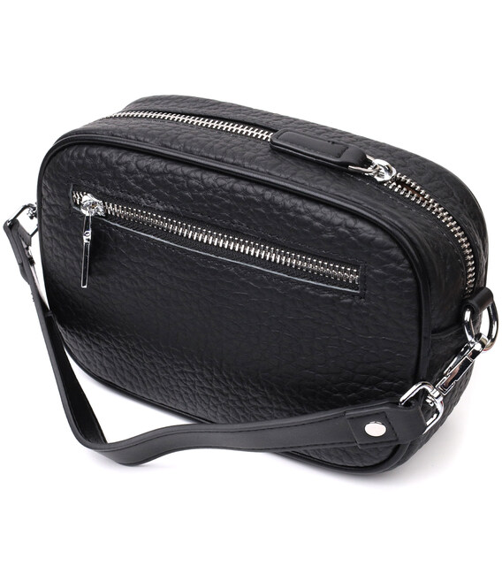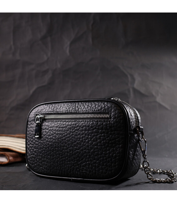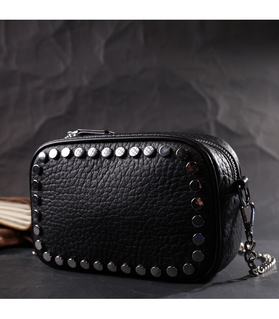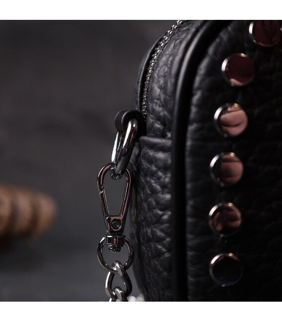 Стильна сумка жіноча з натуральної крупнозернистої шкіри, на лицьовій стороні, по краю, декорована кнопками у вигляді прямокутника. Аксесуар складається з одного основного відділення, потайної кишені на блискавці, кишені відкритого типу та кишені на блискавці зовні. Носити сумку можна в руках, на плечі і через плече, для цього є ручка для перенесення в руках і знімний ремінець з ланцюжком для переносу не плечі. У виробі використано надійну фурнітуру срібного кольору. Шкіряна сумка – найкращий подарунок для будь-якої дівчини.