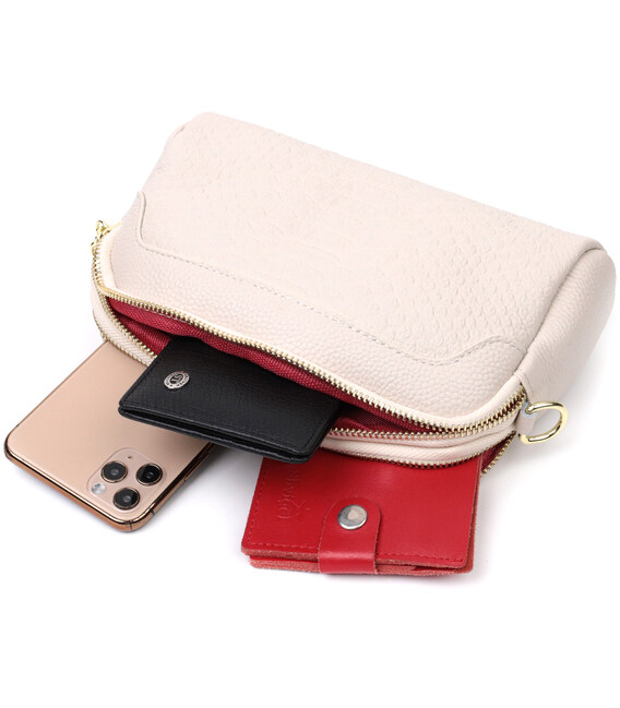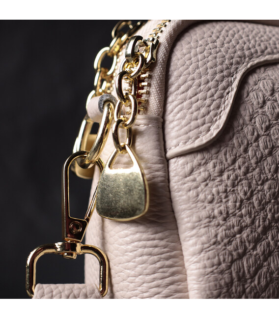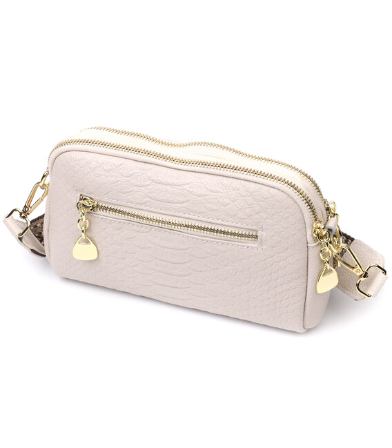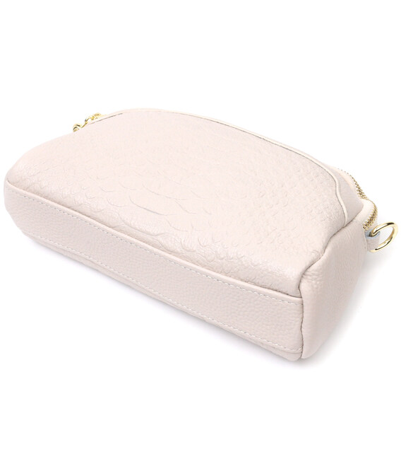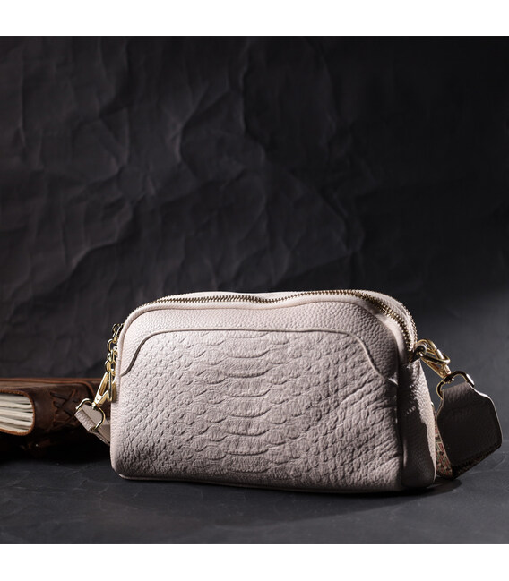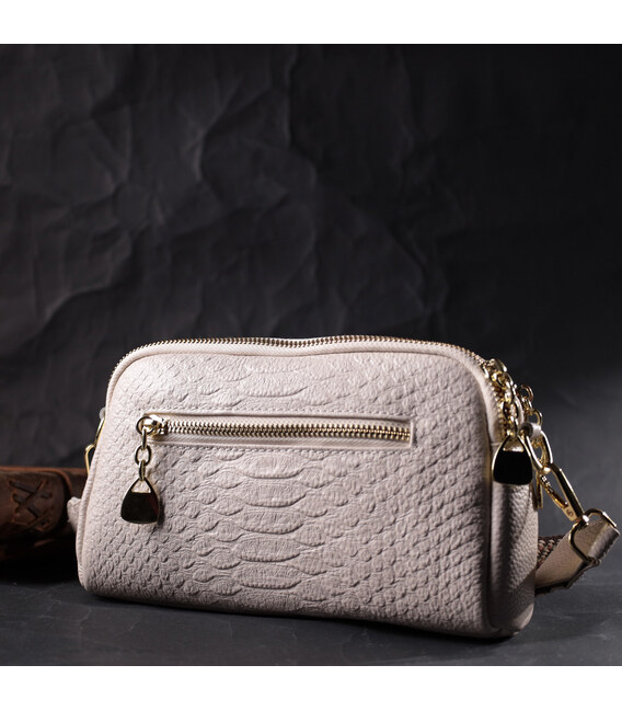 Жіноча сумка на два автономні відділення з натуральної шкіри з тисненням під змію, яка невибаглива у догляді та довго носиться. Аксесуар складається з двох основних відділень, потайної кишені на блискавці, кишені відкритого типу та кишені на блискавці зовні. Носити сумку можна в руках, на плечі і через плече, для цього є текстильний ремінь, що знімається. У виробі використано якісну фурнітуру кольору жовтого золота. Універсальний варіант сумки як на вечір так і як сумочка на кожен день.