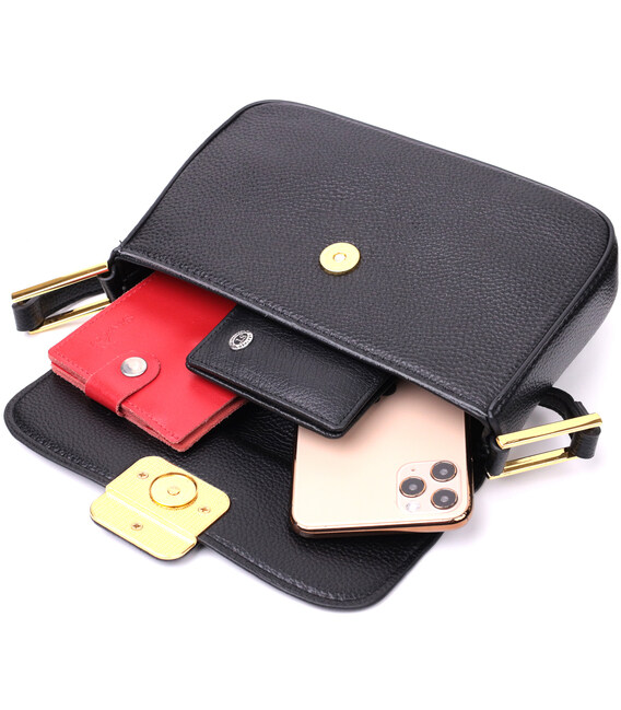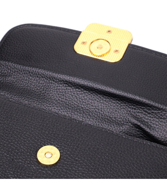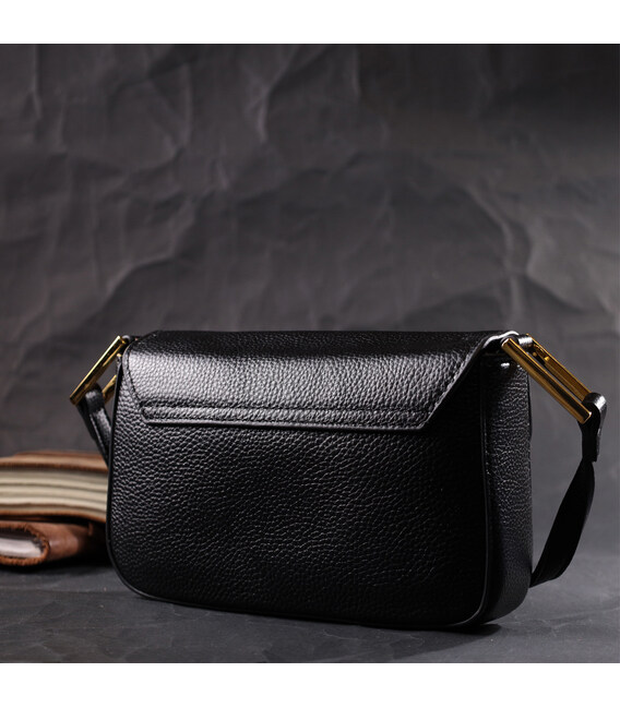 Оригінальна сумка з твердим каркасом із натуральної шкіри з високим показником якості та зносостійкості. Аксесуар складається з основного відділення, що закривається на блискавку та клапаном на магніт, усередині якого знаходиться потайна кишеня на блискавці та кишеня відкритого типу. Носити сумку можна на плечі, через плече для цього є незнімний шкіряний ремінь, що регулюється, а також як клатч під рукою. У виробі використано якісну фурнітуру кольору жовтого золота.