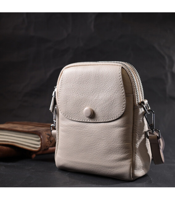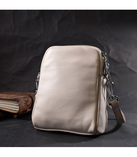 Цікава сумка трапецієподібної форми для стильних та незалежних жінок. Виріб пошитий з якісної натуральної м'якої шкіри, яка довго носиться і не втрачає свого первісного вигляду. На лицьовій стороні розташована накладна кишеня, що закривається клапаном на магніт. Аксесуар складається з двох відділень, що закриваються на блискавки, всередині яких знаходиться потайна кишеня на блискавці та кишеня відкритого типу. Носити сумку можна на плечі і через плече, для цього є шкіряний ремінь, що знімається. У виробі використано якісну фурнітуру срібного кольору. Універсальний варіант сумки як на вечір так і як сумочка на кожен день.