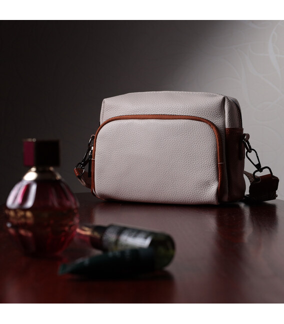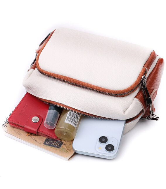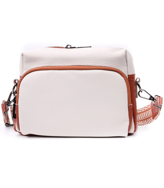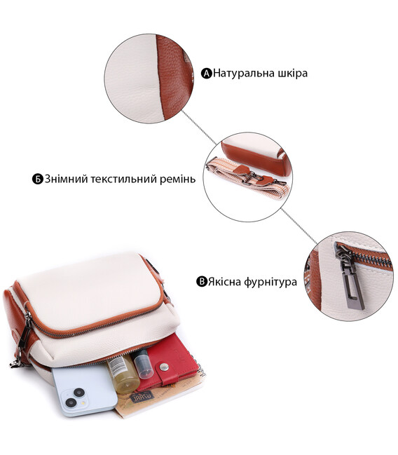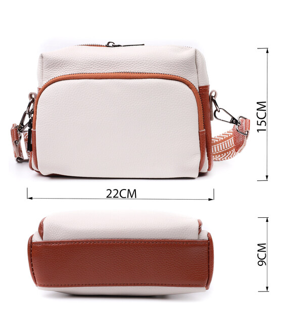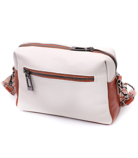 Відмінна жіноча сумка на кожен день із натуральної шкіри. У виробі використана шкіра білого та коричневого кольору. Притягує погляд у виробі текстильний ремінь із гарним малюнком. Аксесуар складається з основного відділення, потайної кишені на блискавці та кишені відкритого типу, а також двох кишень зовні на лицьовій та тильній стороні. Носити сумку можна в руці, під рукою, на плечі і через плече, для цього є текстильний ремінь, що знімається. В аксесуарі використано якісну фурнітуру кольору темного срібла. Відмінний варіант для подарунка близьким та дорогим дівчатам та жінкам.