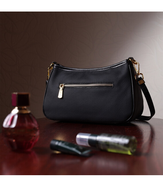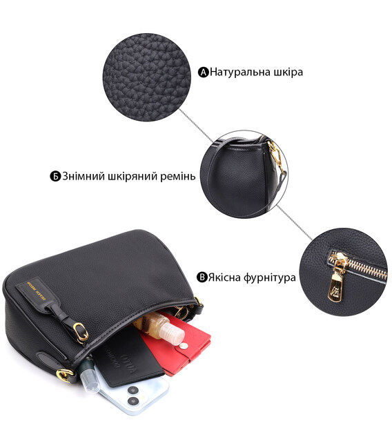 Каркасна напівкругла сумка жіноча з натуральної якісної шкіри. Аксесуар складається з основного відділення, яке закривається на блискавку та клапан з магнітом, потайної кишені на блискавці та кишені відкритого типу всередині, а також кишені зовні на тильній стороні. Носити сумку можна в руці, на плечі і через плече для цього є знімні два шкіряні ремінці. В аксесуарі використано якісну фурнітуру кольору срібла.