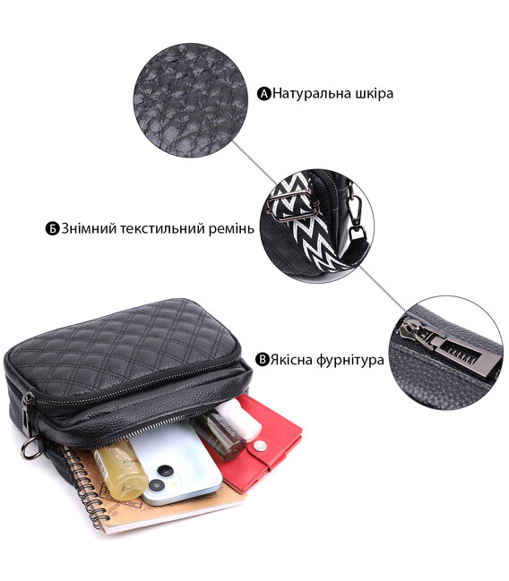 Стильна сумка для жінок із натуральної шкіри. Сумка прошита на лицьовій стороні трендовими ромбами, що надає аксесуару стилю. Носити сумку можна на плечі та через плече, також можна носити як клатч під рукою, для цього можна зняти текстильний ремінець.