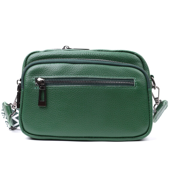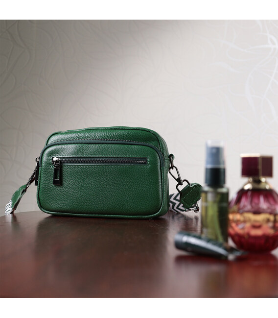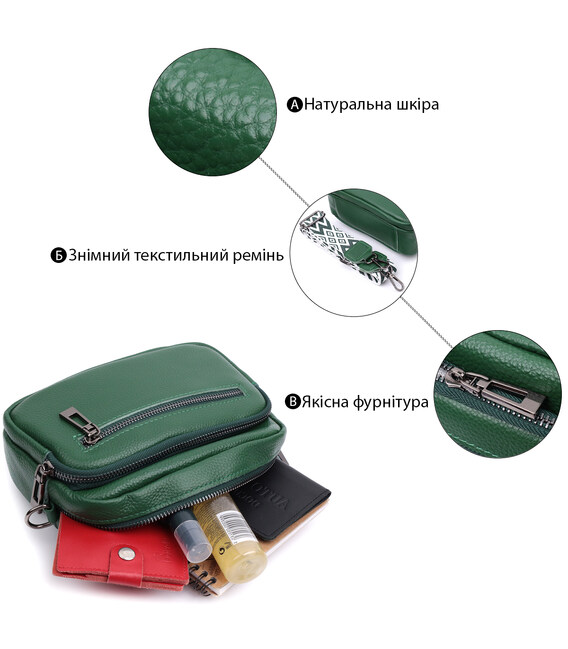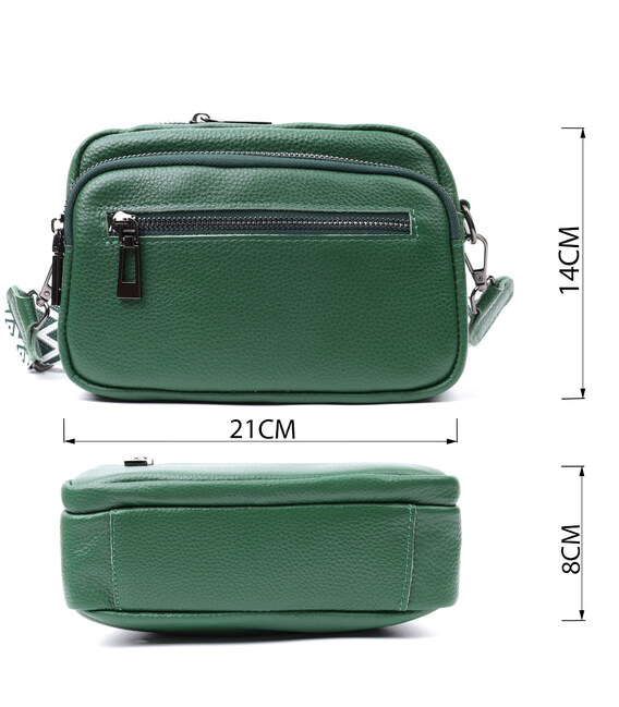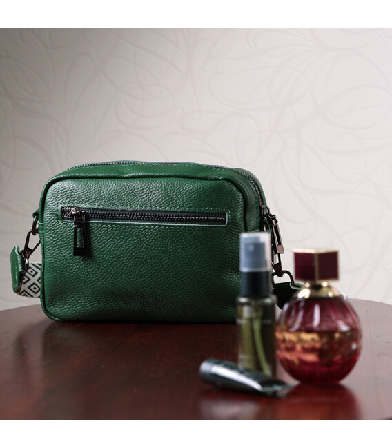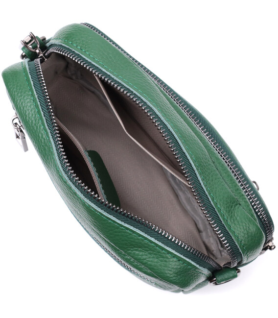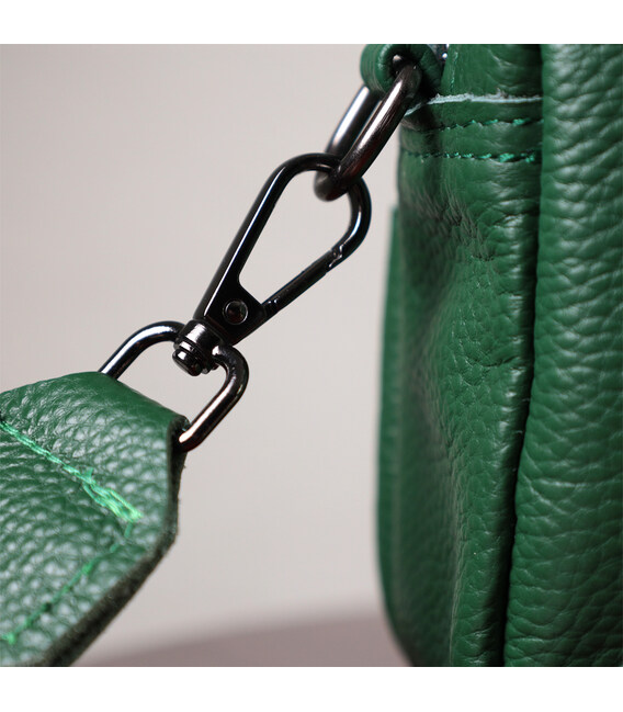 Жіноча компактна, але містка сумка з натуральної шкіри. Аксесуар складається з основного відділення, що закривається на блискавку, кишені відкритого типу та кишені на блискавці всередині та трьох кишень зовні. Носити сумку можна на плечі та через плече, також можна носити як клатч під рукою, для цього можна зняти текстильний ремінець.