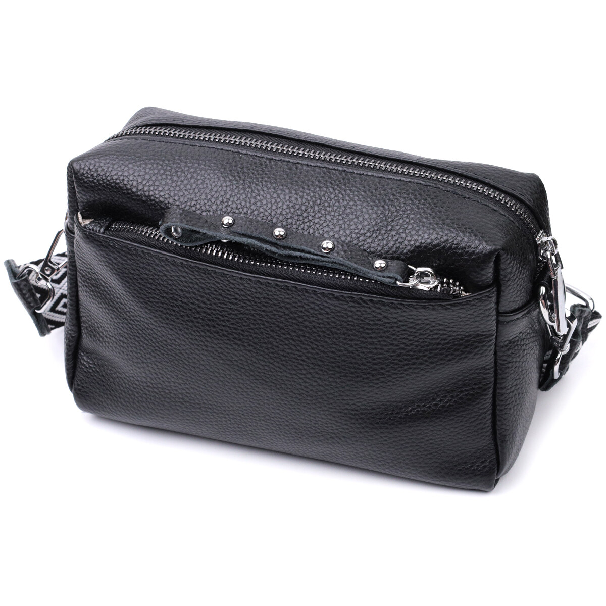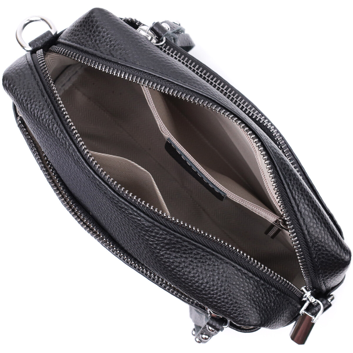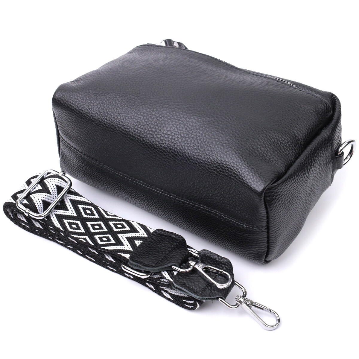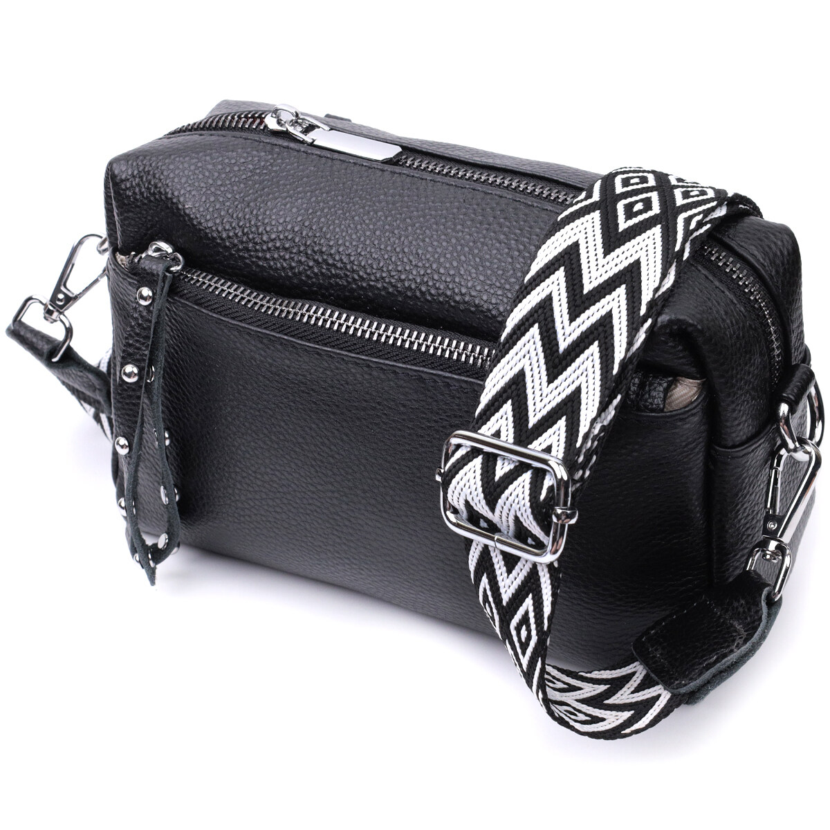 Практична сумка жіноча в класичному чорному кольорі з натуральної шкіри. Аксесуар складається з основного відділення, що закривається на блискавку, кишені на блискавці та кишені відкритого типу всередині, двох кишень на блискавках зовні, на тильній та лицьовій стороні. Носити сумку можна на плечі і через плече, для цього є текстильний ремінь, що знімається.