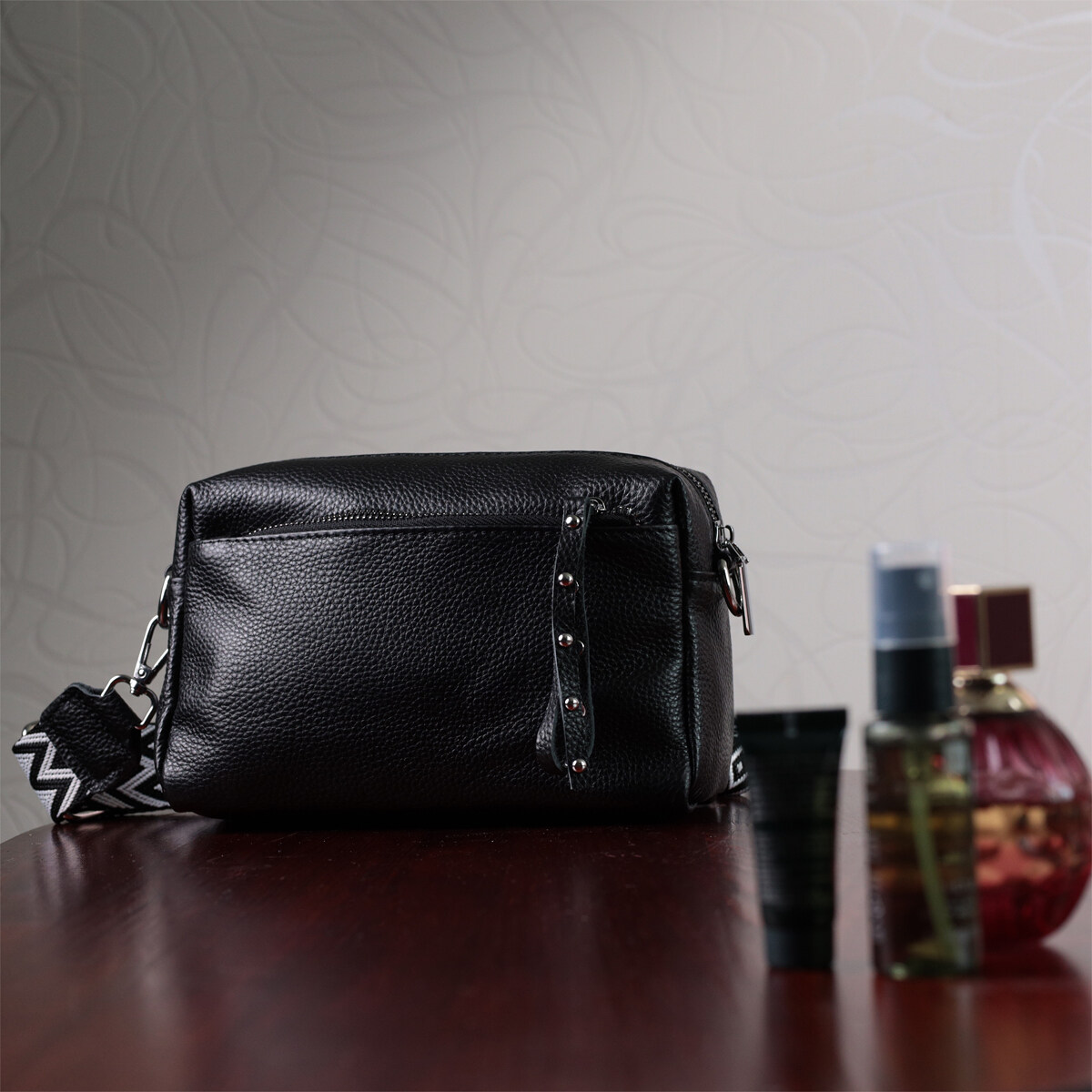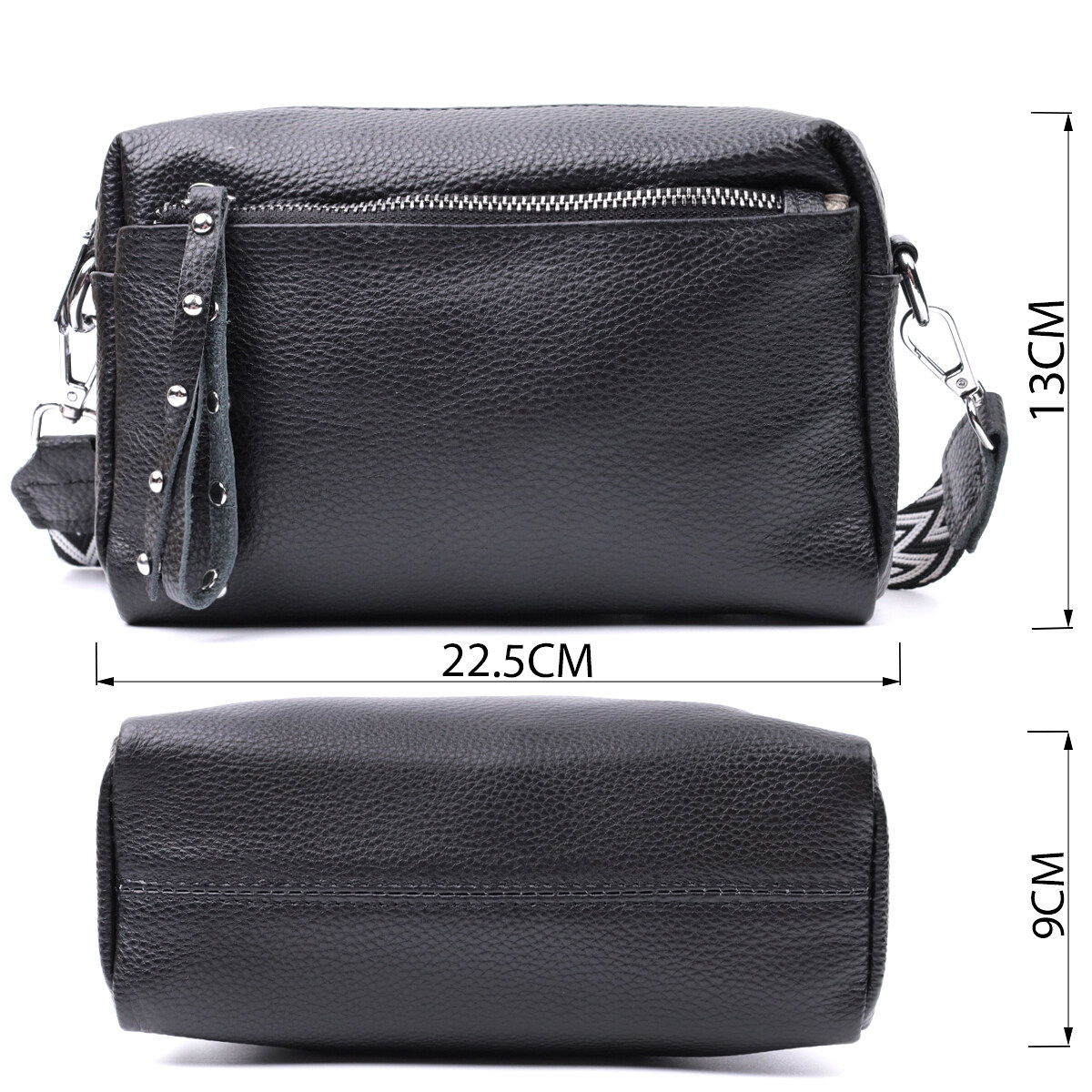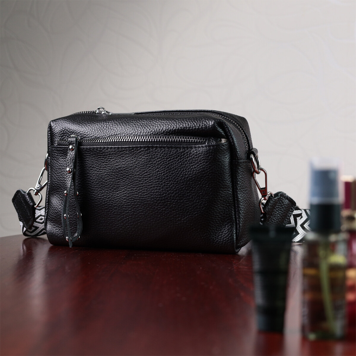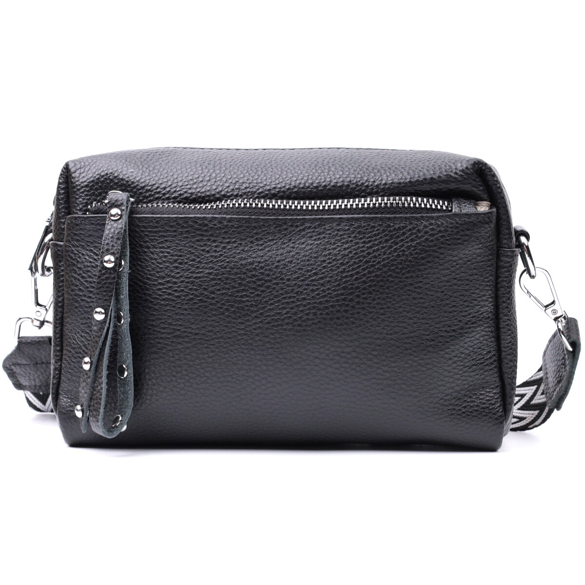Практична сумка жіноча в класичному чорному кольорі з натуральної шкіри. Аксесуар складається з основного відділення, що закривається на блискавку, кишені на блискавці та кишені відкритого типу всередині, двох кишень на блискавках зовні, на тильній та лицьовій стороні. Носити сумку можна на плечі і через плече, для цього є текстильний ремінь, що знімається.