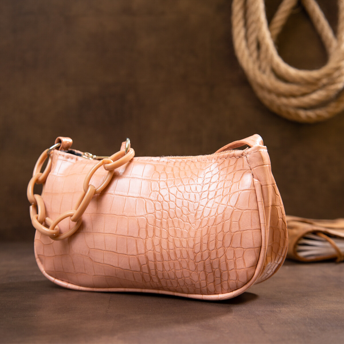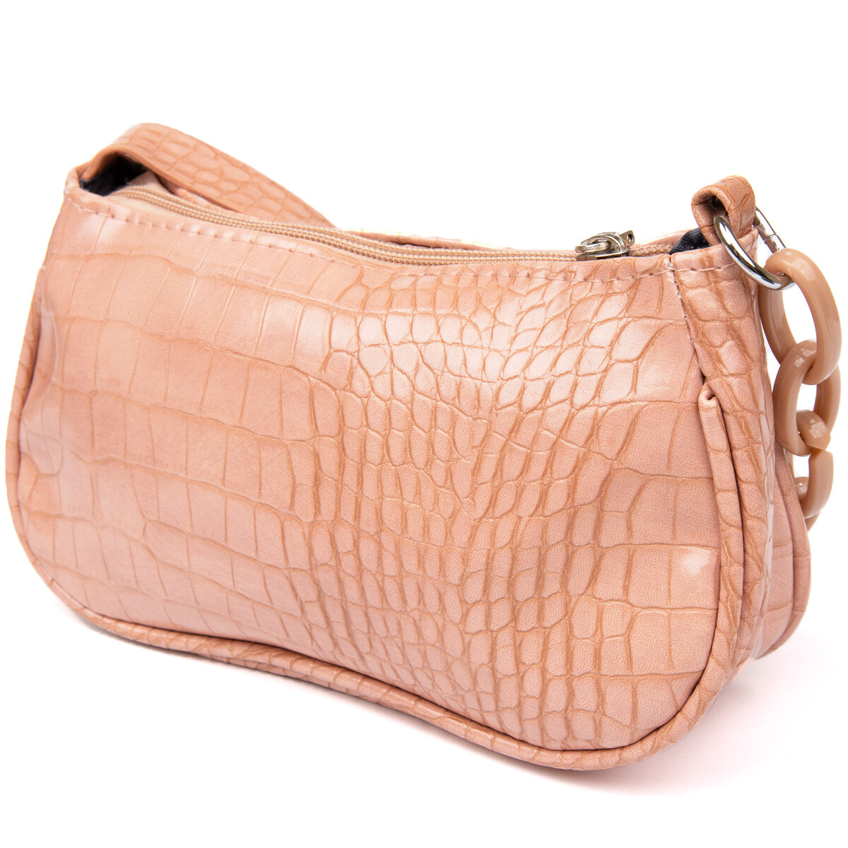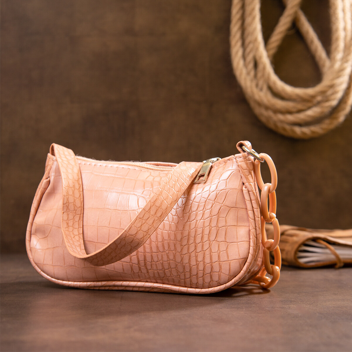 Компактна сумка горизонтального типу з продуманим овальним дизайном "багет" зі шкірозамінника ніжного рожевого кольору. Модель м'яка і приємна на дотик. Сумка дуже компактна. В дану модель можна помістити маленький гаманець, телефон, ключі та паспорт. Аксесуар виглядає презентабельно і підійде як під вечірній так і повсякденний образ. Рекомендуємо вам дану сумку за доступною ціною в нашому магазині. Сумка чудово підійде на випускний або корпоратив, а також на дискотеку.