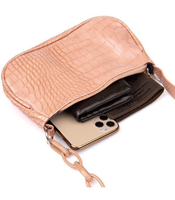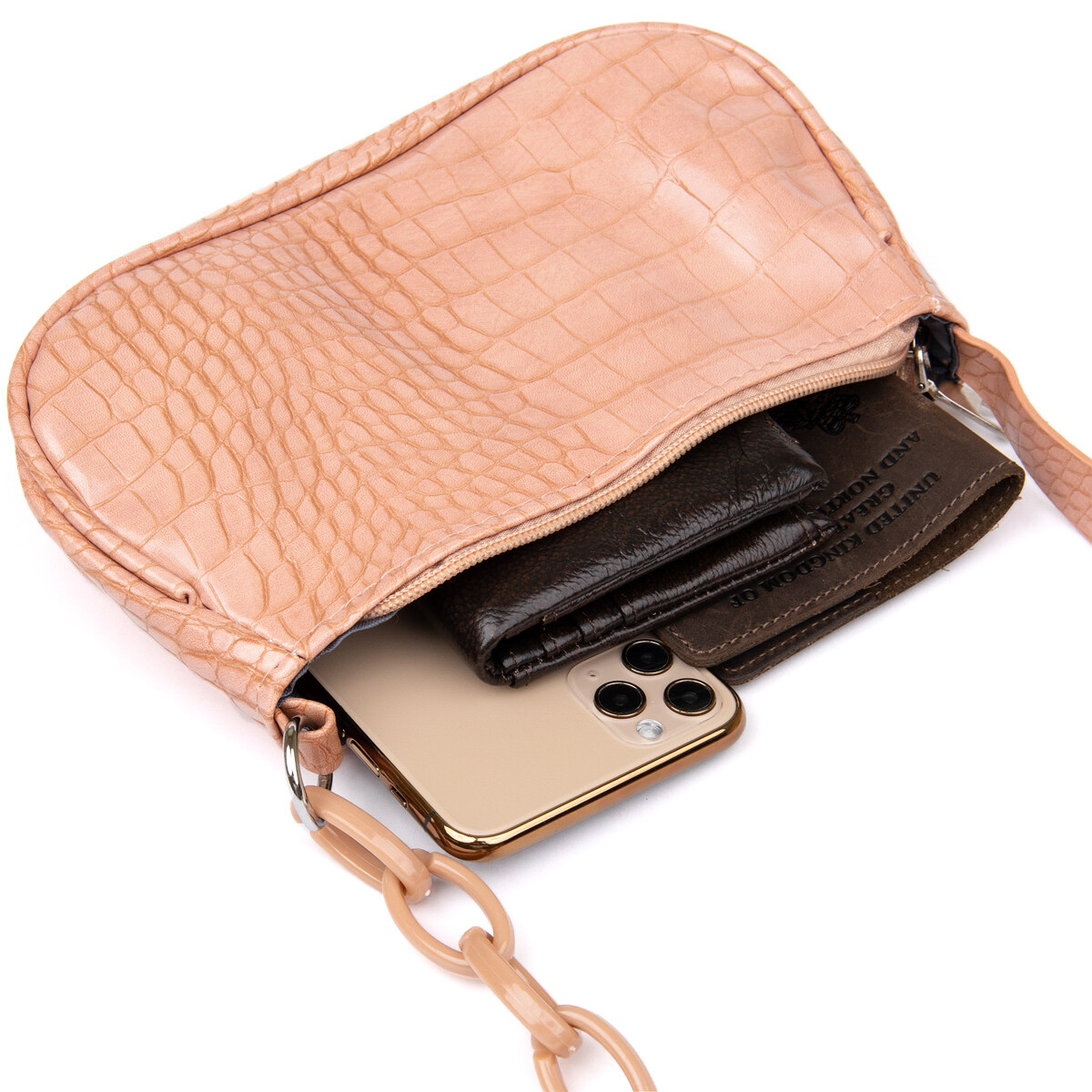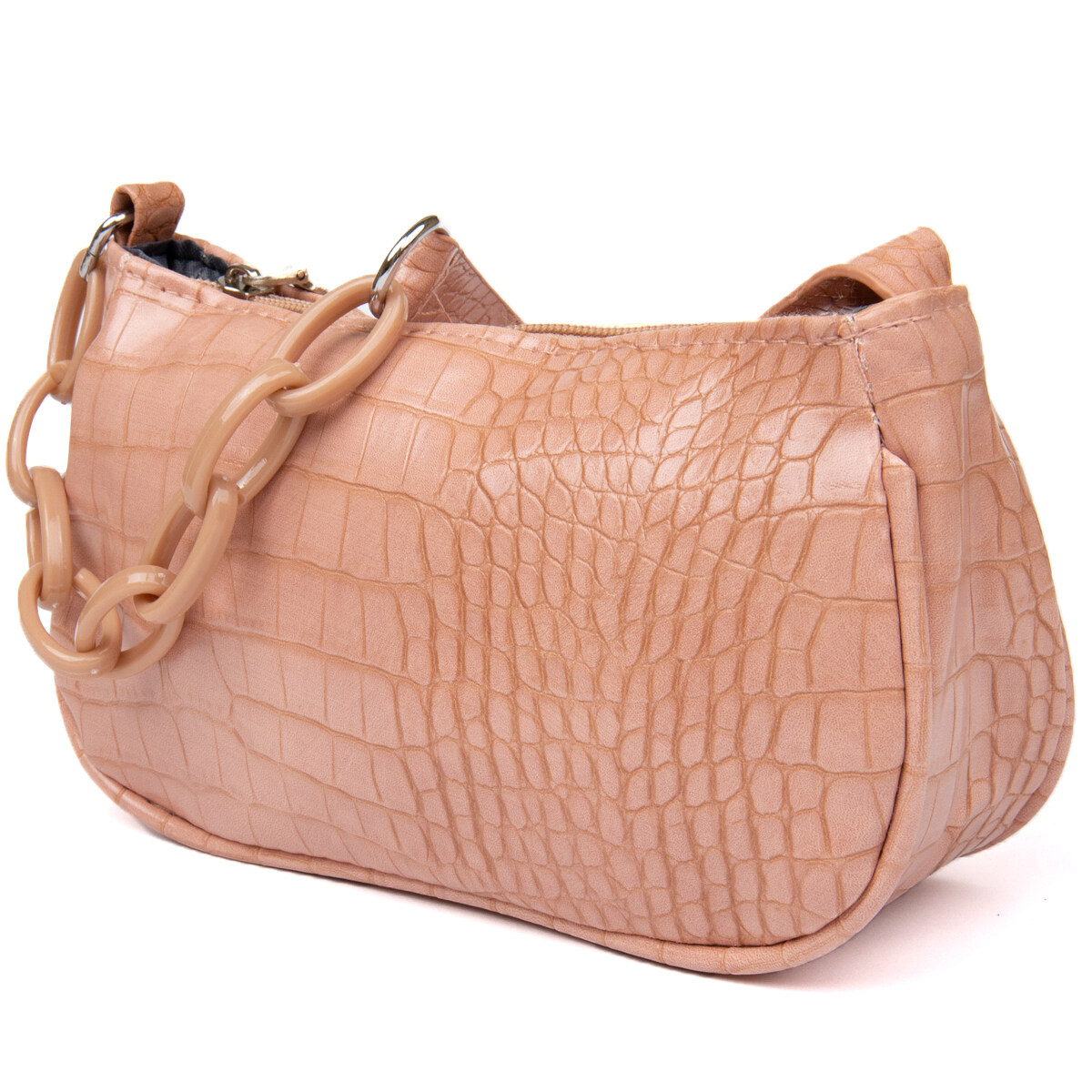 Компактна сумка горизонтального типу з продуманим овальним дизайном "багет" зі шкірозамінника ніжного рожевого кольору. Модель м'яка і приємна на дотик. Сумка дуже компактна. В дану модель можна помістити маленький гаманець, телефон, ключі та паспорт. Аксесуар виглядає презентабельно і підійде як під вечірній так і повсякденний образ. Рекомендуємо вам дану сумку за доступною ціною в нашому магазині. Сумка чудово підійде на випускний або корпоратив, а також на дискотеку.