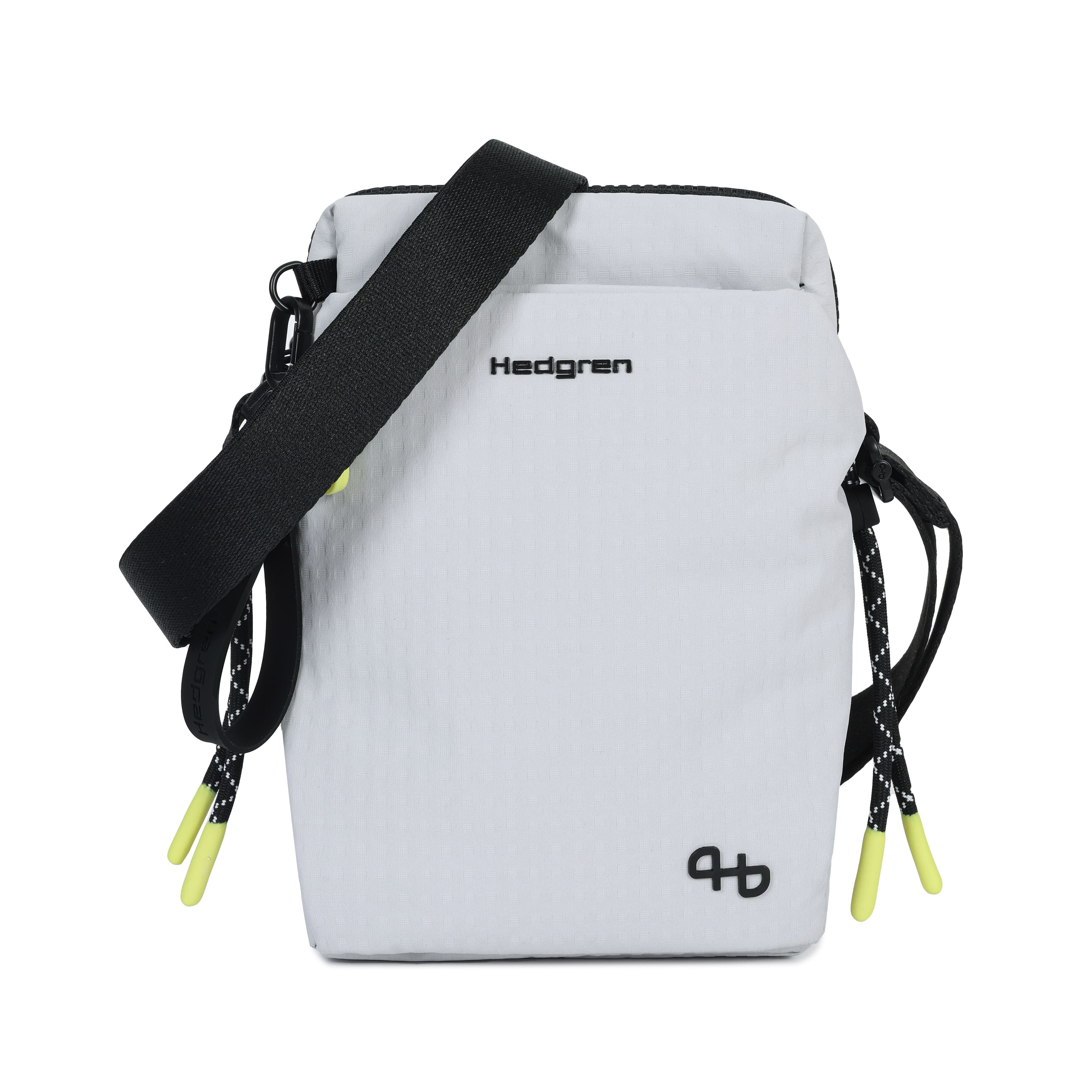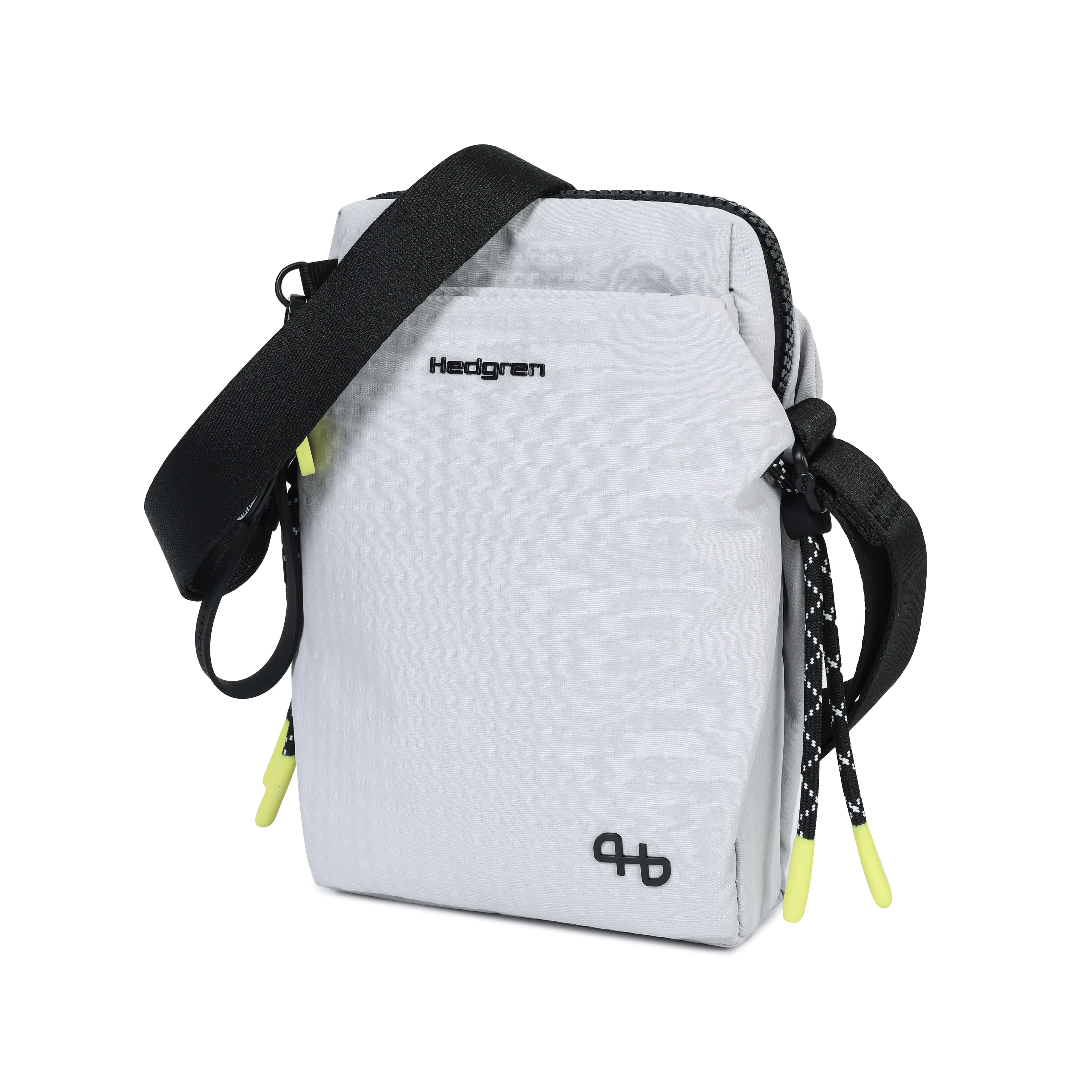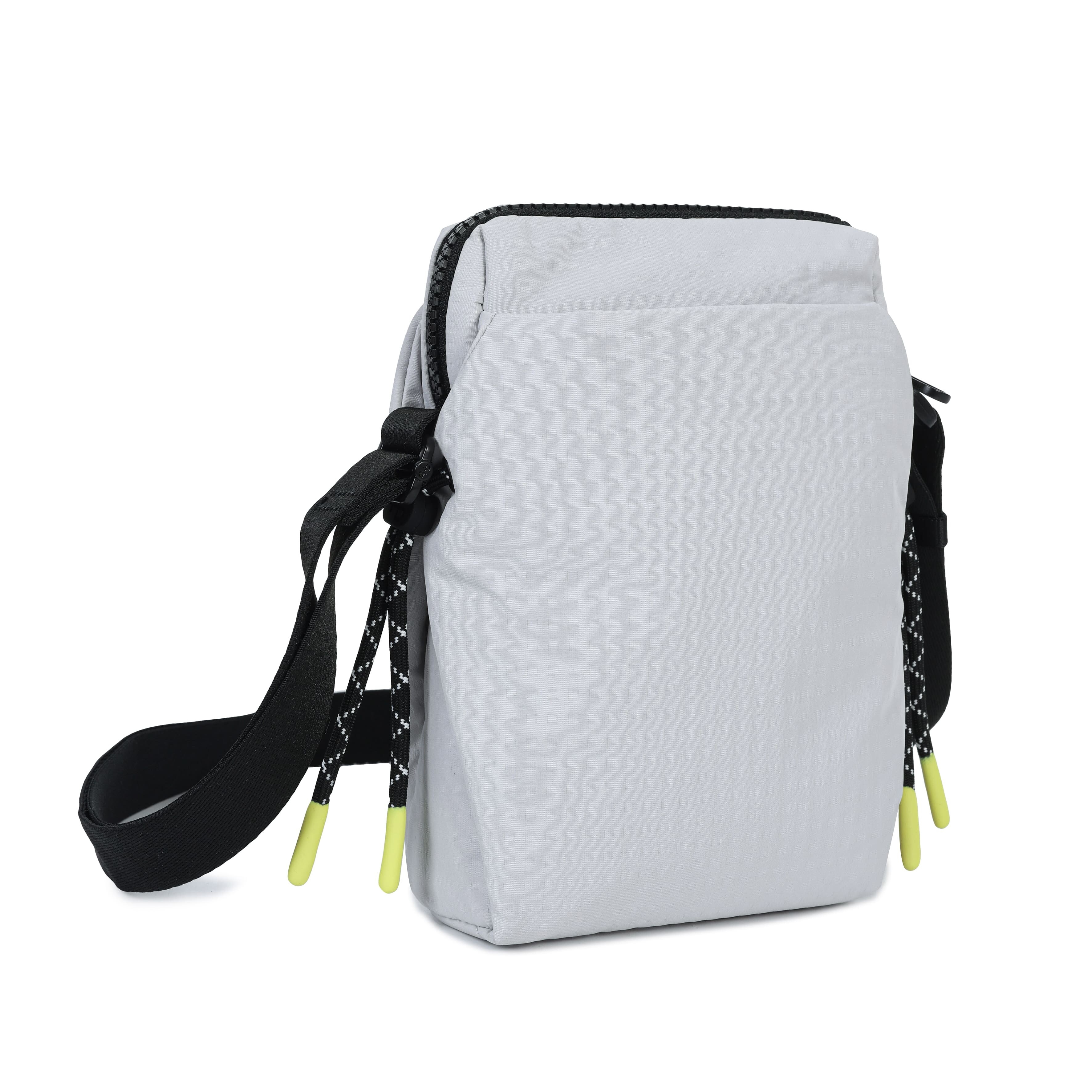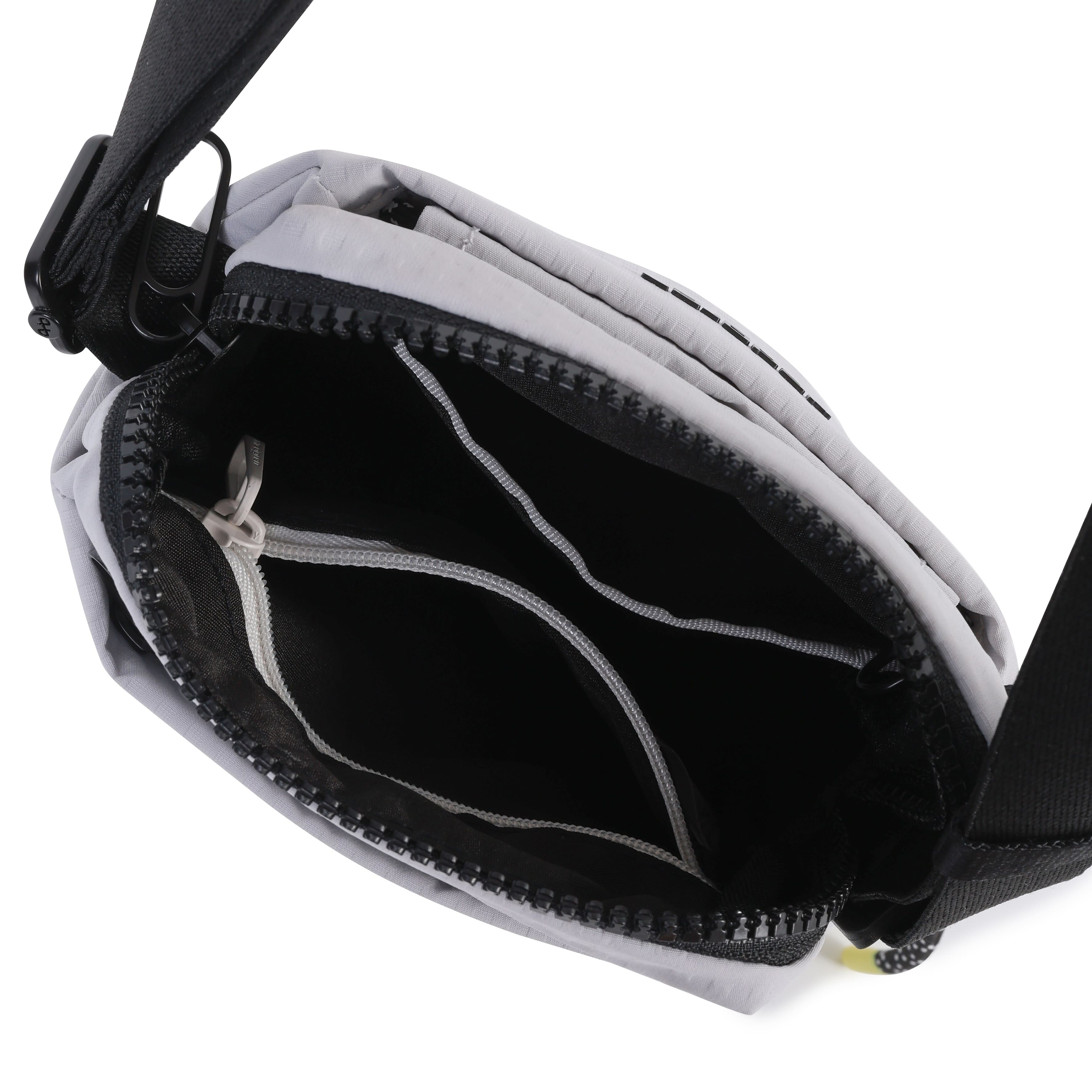 Зручна, компактна вертикальна сумка з розширенням, виготовлена з переробленої тканини. Оснащена основним відділенням на блискавці для сматфону, та дрібних речей першої необхідності. Зовні оснащена кишенями з обох боків, для невеликої парасольки та пляшки. Передбачено втоплену блискавку, на зовнішніх кишенях, яка щільно прилягає до тіла, як додатковий засіб безпеки. Також, за потребою сумка розширюється. Сумку можна носити через плече завдяки регульованому ременю.