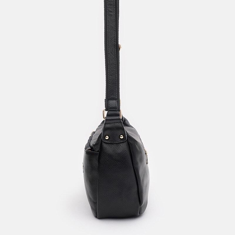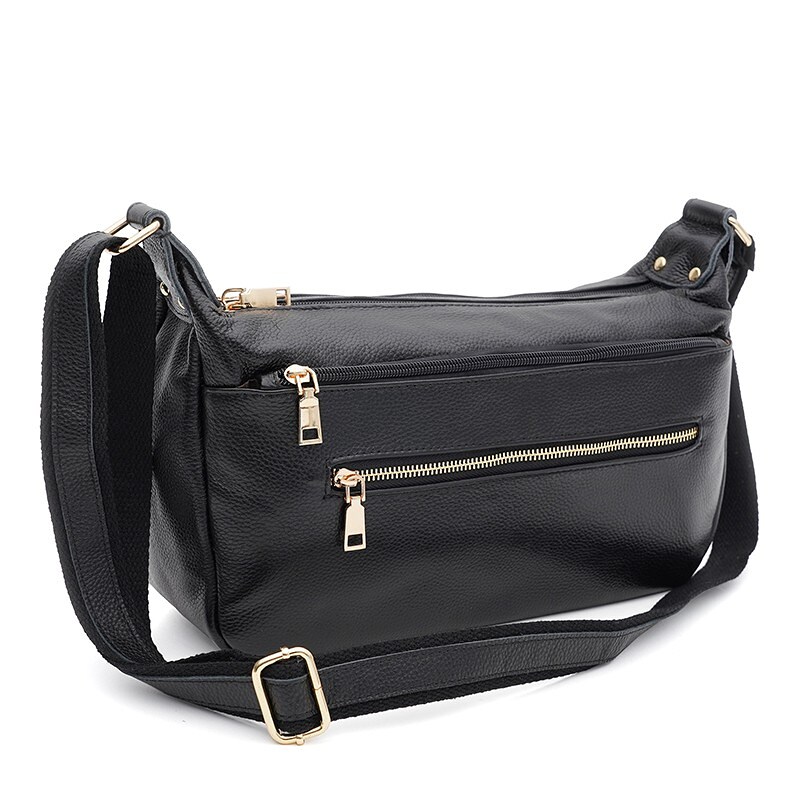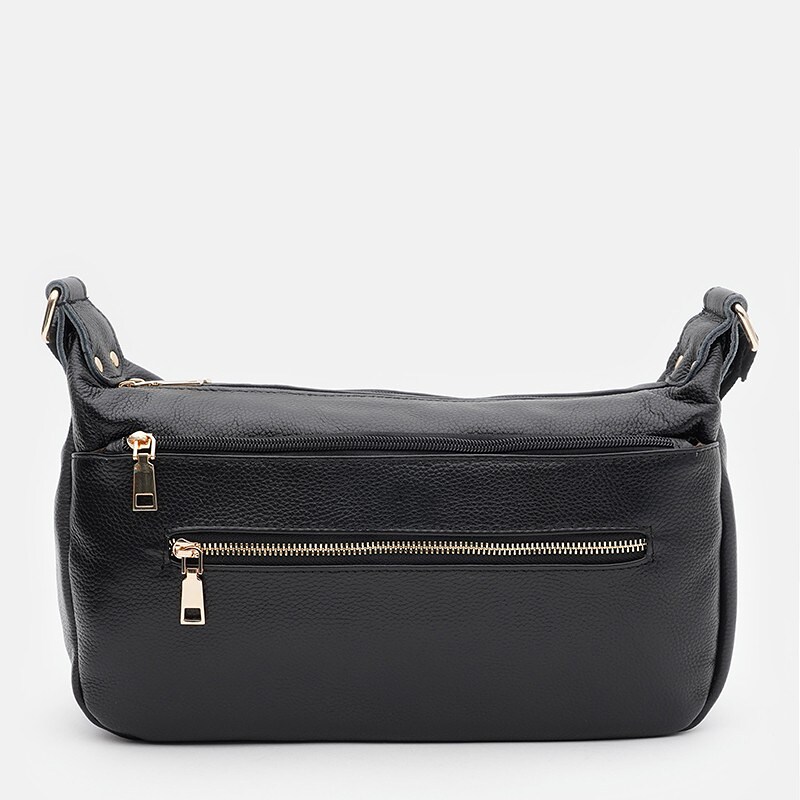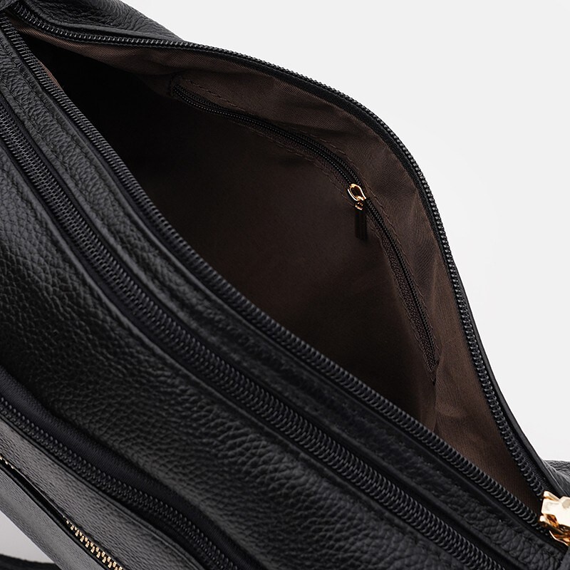 Жіноча шкіряна сумка закривається на блискавку. Два основні відділення на блискавках. Усередині є 2 кишені, одна з яких на блискавці. З зовнішнього боку 2 кишені на блискавці. Текстиль підкладка. Незнімний ремінь-текстиль+шкіра регулюється по довжині.
