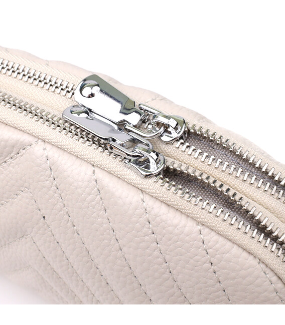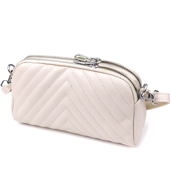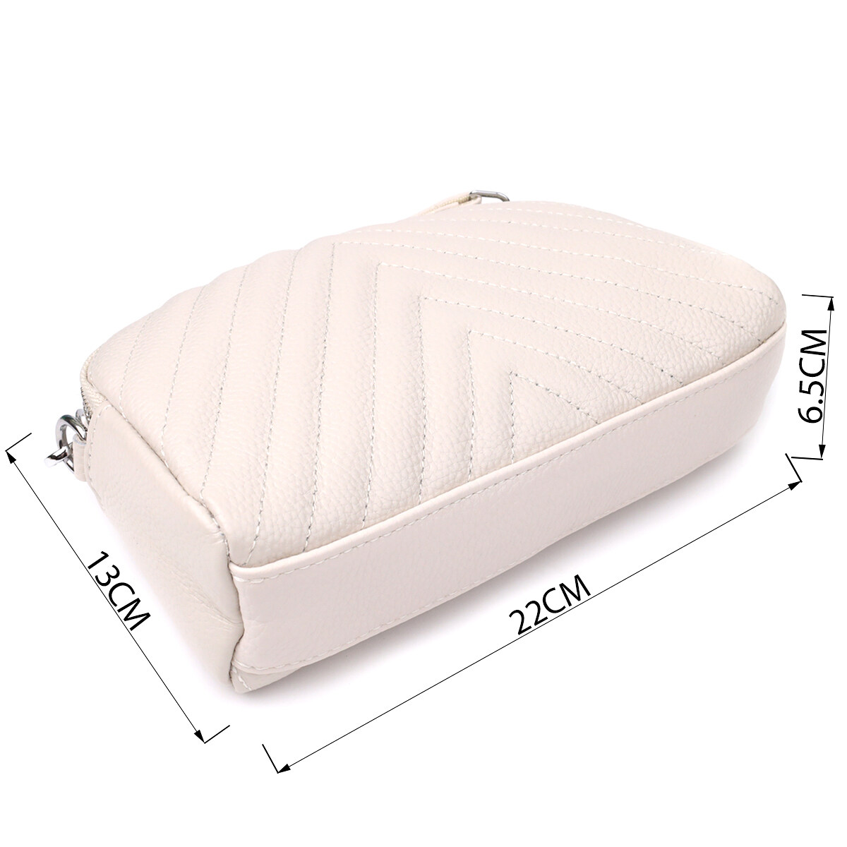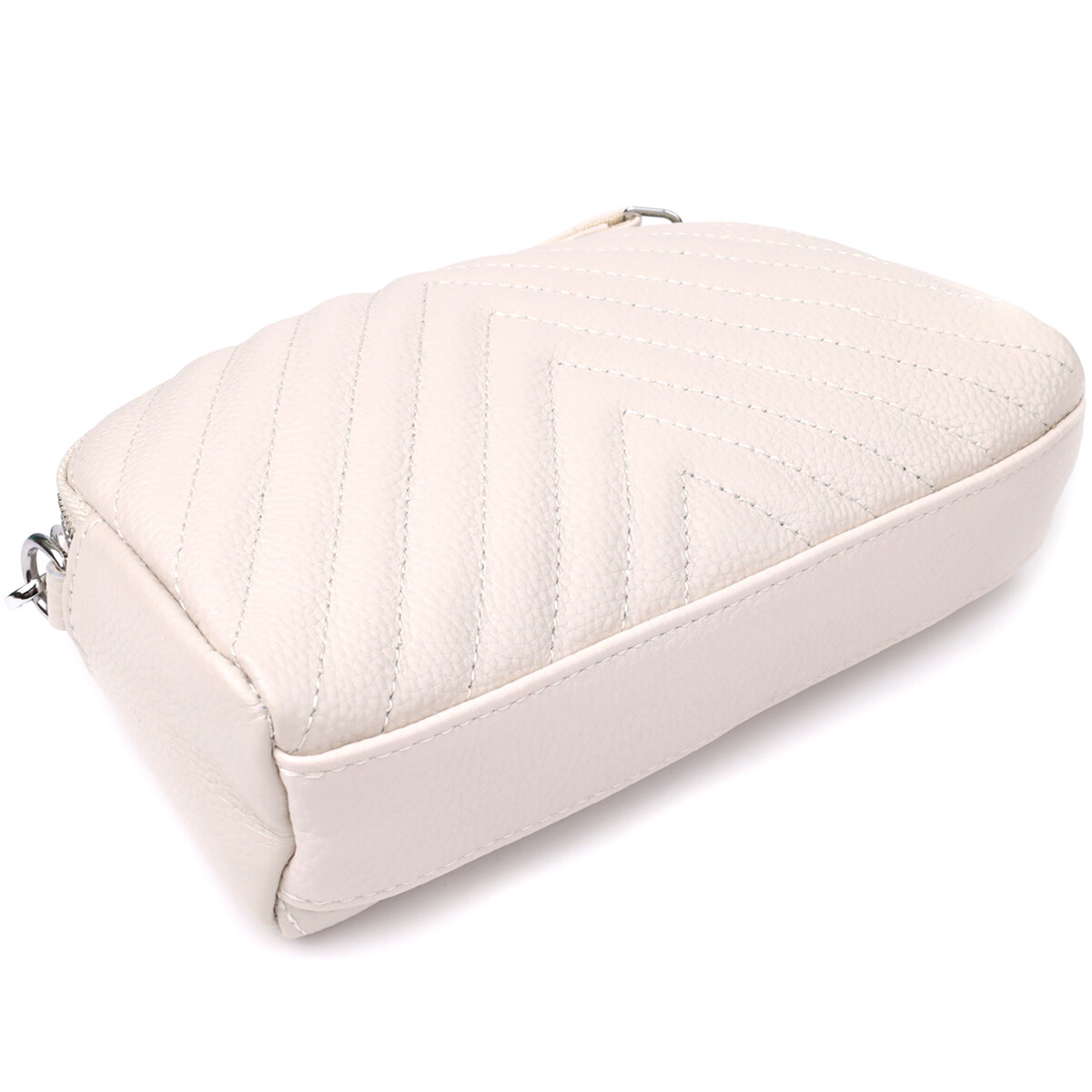 Біла шкіряна сумка з трикутним простроченням - це бездоганний вибір для тих, хто цінує легкість, стиль та увагу до деталей.