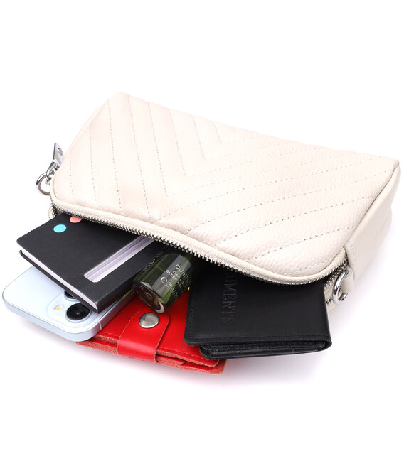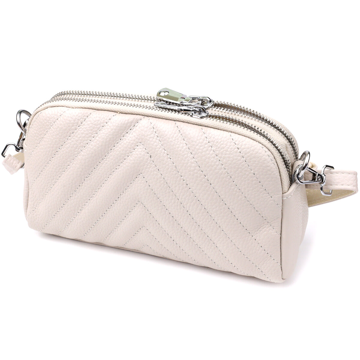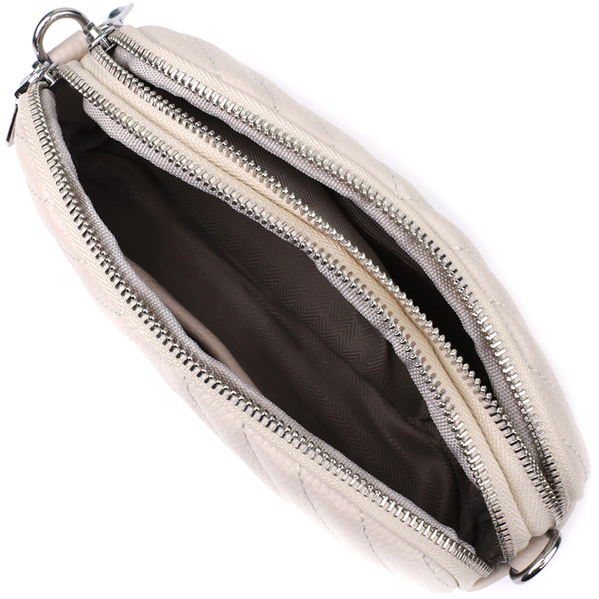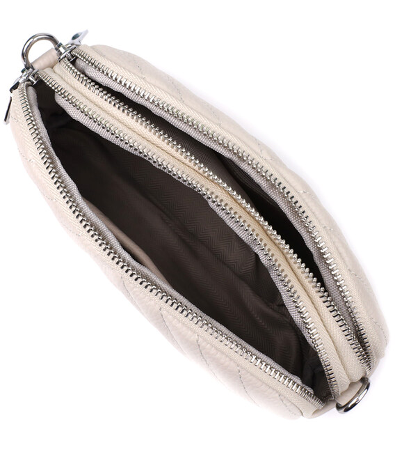 Біла шкіряна сумка з трикутним простроченням - це бездоганний вибір для тих, хто цінує легкість, стиль та увагу до деталей.