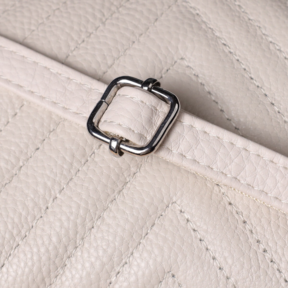 Срібляста фурнітура підкреслює чистоту та свіжість білого кольору, додаючи аксесуару благородного блиску. У комплект входить шкіряний ремінь, що знімається, за допомогою якого сумку можна носити на плечі або через плече, адаптуючи її під образ і ситуацію.