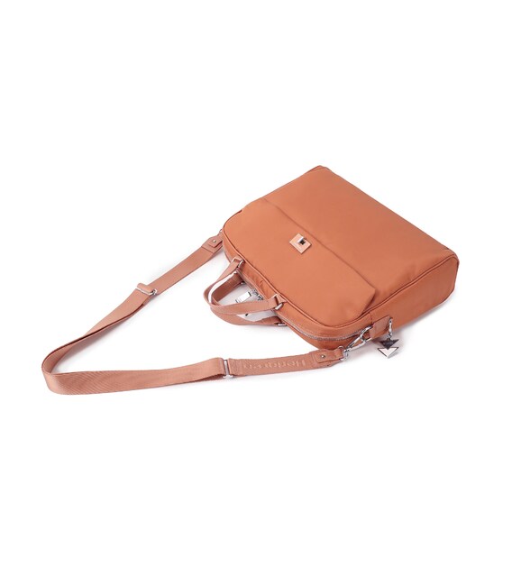Жіноча ділова сумка, оснащена зовнішньою кишенею на клапані з карабіном для ключів, містким основним відділенням на блискавці де розміщений міні-офіс, кишеня на блискавці з RFID-захистом, відділення для ноутбука 14" та документів формату А4. У комплекті знімний, регульований по довжині ремінь, для зручності перенесення Сумка виконана зі 100% переробленого поліестеру PET (поліефірна тканина з перероблених пластикових пляшок).