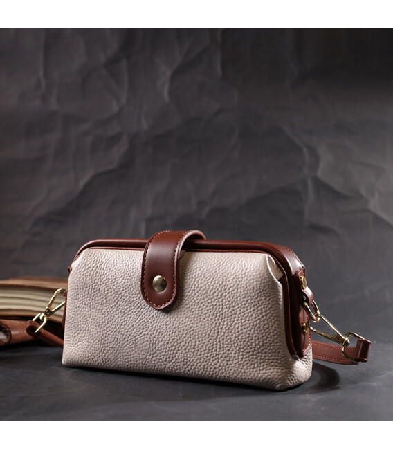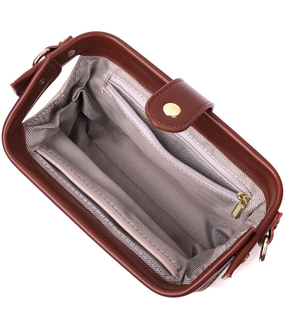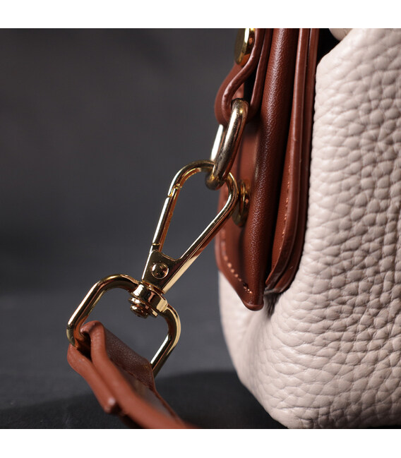 Сучасна жіноча сумка-клатч з незвичайною клямкою, яка однозначно приверне погляди оточуючих. Виріб пошитий з якісної натуральної шкіри, яка довго носиться і не втрачає свого первісного вигляду. Аксесуар складається з одного основного відділення всередині якого розташована кишеня відкритого типу та кишеня на блискавці. Носити сумку можна в руці як клатч, на плечі і через плече, для цього є шкіряний ремінь, що знімається. У виробі використано якісну фурнітуру кольору жовтого золота.