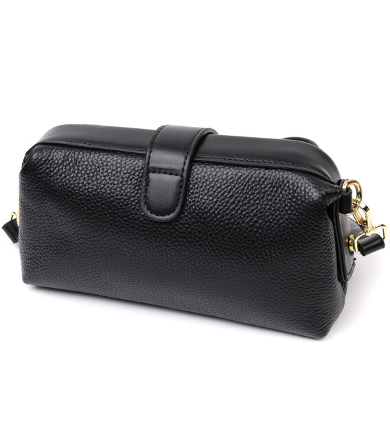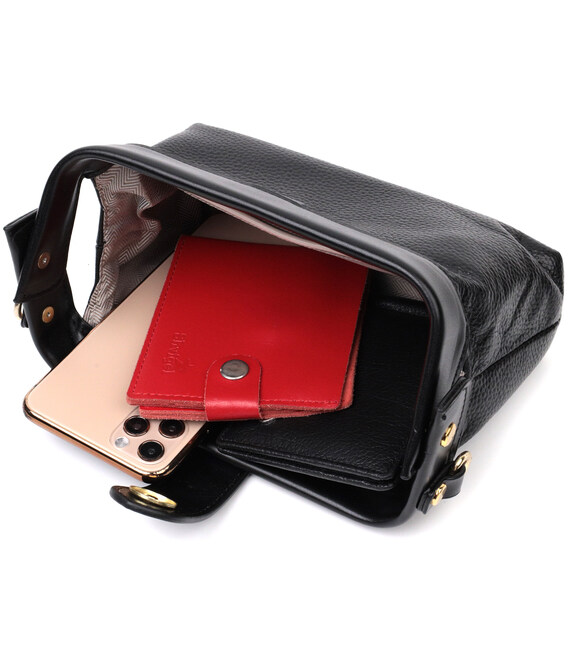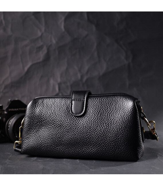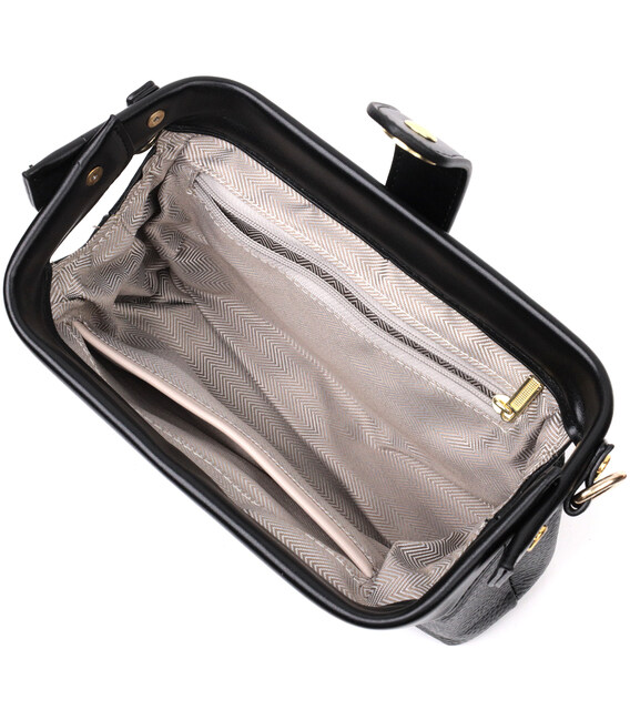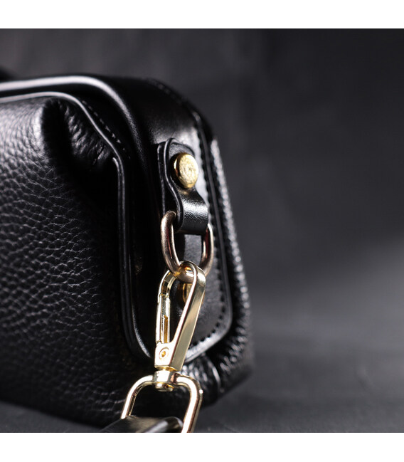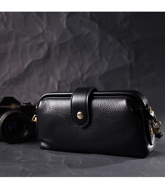 Жіноча сумка з незвичайною клямкою, яка однозначно приверне погляди оточуючих. Виріб пошитий з якісної натуральної шкіри, яка довго носиться і не втрачає свого первісного вигляду. Аксесуар складається з одного основного відділення всередині якого розташована кишеня відкритого типу та кишеня на блискавці. Носити сумку можна в руці як клатч, на плечі і через плече, для цього є шкіряний ремінь, що знімається. У виробі використано якісну фурнітуру кольору жовтого золота.