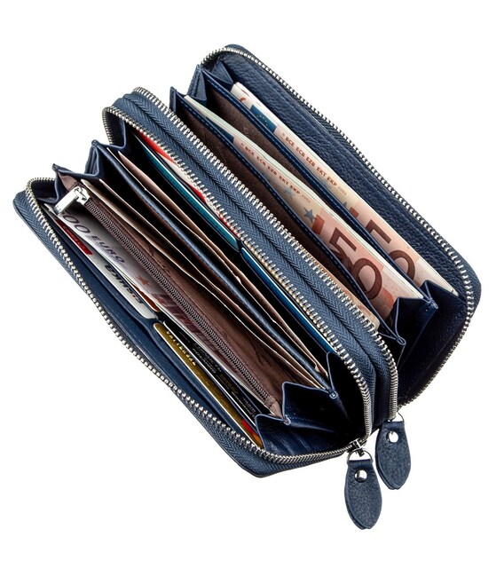 Жіночий клатч з високоякісної шкіри для ділових і впевнених у собі жінок. Має гарний і стильний дизайн, дуже місткий і практичний. Колір - синій з матовим відтінком. Має два абсолютно автономних відділення, які закриваються на масивну блискавку срібного кольору. Всередині є шість великих відділень на всю довжину гаманця, відділення на блискавці для цінних і дрібних речей, кишені для карток і візиток. Якщо Ви захочете носити клатч окремо, а не в сумці, то для цих цілей передбачений спеціальний ремінець на зап'ястя. Упакований гаманець в білу картонну коробку з логотипом виробника.