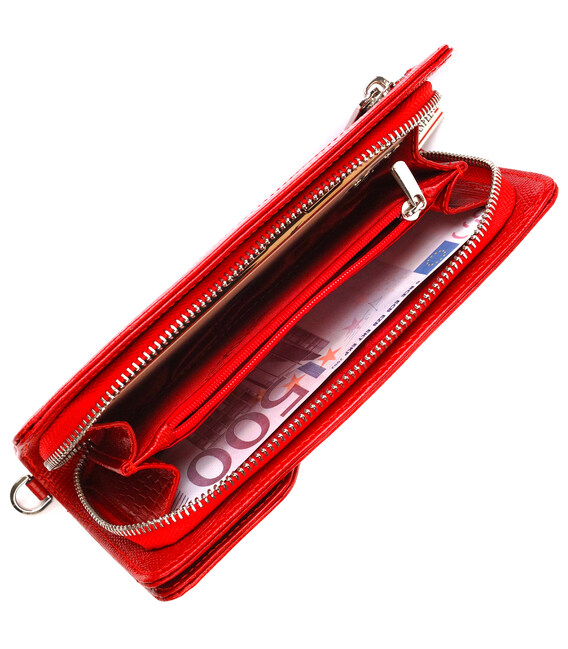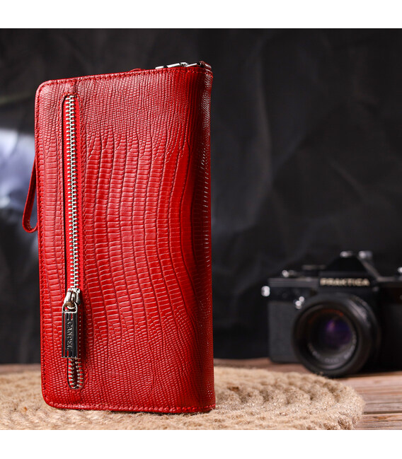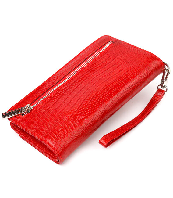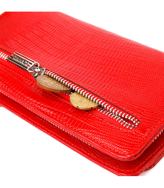 Яскравий жіночий гаманець-клатч, з натуральної фактурної шкіри, з тисненням під рептилію. Аксесуар має одне основне відділення, в яке поміщаються купюри всіх номіналів, дванадцять кишень для карток, одна з яких під сіточкою, блок для карт із зовнішнього боку, дві кишеньки на блискавці, знімний кистьовий ремінь. Закривається аксесуар на блискавку, а блок для карток закривається на кнопки. Колір фурнітури – срібло. Шкіряний гаманець є дивовижним подарунком для дружини, дівчини, подруги.
