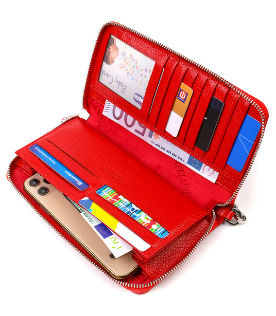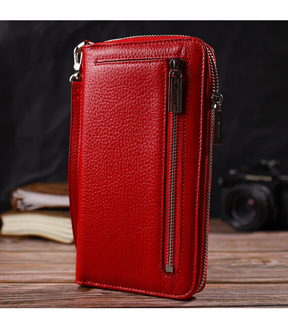 Чудовий клатч для ділової та стильної жінки з натуральної шкіри. Аксесуар має велике відділення для купюр, 15 осередків для карток (один під сіточкою), кишеню-перегородку на блискавці, три прилеглі кишені, кишеню з розширювачем на блискавці зовні та тримач для ручки. Носити цю модель зручно в руці або за допомогою знімного кистьового ременя. Закривається аксесуар на блискавку. Купуючи шкіряний аксесуар цієї фірми собі або на подарунок, будьте певні, що він радуватиме око не один рік.