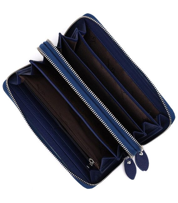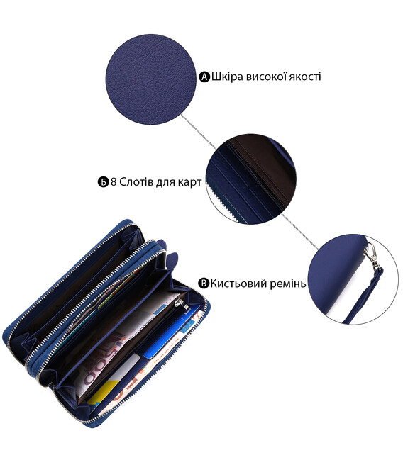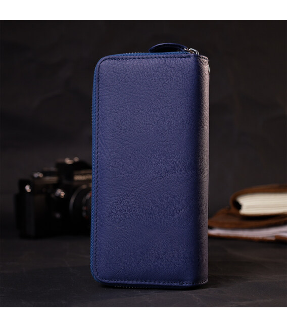 Виріб виконаний із добротної натуральної шкіри з м’якою зернистою фактурою у синьому кольорі. Матеріал приємний на дотик, виглядає ефектно і добре підходить для щоденного використання. Кожне відділення закривається на металеву блискавку срібного кольору, що робить гаманець зручним і надійним у користуванні.