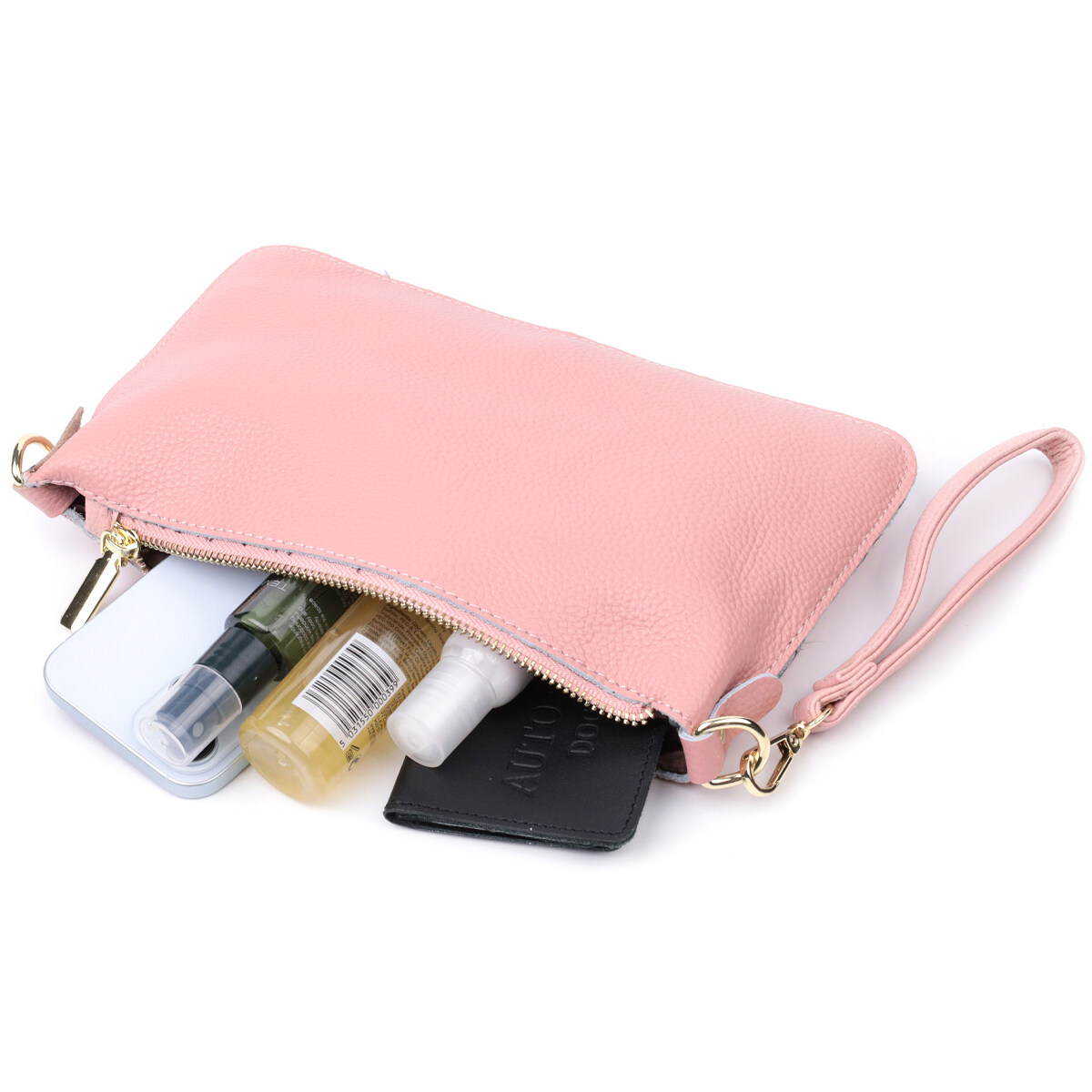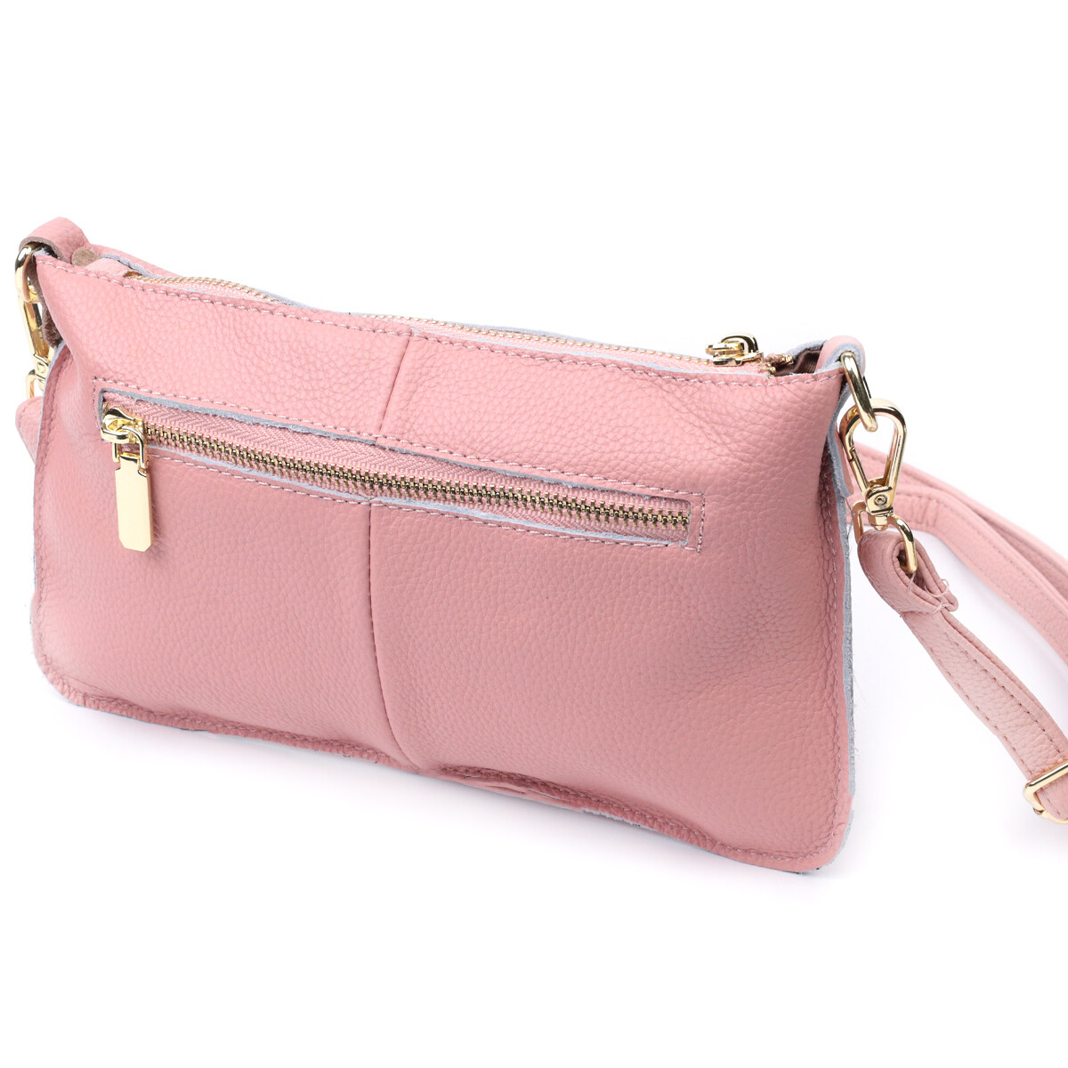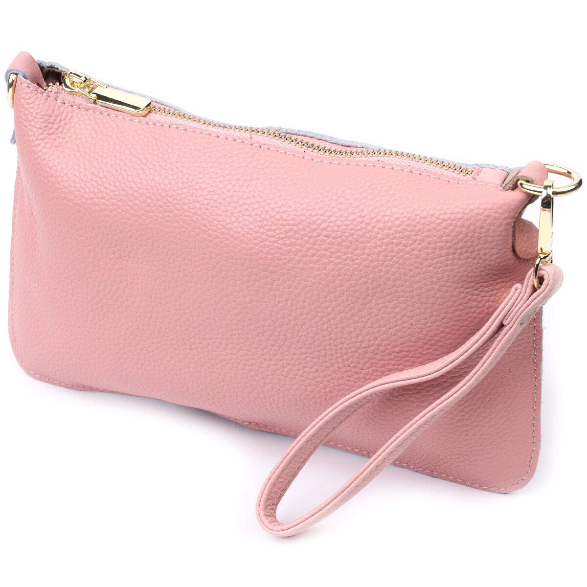 Яскрава жіноча функціональна сумка-клатч із натуральної шкіри. Аксесуар складається з основного відділення, що закривається на блискавку, кишені-перегородки на блискавці всередині та кишені на блискавці на тильній стороні, зовні. Носити сумку можна на плечі і через плече, також можна носити як клатч під рукою і на кисті, для цього є довгий ремінець, що знімається, а також знімний кистьовий ремінь.